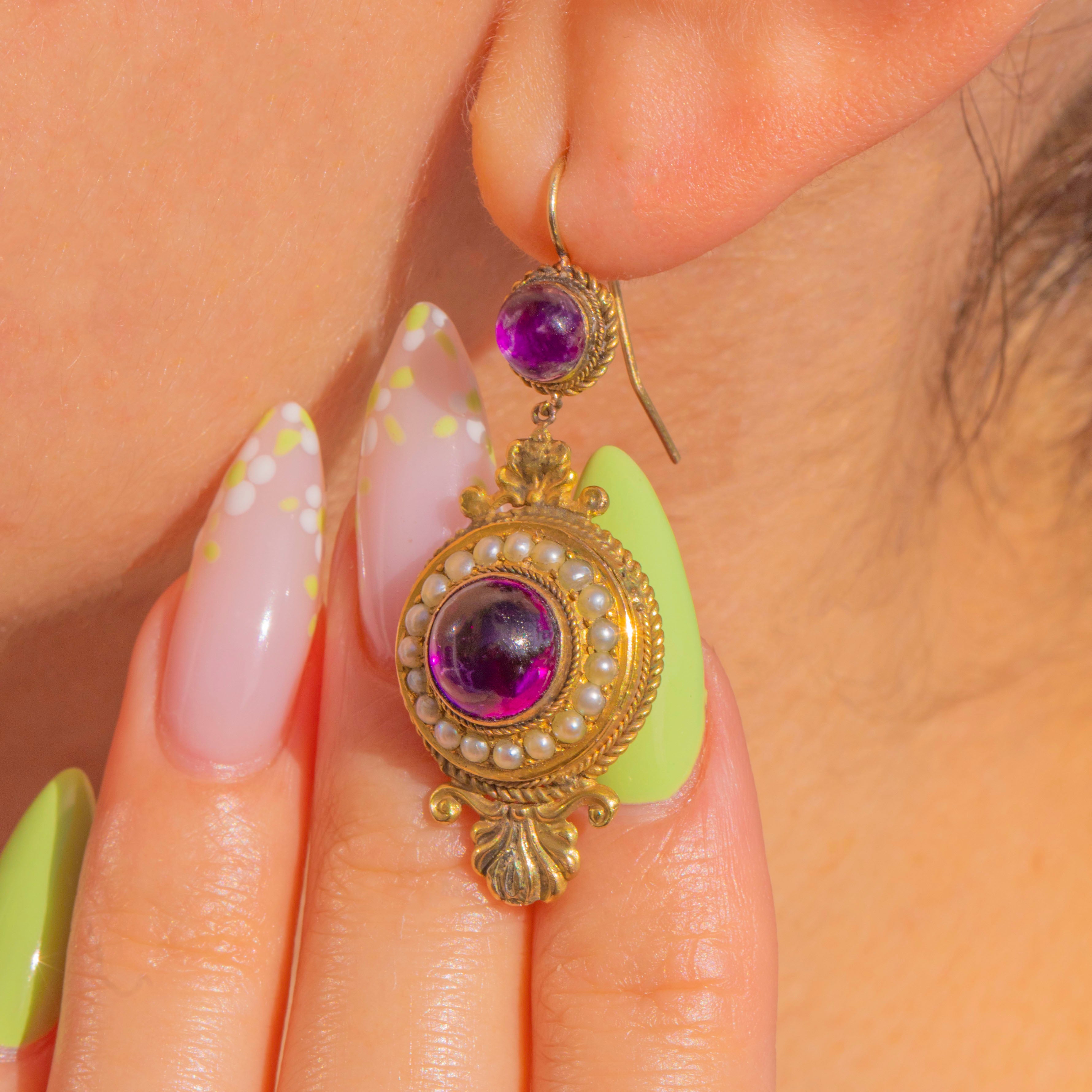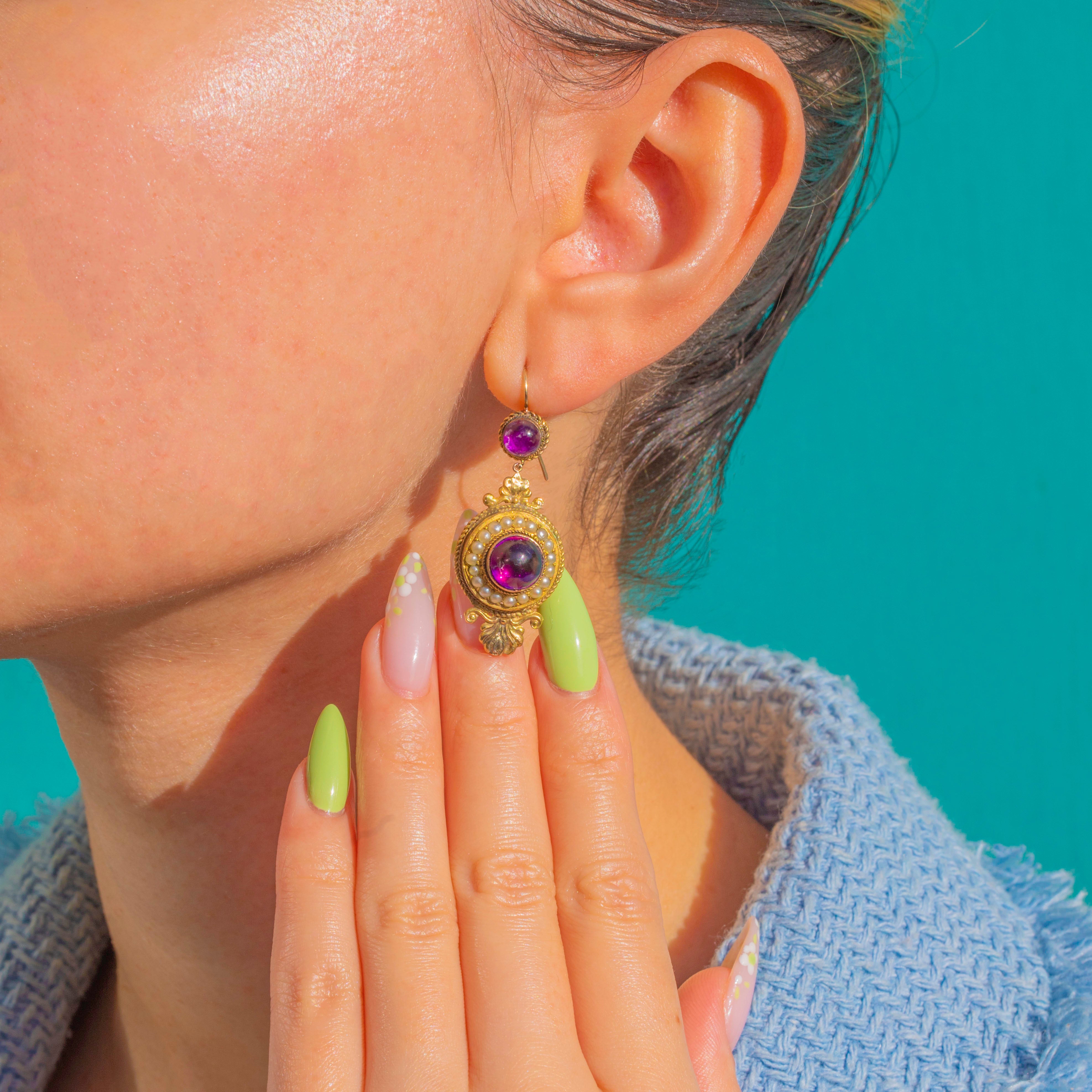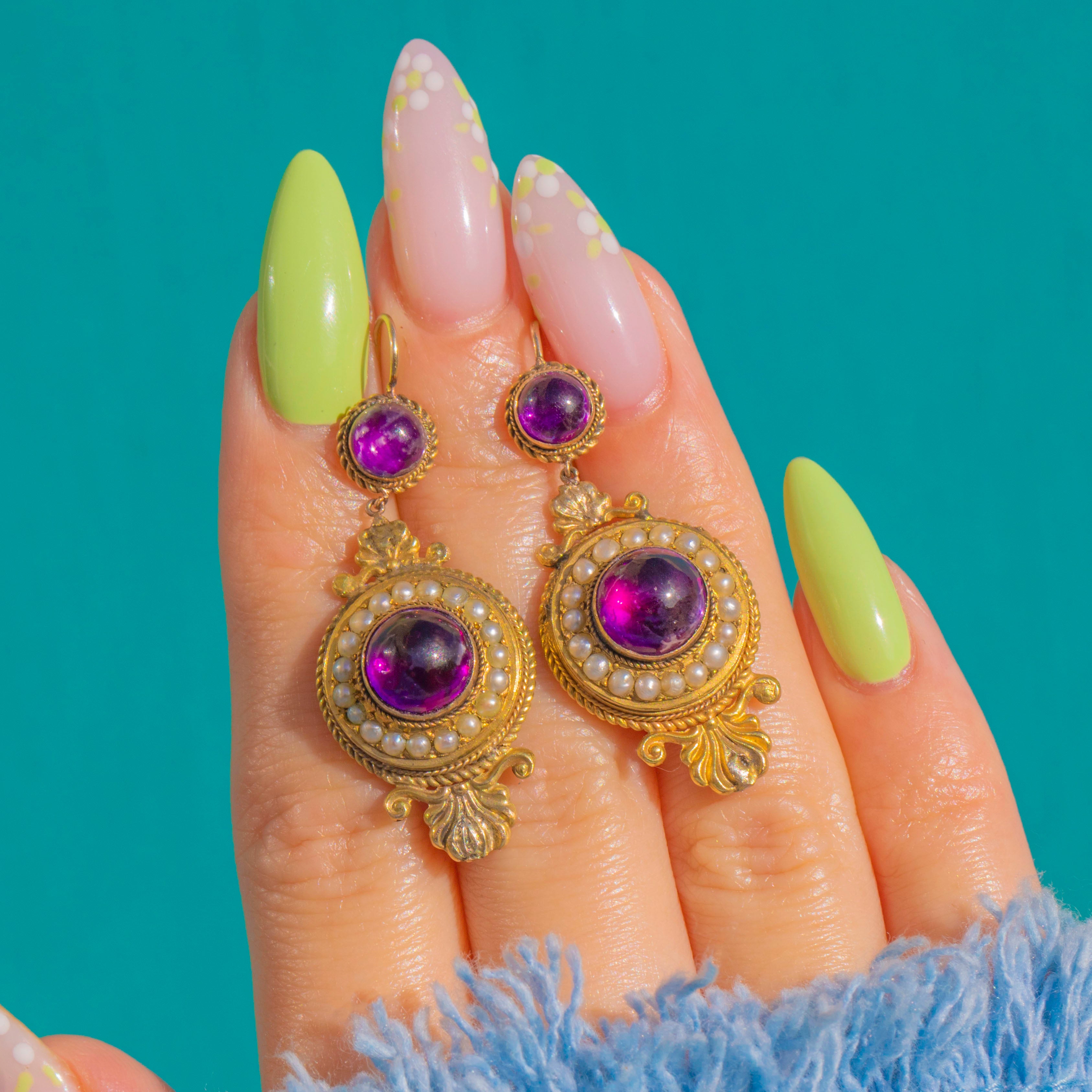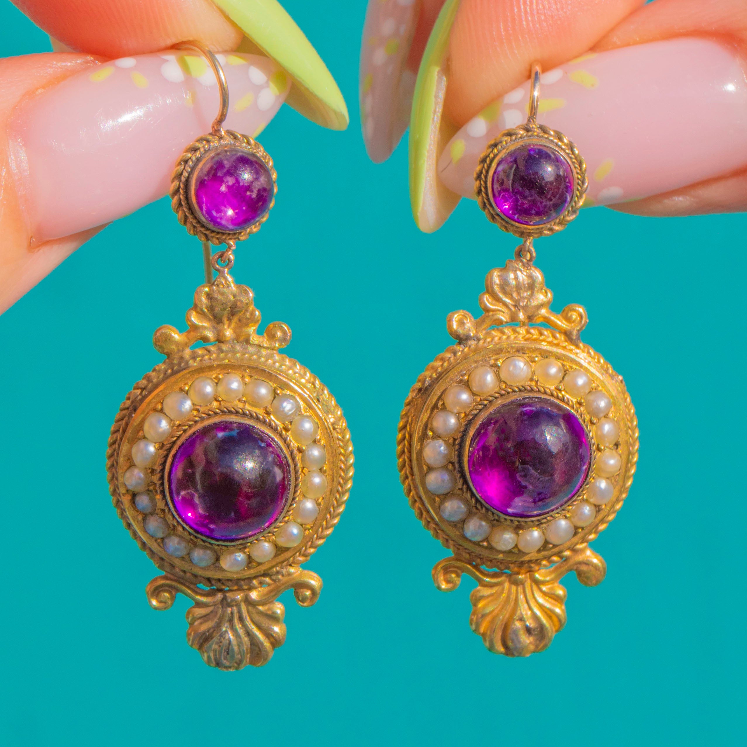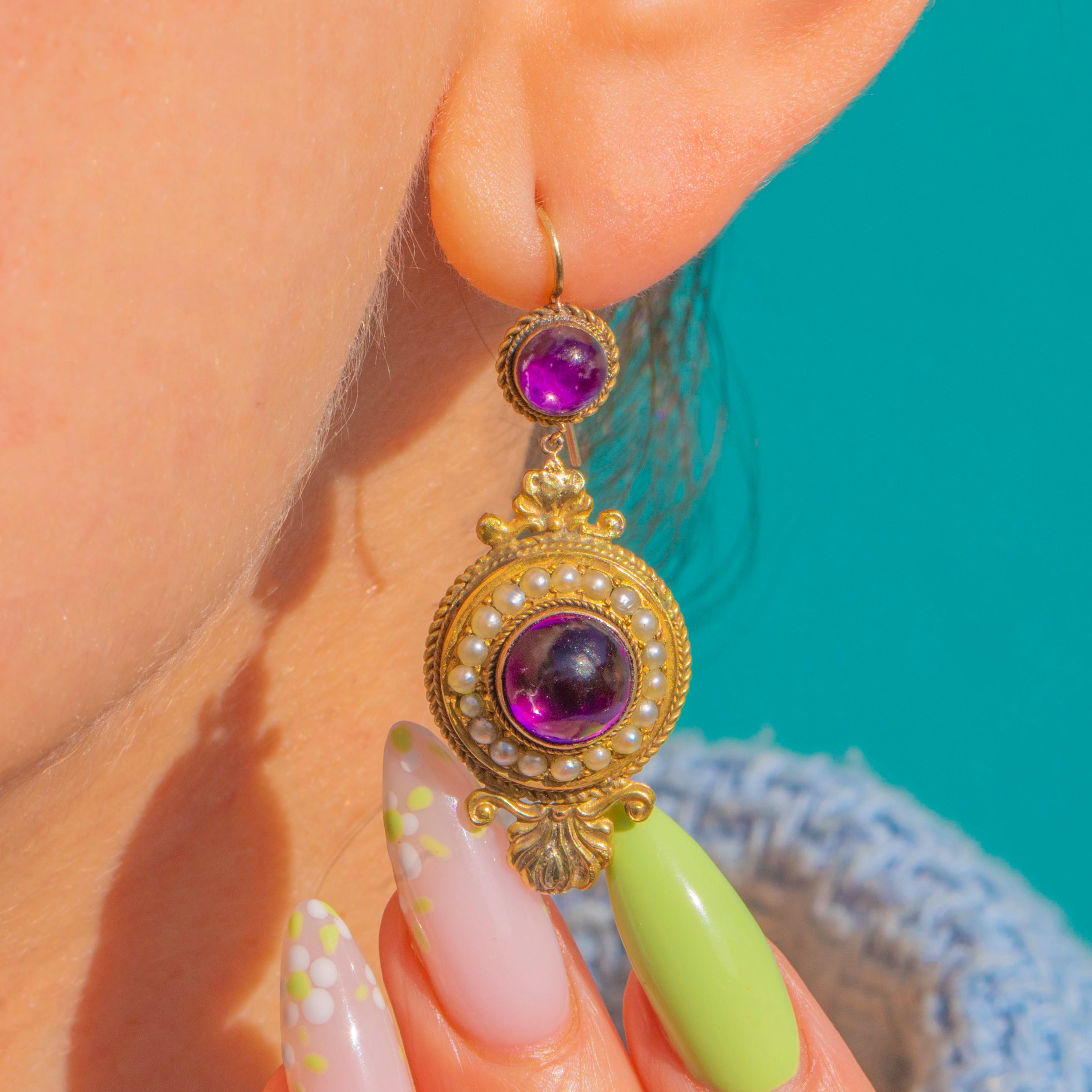 The design balances a smaller round cabochon above a larger round cabochon below, united by a slender link for beautiful movement. The Amethysts total approximately 5.00ct combined, their colour amplified by traditional foil-backing, with the Pearls bringing a delicate, luminescent contrast. Finished with classic shepherd-hook fittings, they’re a quintessential Etruscan Revival treasure—ornate, feminine, and endlessly wearable.