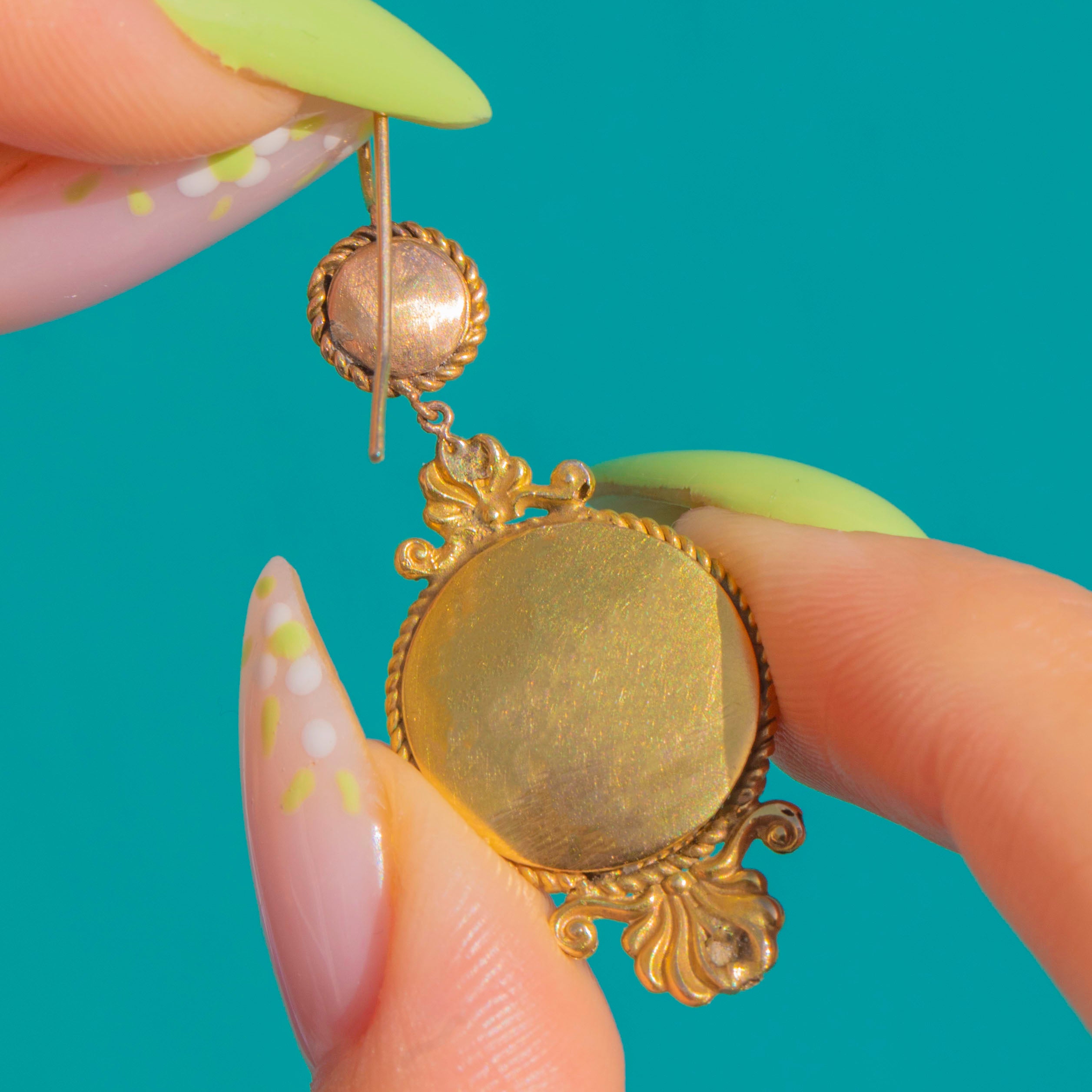 Opulent and romantic, these Victorian Etruscan Revival drop earrings embody the era’s love of texture and ornament. Crafted in bloomed 15ct Gold, each articulated two-part drop centres a rich purple foiled Amethyst that glows with life, framed by a close halo of creamy Seed Pearls. Rope-twist bezels and foliate scroll terminals add that unmistakable 19th-century flourish, while the articulation lends a graceful, lively sway on the ear.