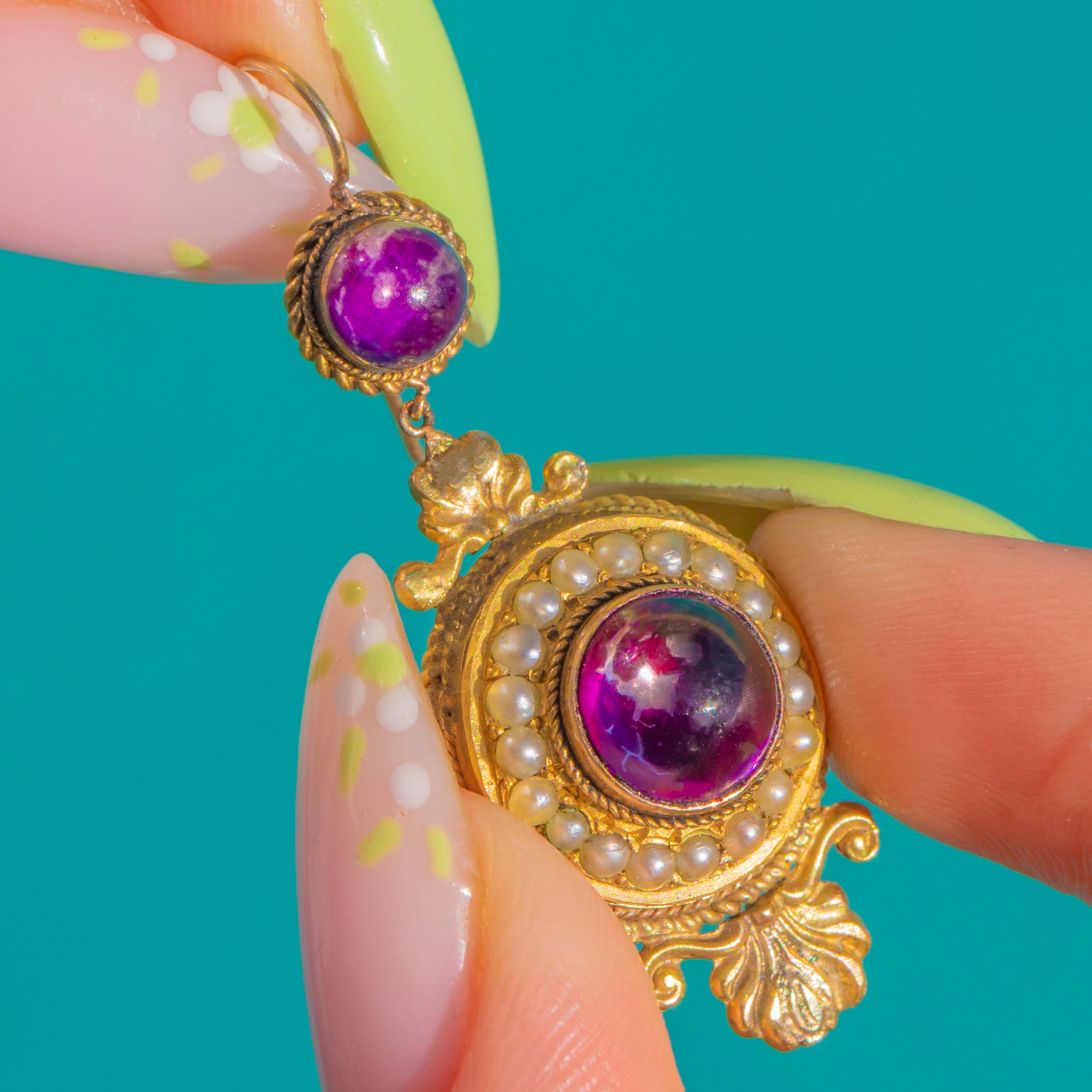 Victorian 15ct Gold Foiled Amethyst Pearl Earrings c.1870
