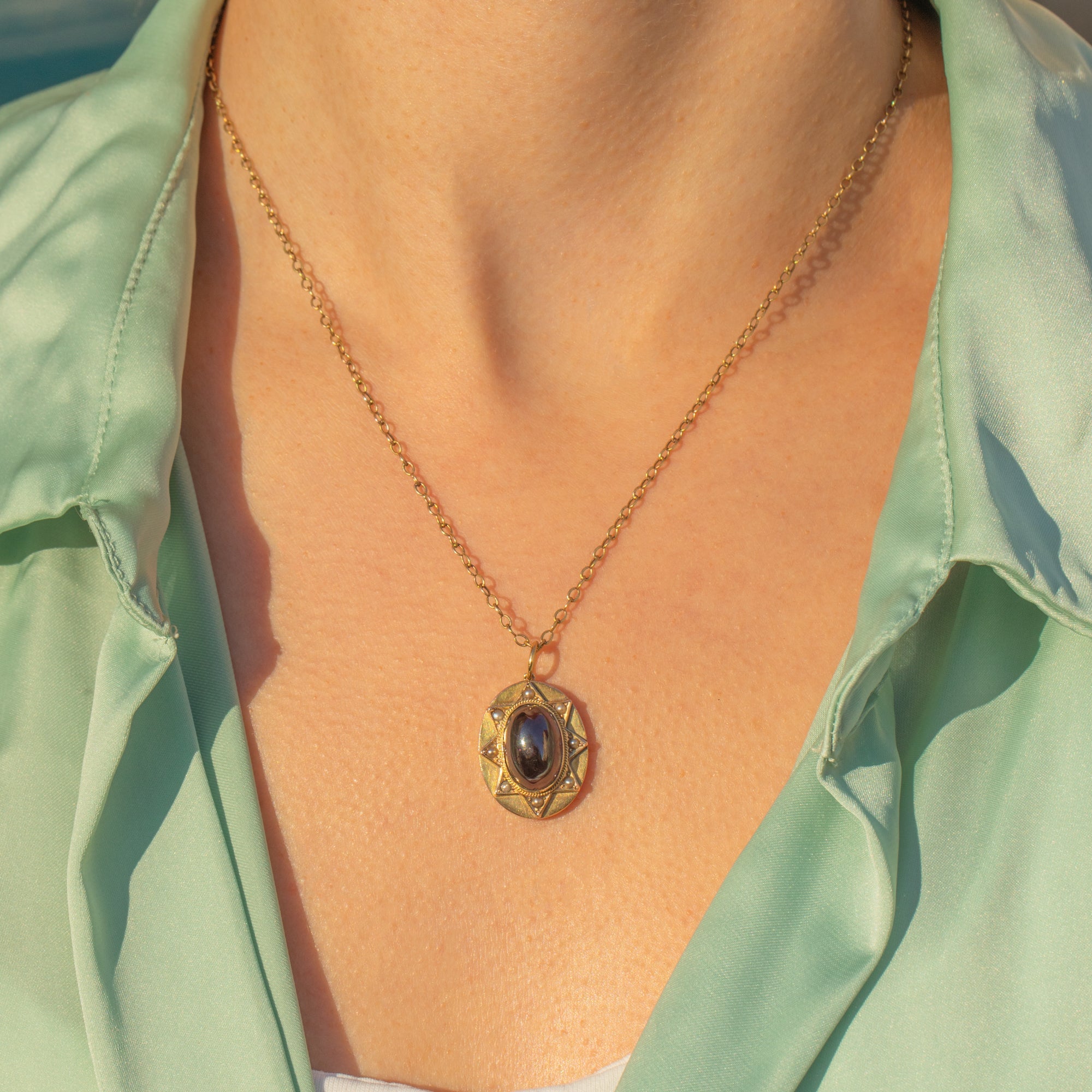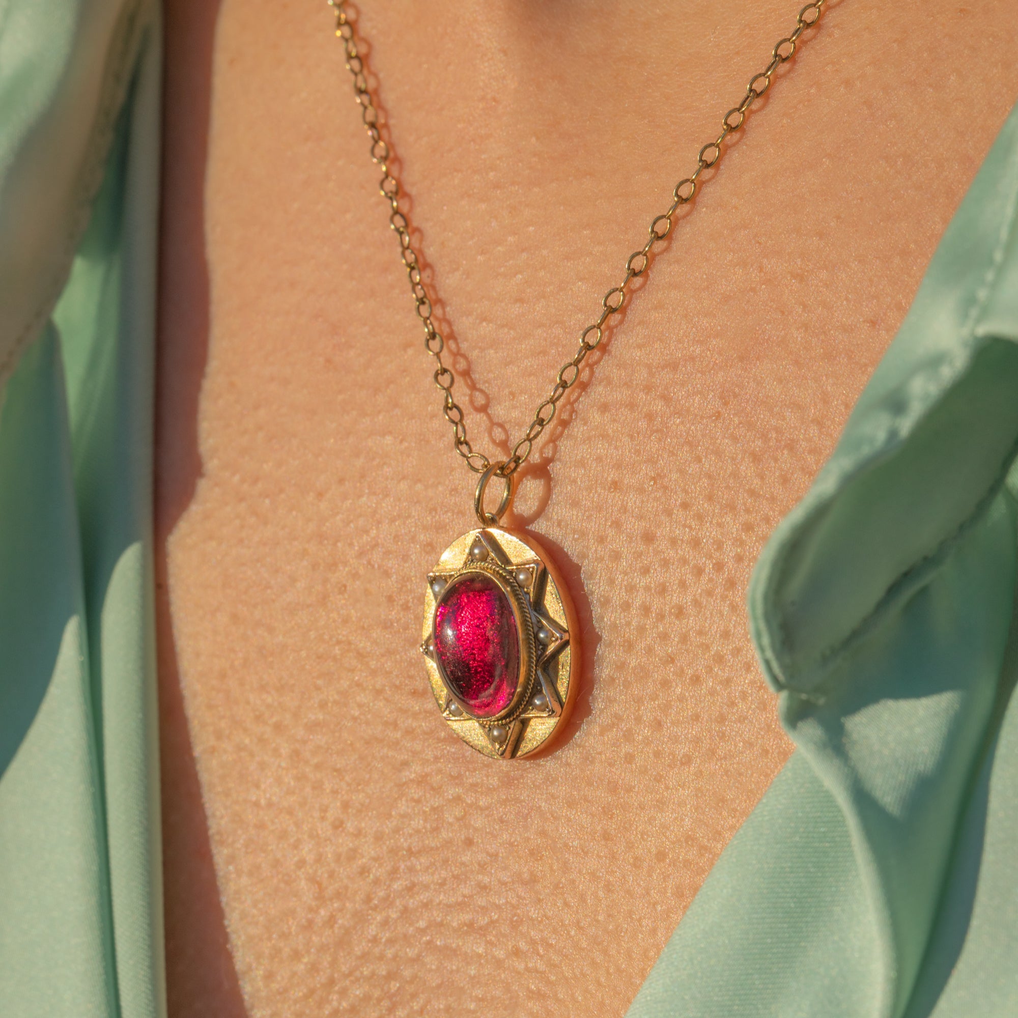 This Victorian 15ct Gold Garnet and Pearl star pendant is a wonderfully rich and romantic piece of antique jewellery. Set with a deep wine-red Garnet cabochon at the centre and framed by a celestial star of tiny Pearls, it has all the warmth and charm we love from late 19th-century design.