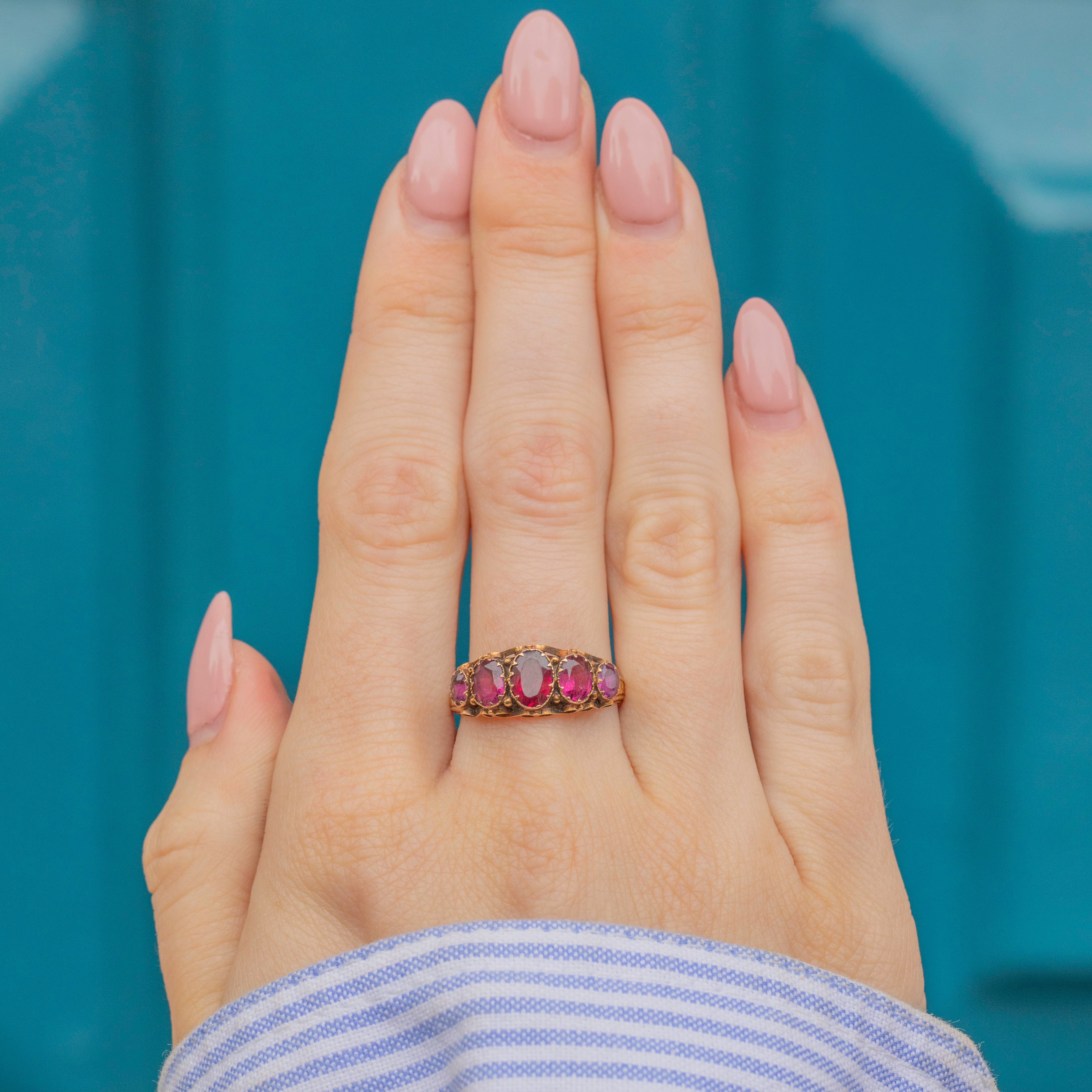 This exquisite Victorian 15ct Gold Garnet five stone ring will bring a touch of enchantment to your curated ring stack! Crafted from rare 15ct Gold, this antique ring is set with five juicy Garnets that reveal blushed hues as they glimmer beneath the light.