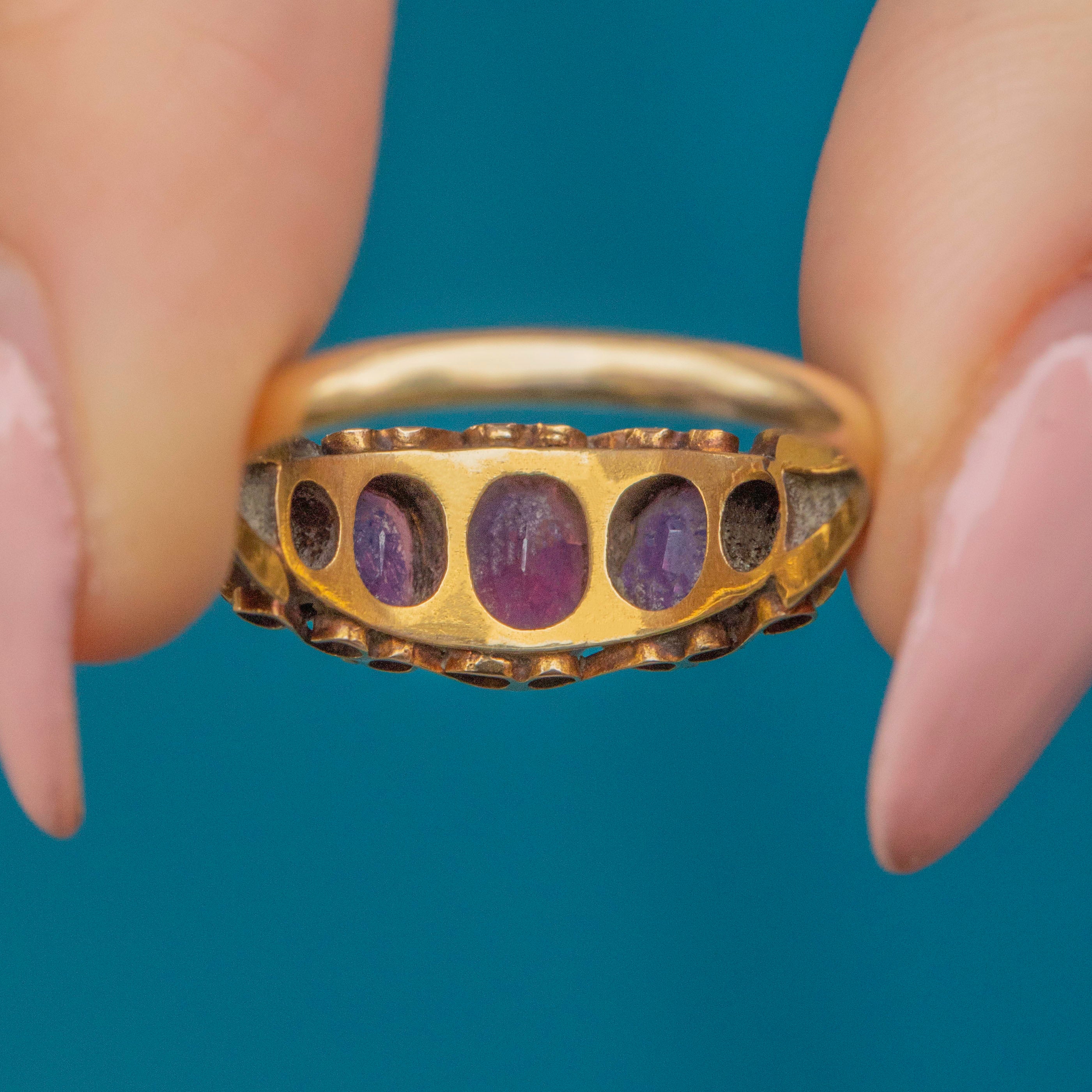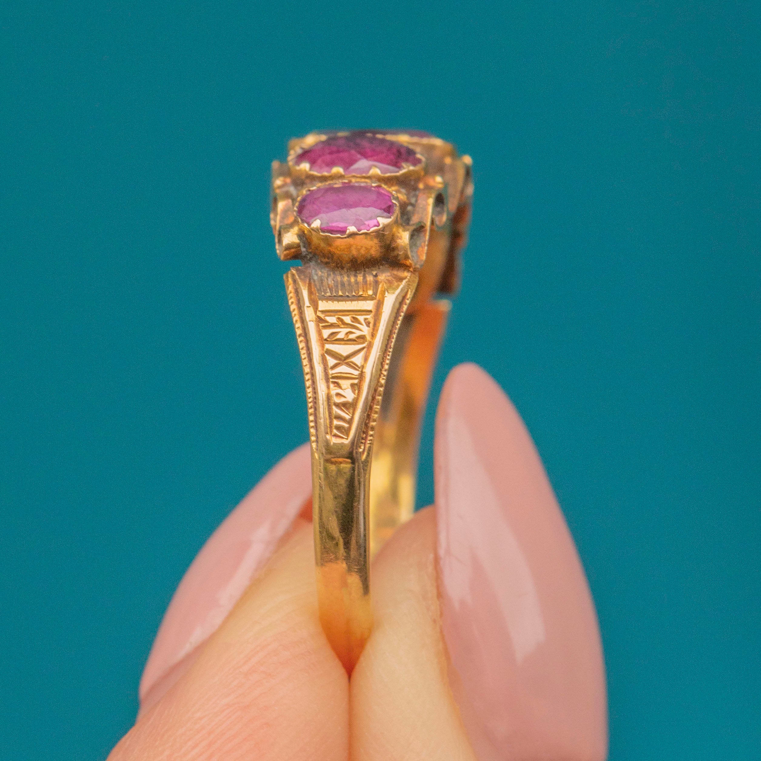VERY GOOD. This Victorian 15ct Gold Garnet five stone ring is in very good condition. The Garnets are all original to the piece and are securely set with only some minor nibbles noticeable under close inspection. The Gold is saturated and the ornate details are crisp. There is some minor age-related wear to the band, but this does not affect the overall impact of this striking piece. The hallmarks are still fully legible, allowing us to accurately date this antique Garnet ring to 1875.