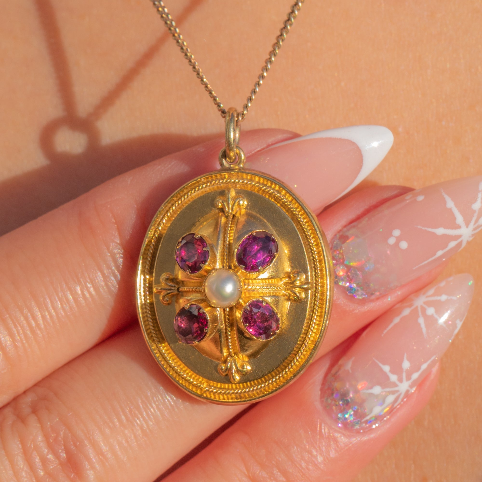 This glorious Victorian Garnet and Pearl pendant is a beautiful example of high Victorian design. Crafted in sumptuous 15ct Gold, the front is set with four vivid purple Garnets arranged in a cross motif around a single luminous Pearl, framed by fine textured Gold details.