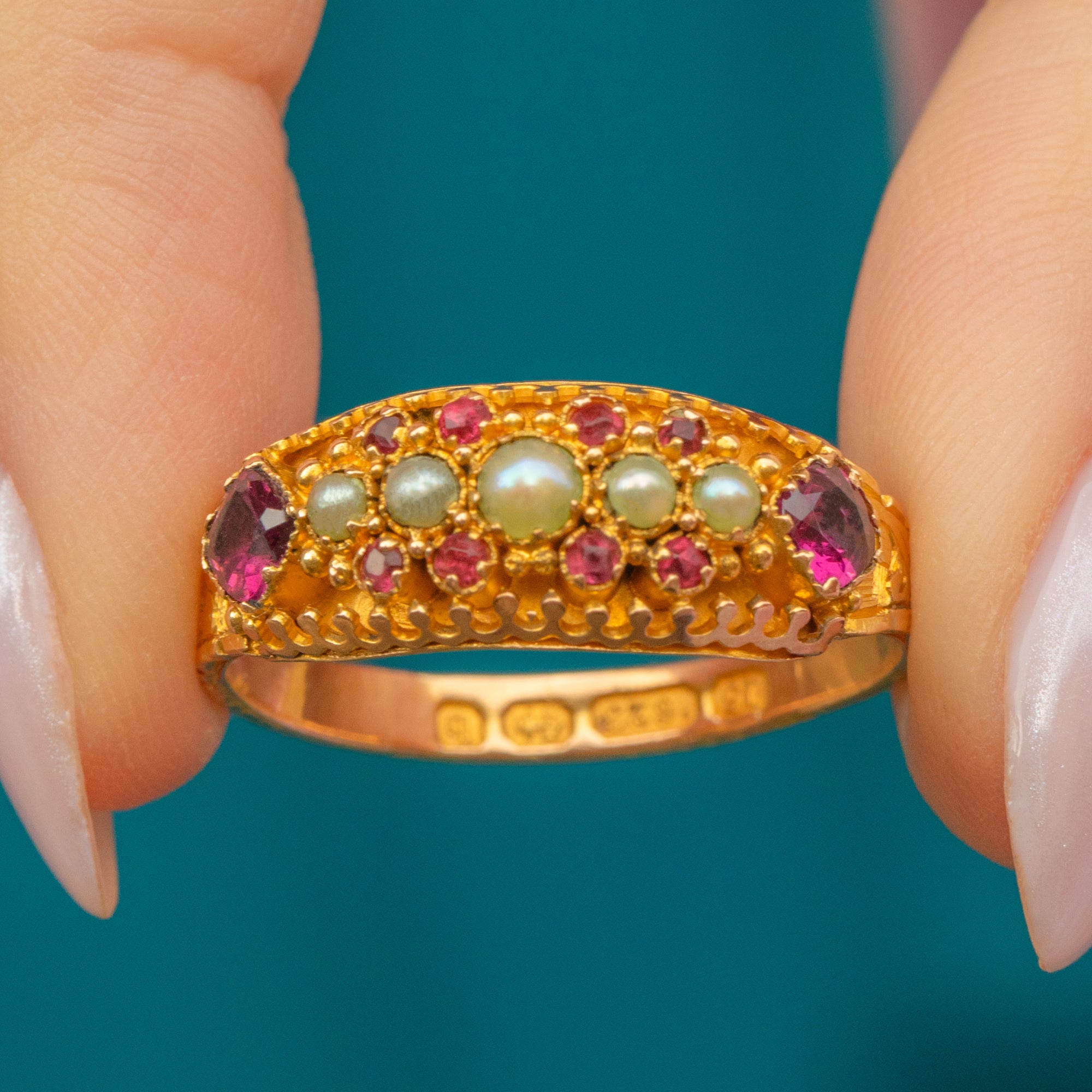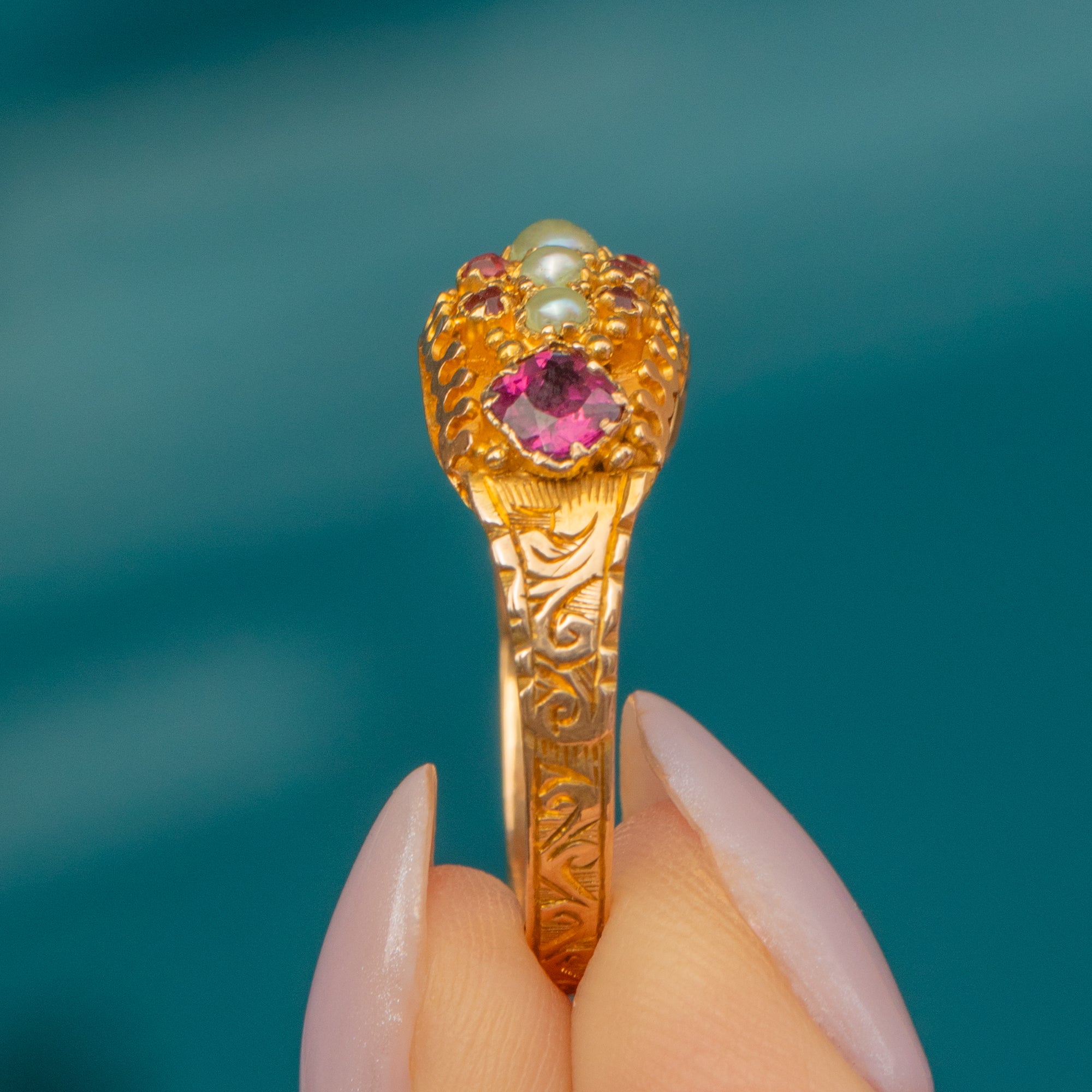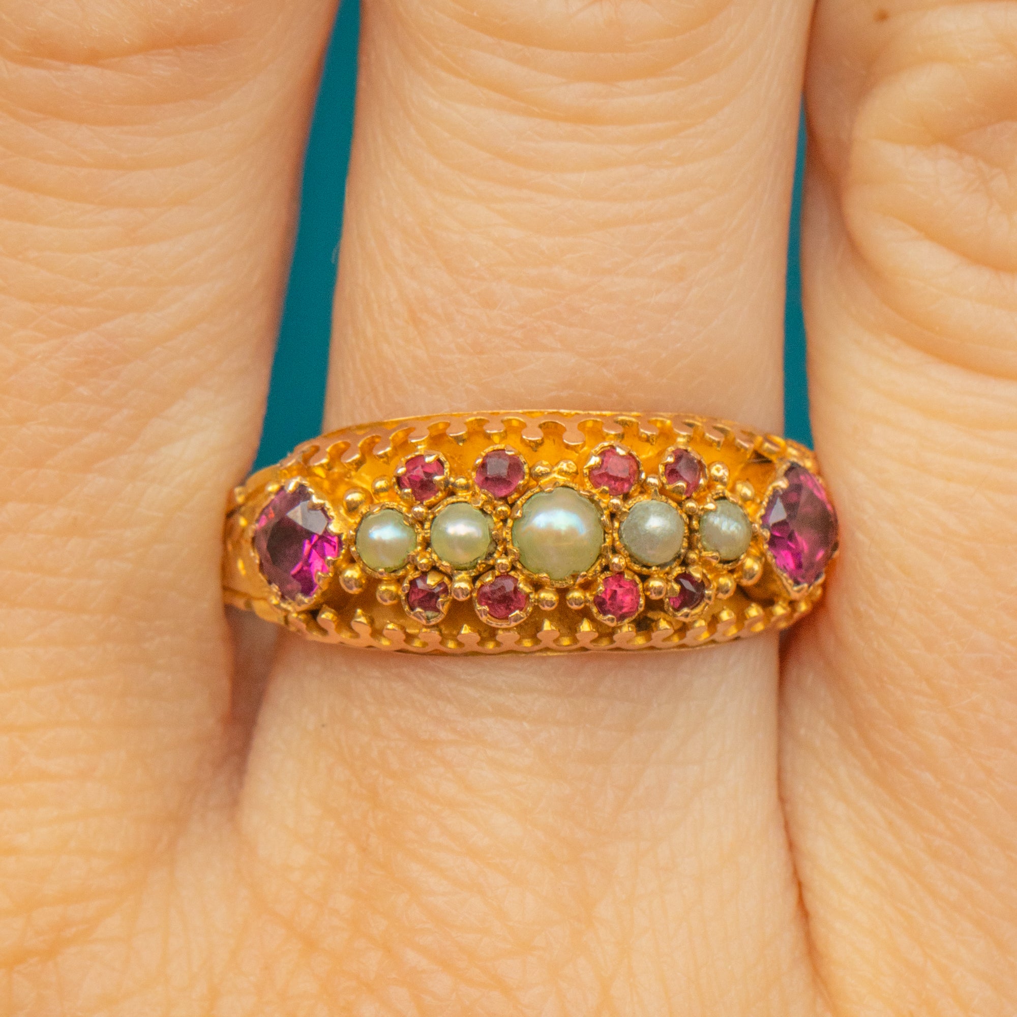 Victorian 15ct Gold Garnet Pearl Ring, c.1876