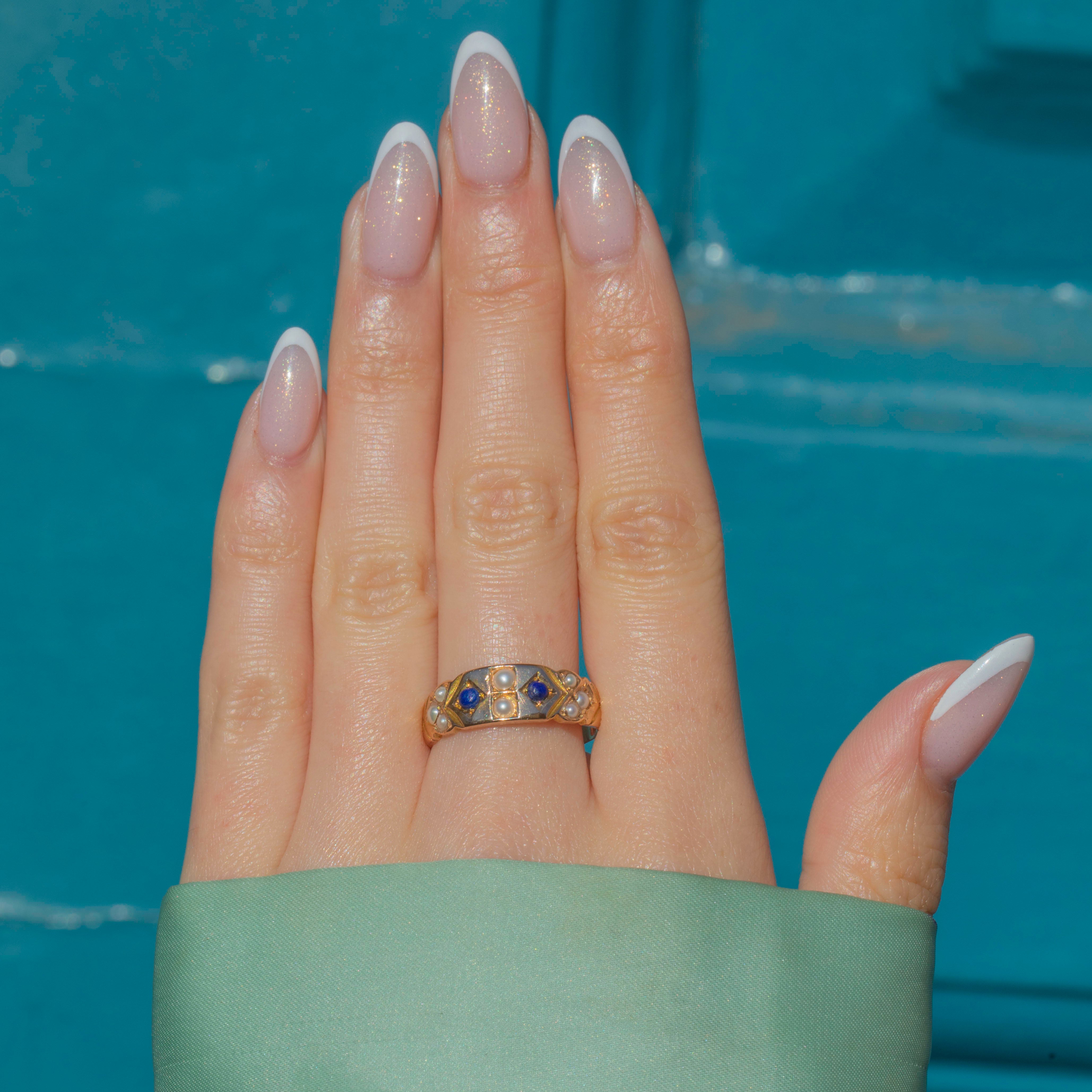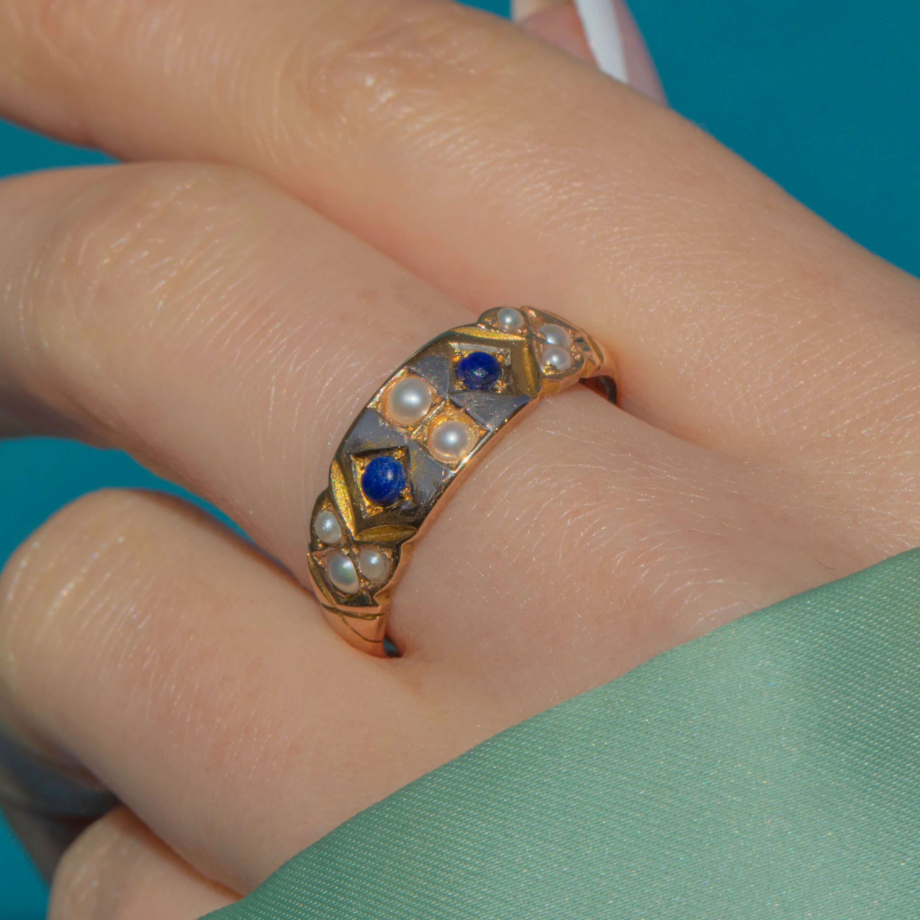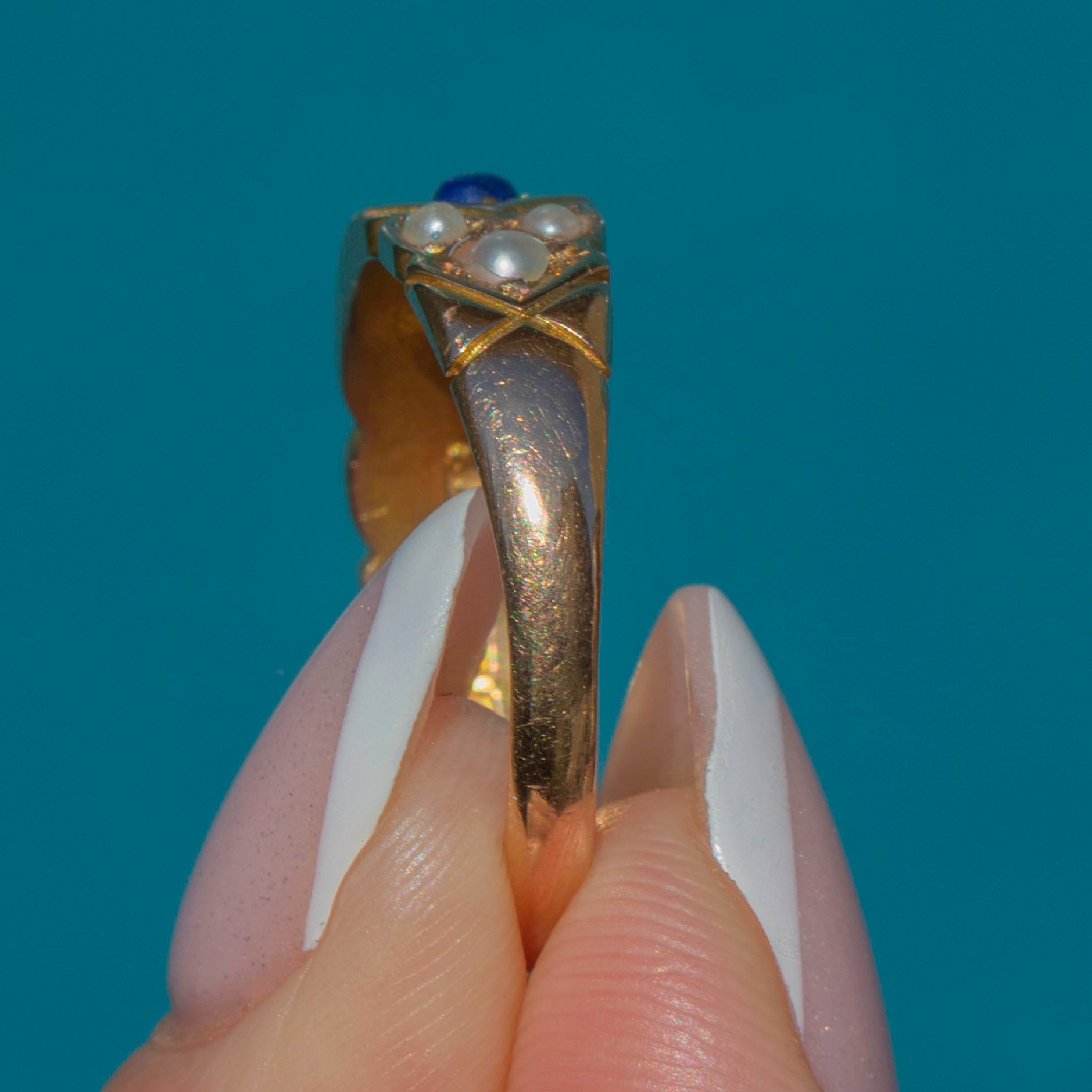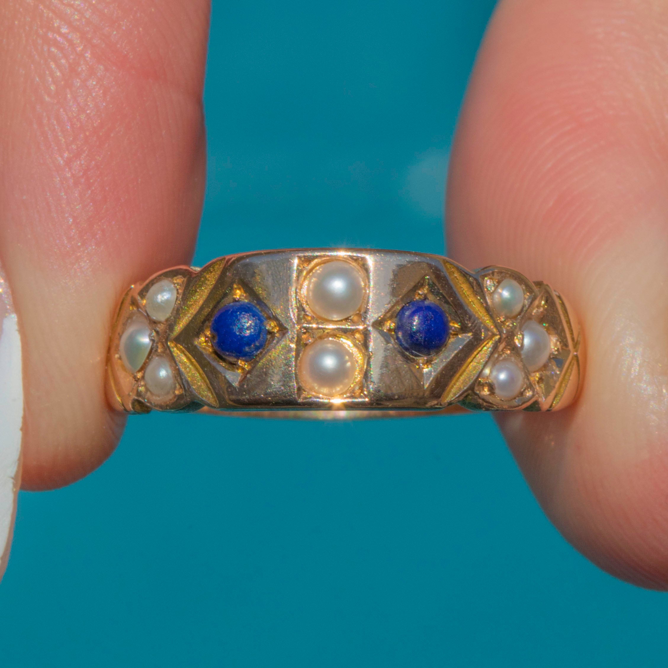 Victorian 15ct Gold Lapis Lazuli Pearl Gypsy Ring, c.1883