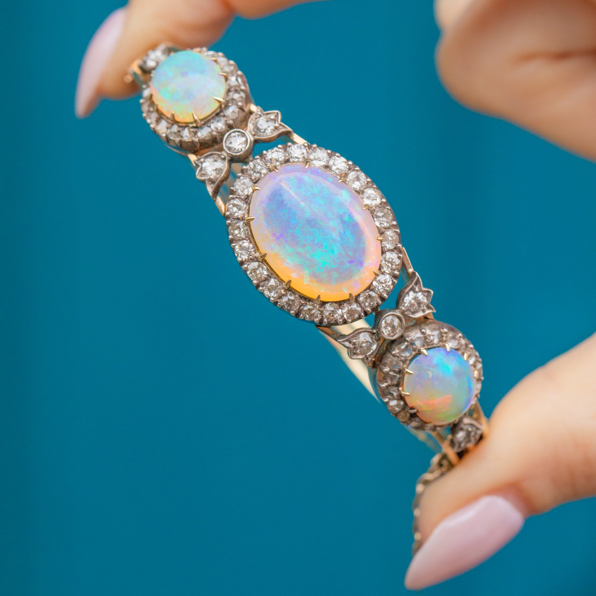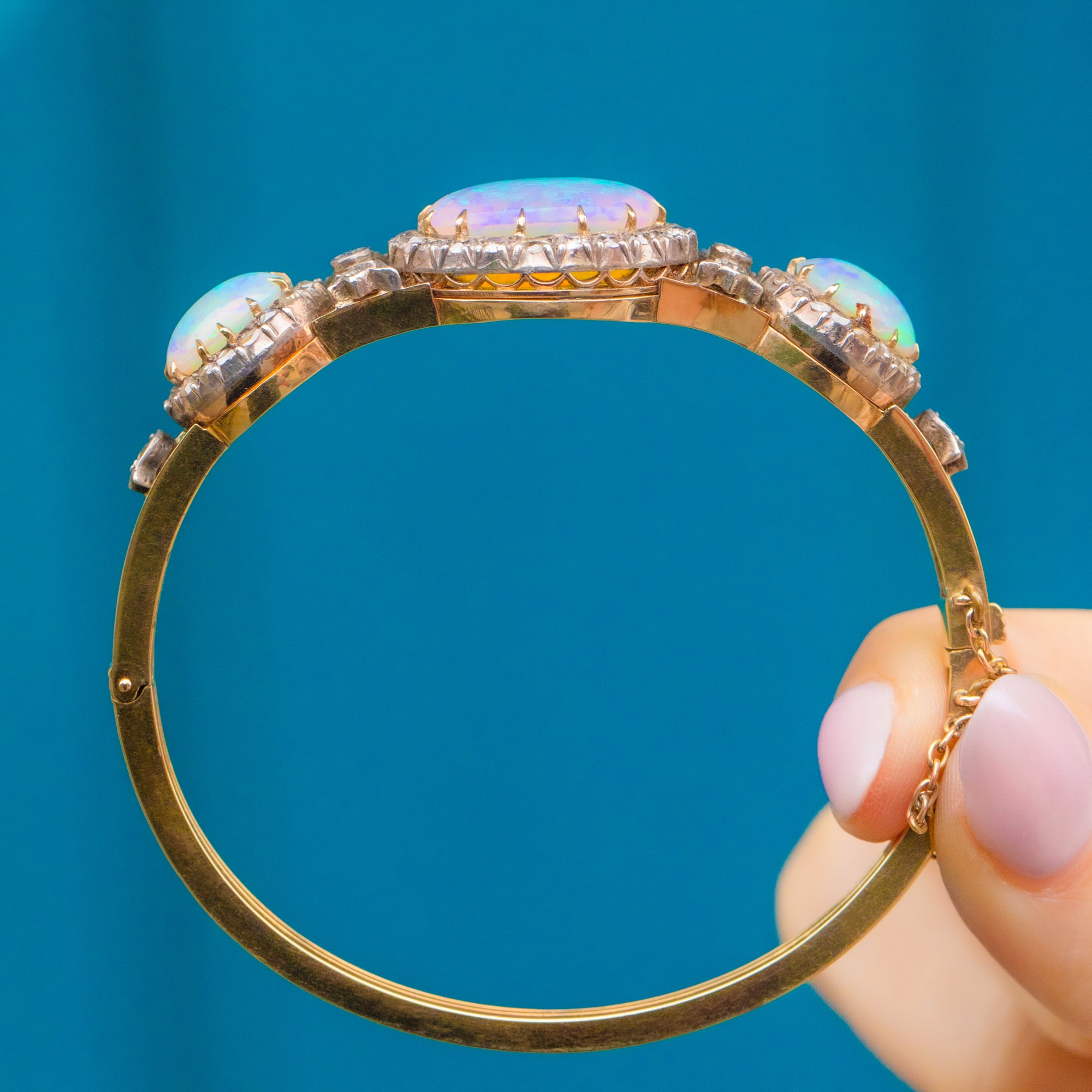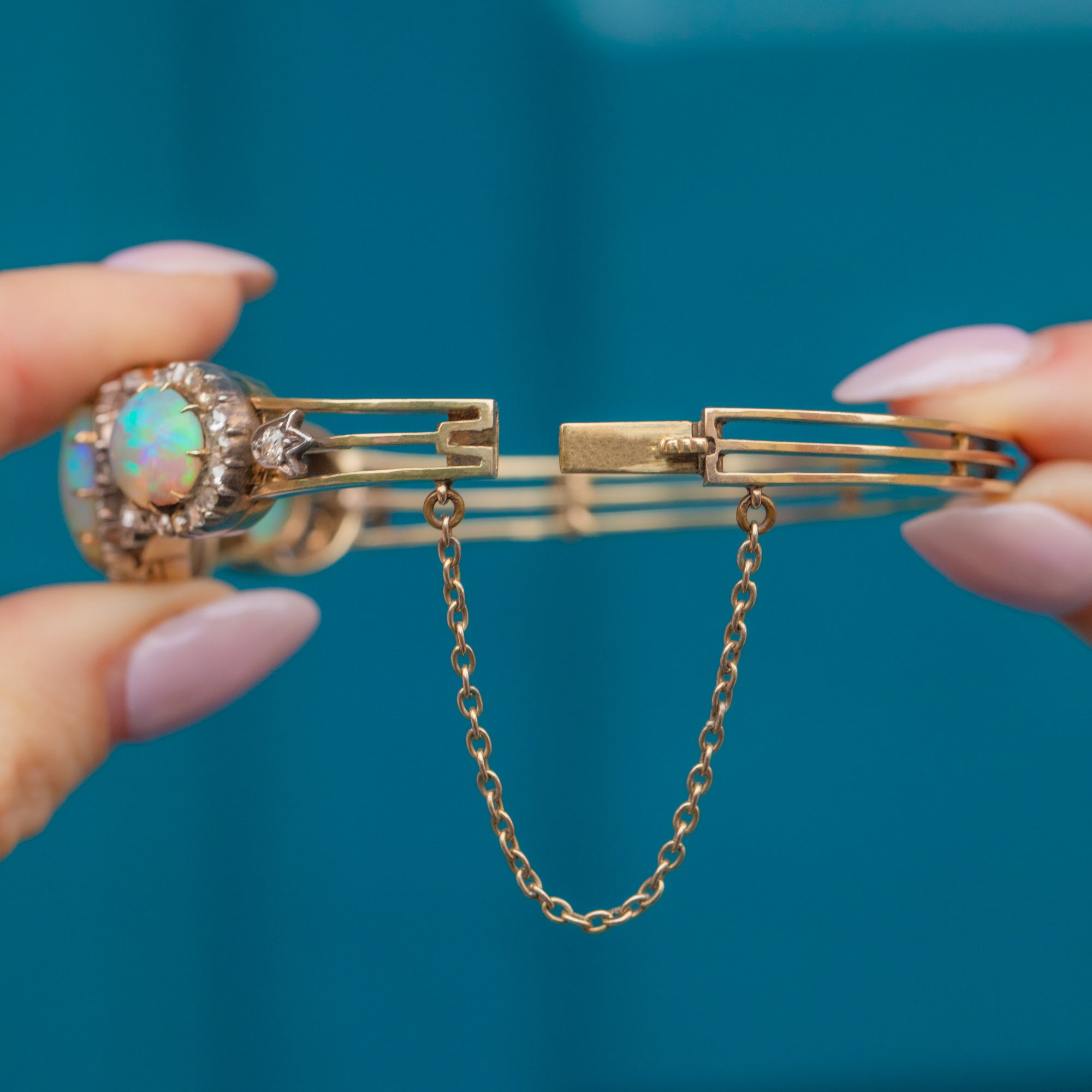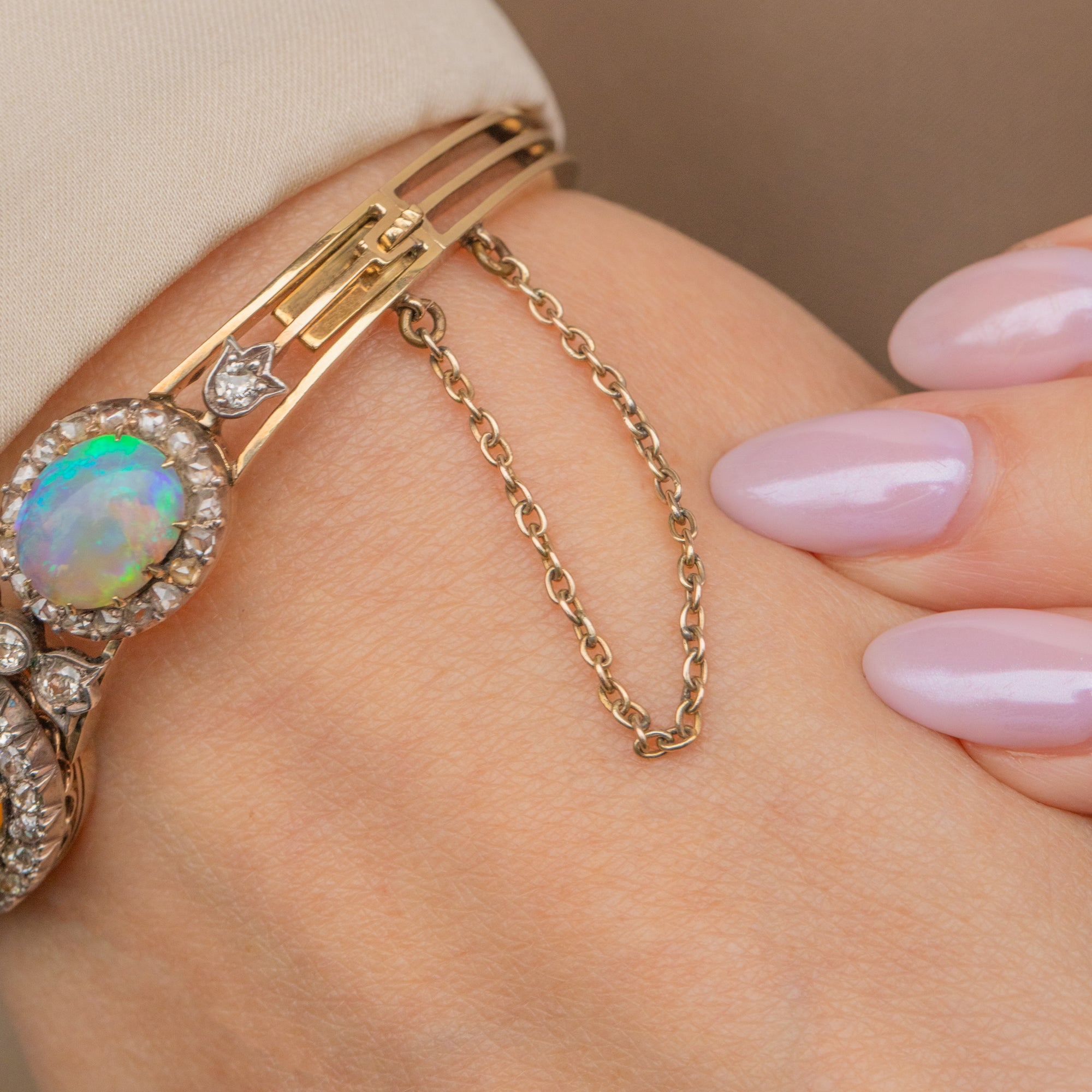 EXCELLENT. This Victorian 15ct Gold Opal Diamond cluster bangle is in excellent condition! The Opal and Diamonds are secure within their settings, with no damage to note. The Sterling Silver has a lovely patina in the grooves, enhancing the mesmerising glisten of the Diamonds. The 15ct Gold bangle is formed to perfection, with clean solder marks and a tongue clasp that allows you to wear with confidence. You are bound to be the belle of the ball with this Gold Diamond bracelet adorning your wrist!