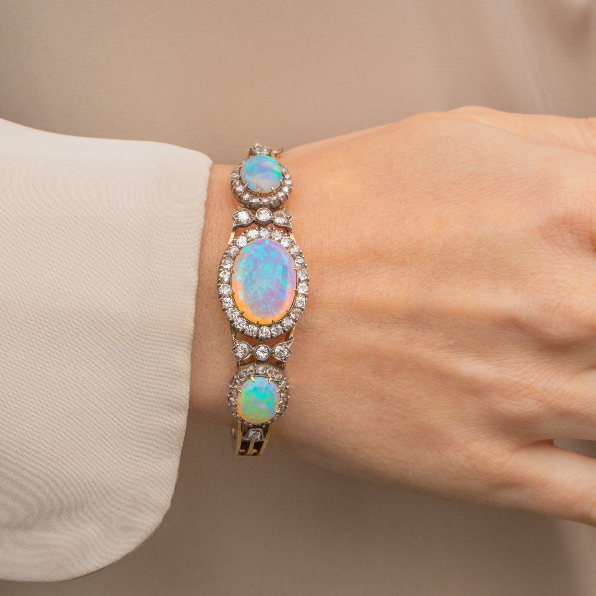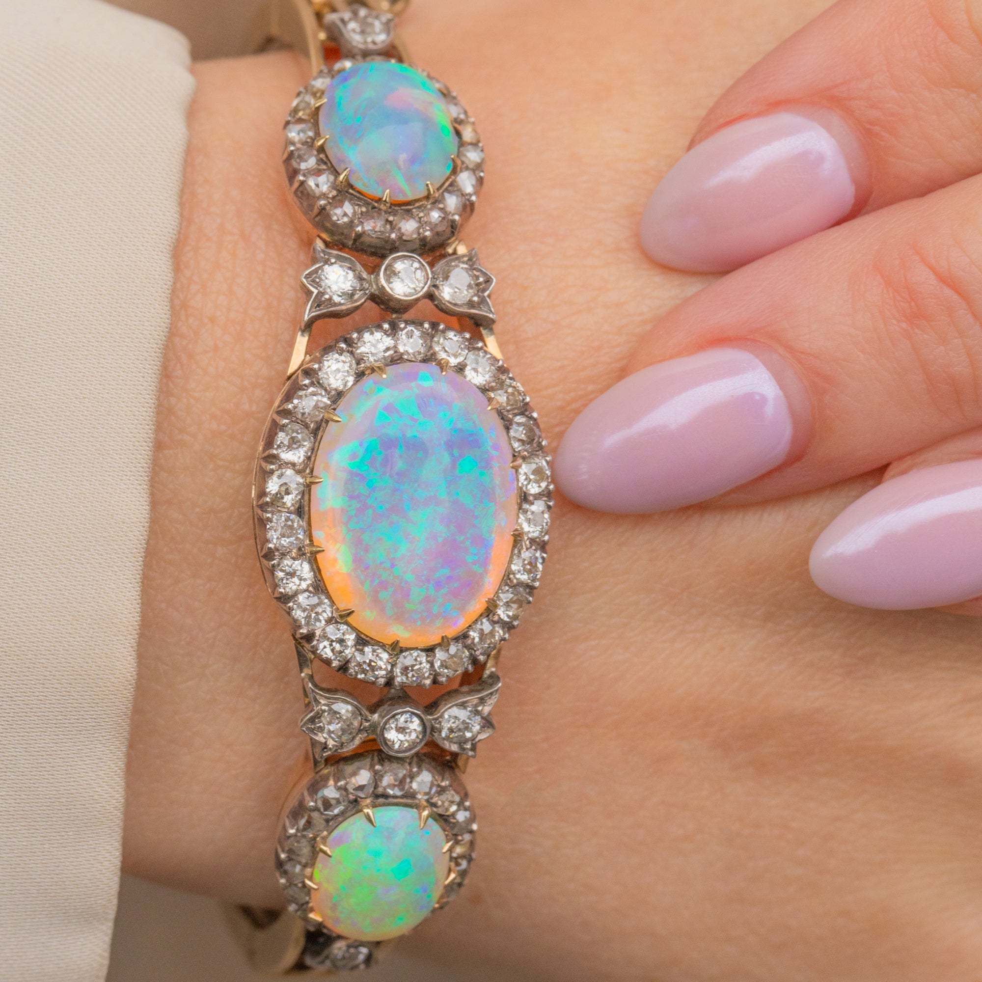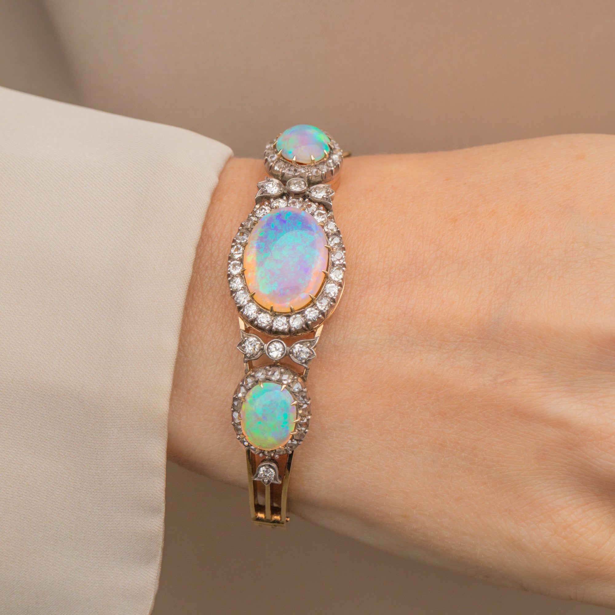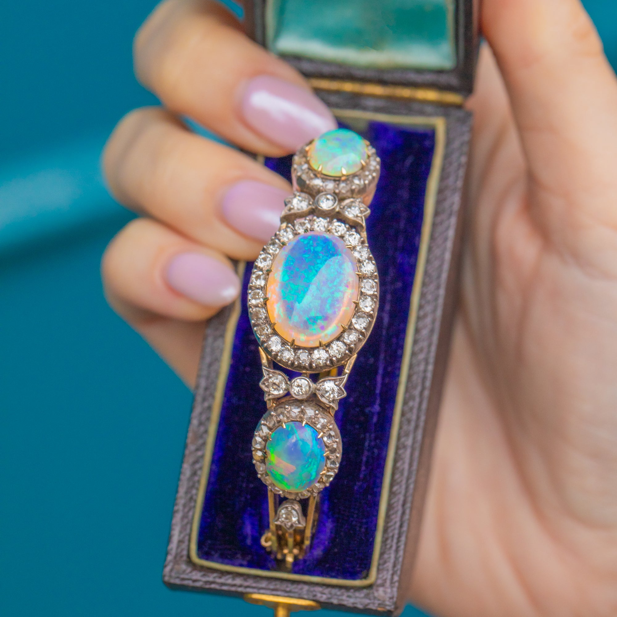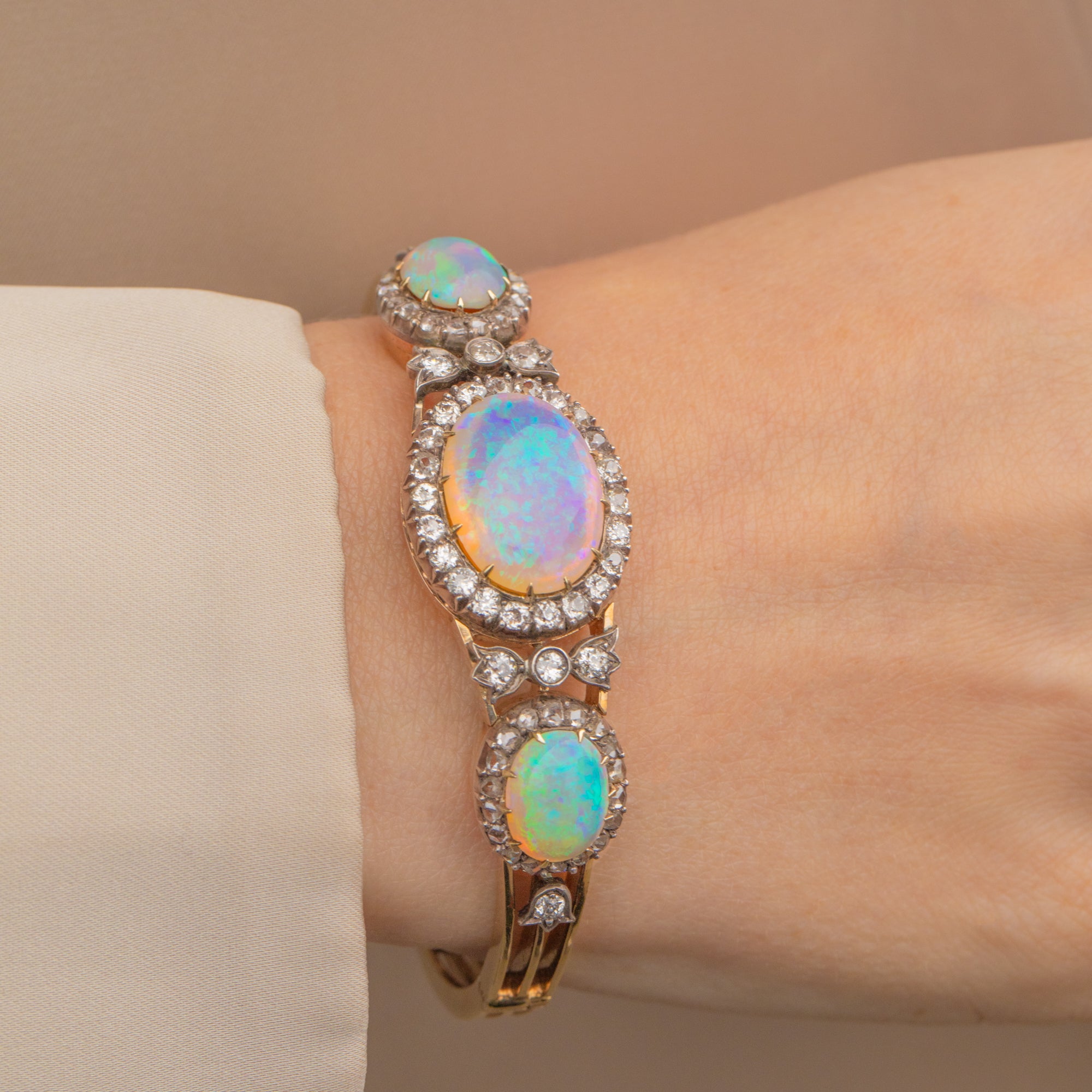 EXCELLENT. This Victorian 15ct Gold Opal Diamond cluster bangle is in excellent condition! The Opal and Diamonds are secure within their settings, with no damage to note. The Sterling Silver has a lovely patina in the grooves, enhancing the mesmerising glisten of the Diamonds. The 15ct Gold bangle is formed to perfection, with clean solder marks and a tongue clasp that allows you to wear with confidence. You are bound to be the belle of the ball with this Gold Diamond bracelet adorning your wrist!