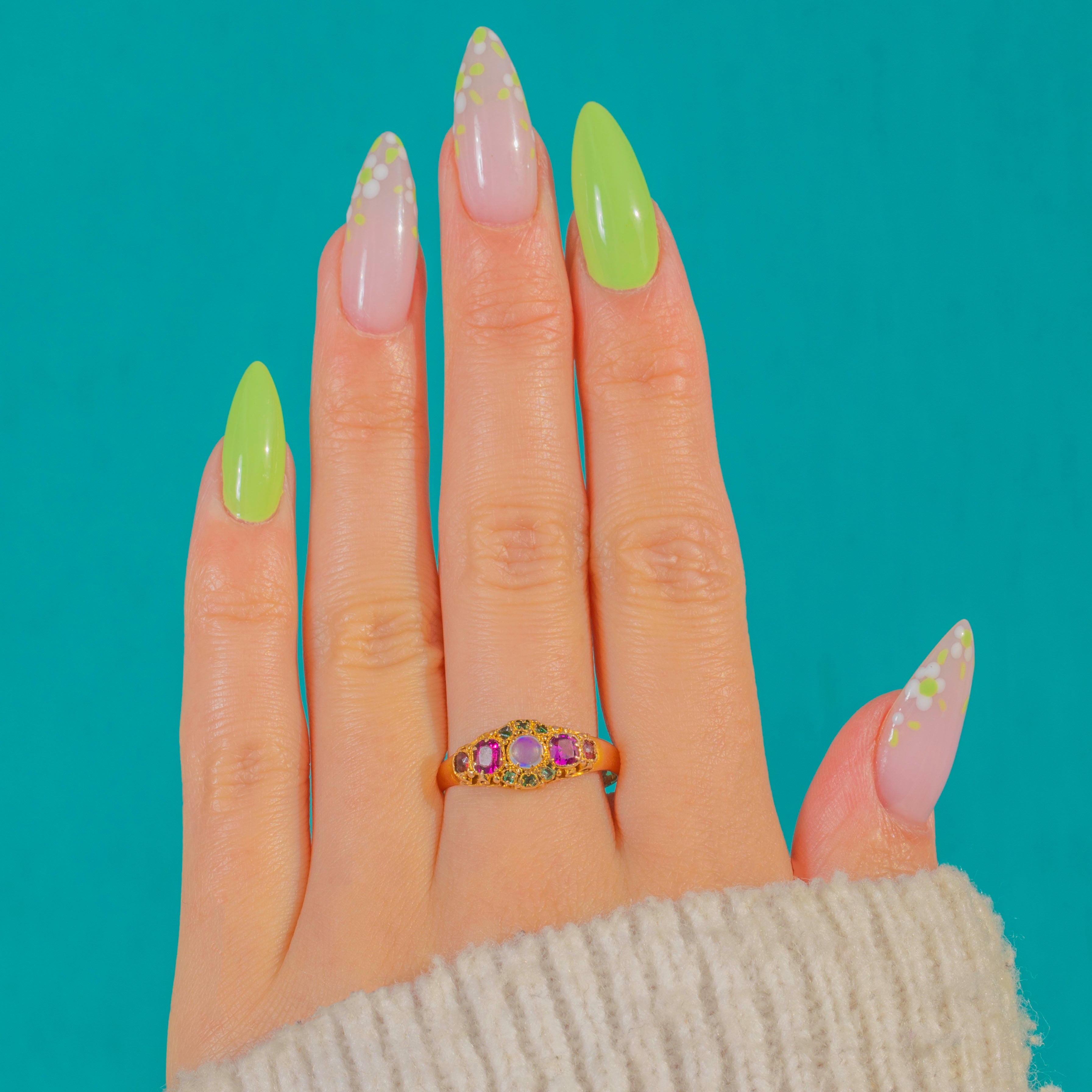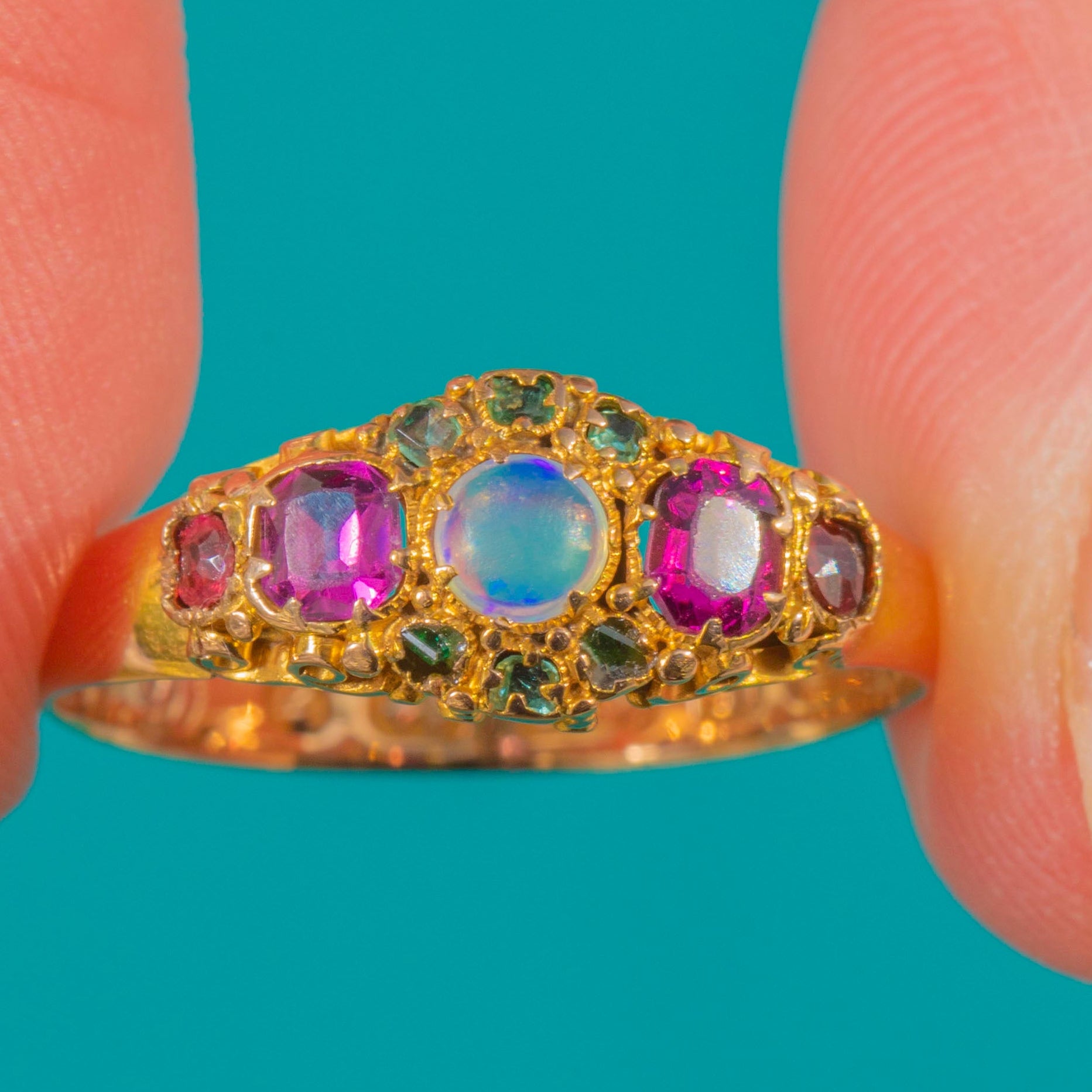 A jewel brimming with Victorian romance, this exquisite 15ct Gold cluster ring is hallmarked for Birmingham 1866. At its heart sits a luminous round Opal cabochon, its gentle play-of-colour flanked by rosy Pink Tourmalines that graduate in size for a graceful sense of movement. A constellation of petite Emeralds punctuates the design, lending vivid green sparkle to the ornate cluster.