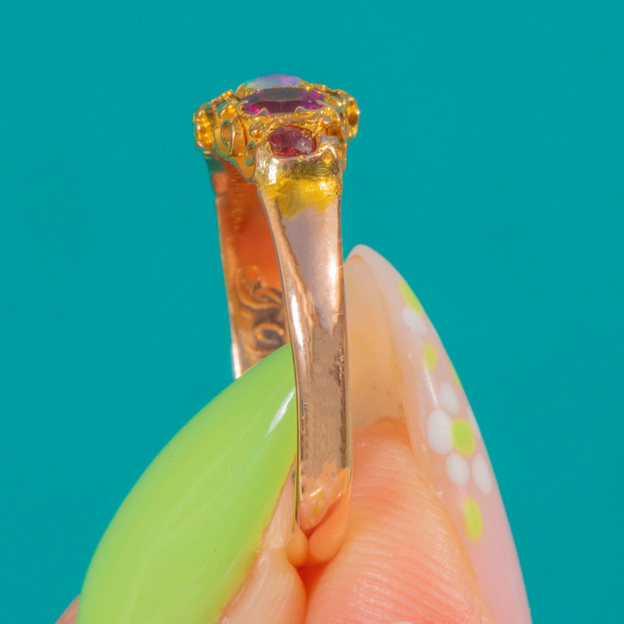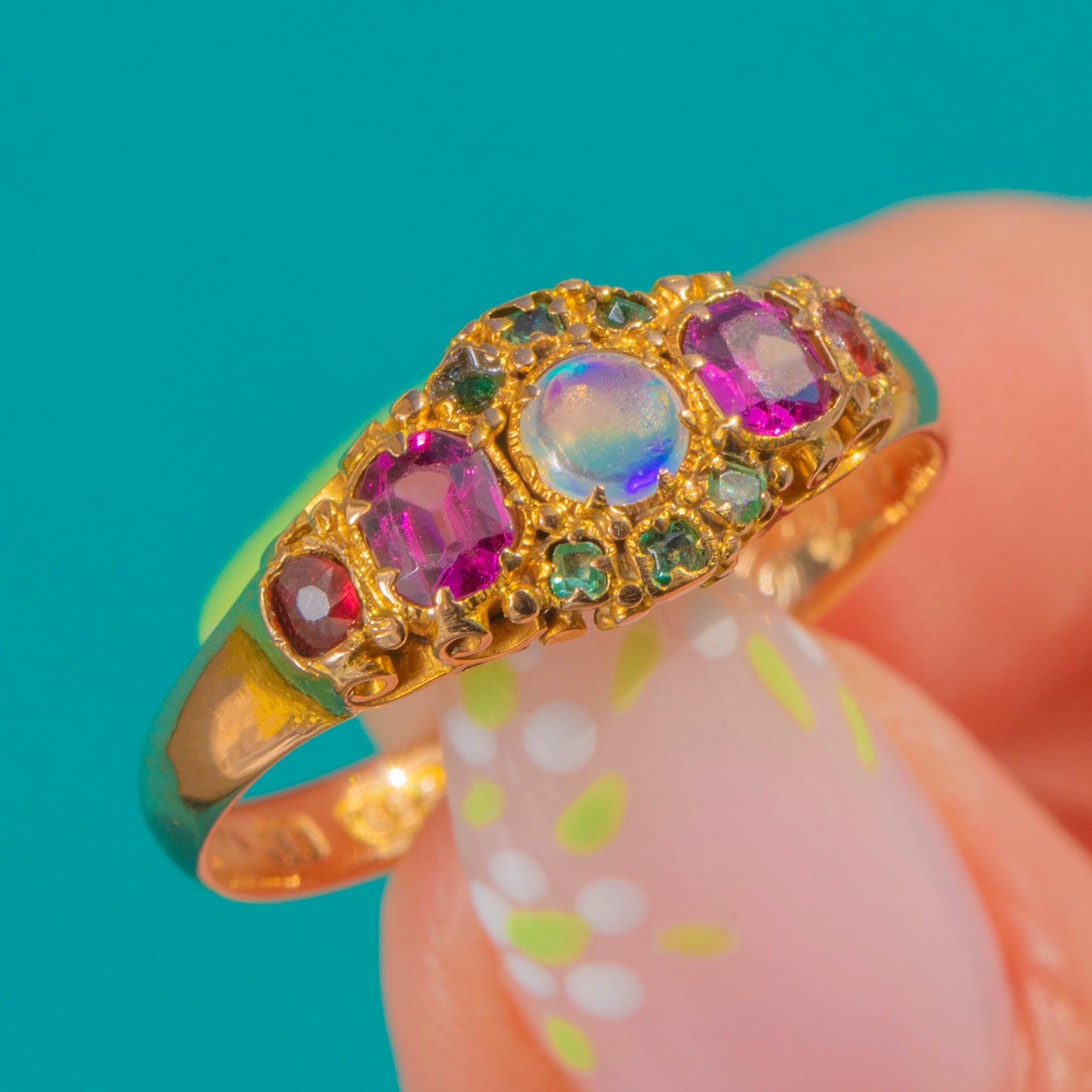 Victorian 15ct Gold Opal Emerald Pink Tourmaline Ring c.1866