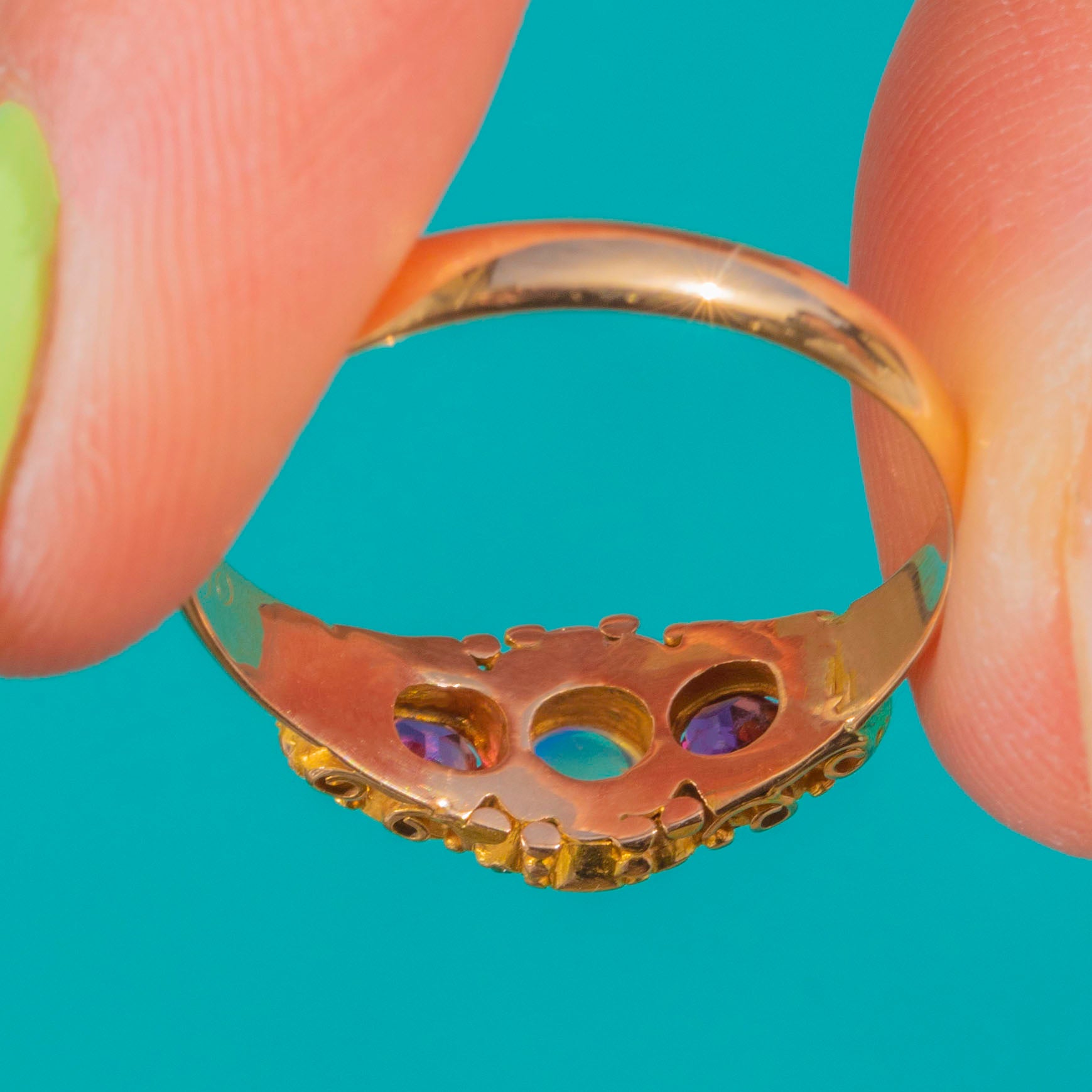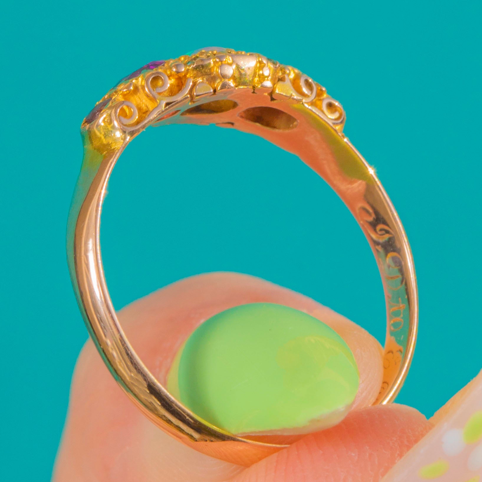 The craftsmanship is wonderfully of its era, with a finely pierced, scrolling under-gallery enriched by delicate granulation and millegrain detail. Dainty on the finger yet rich in character, it’s a beautifully balanced piece that captures the elegance and artistry of mid-Victorian jewels.