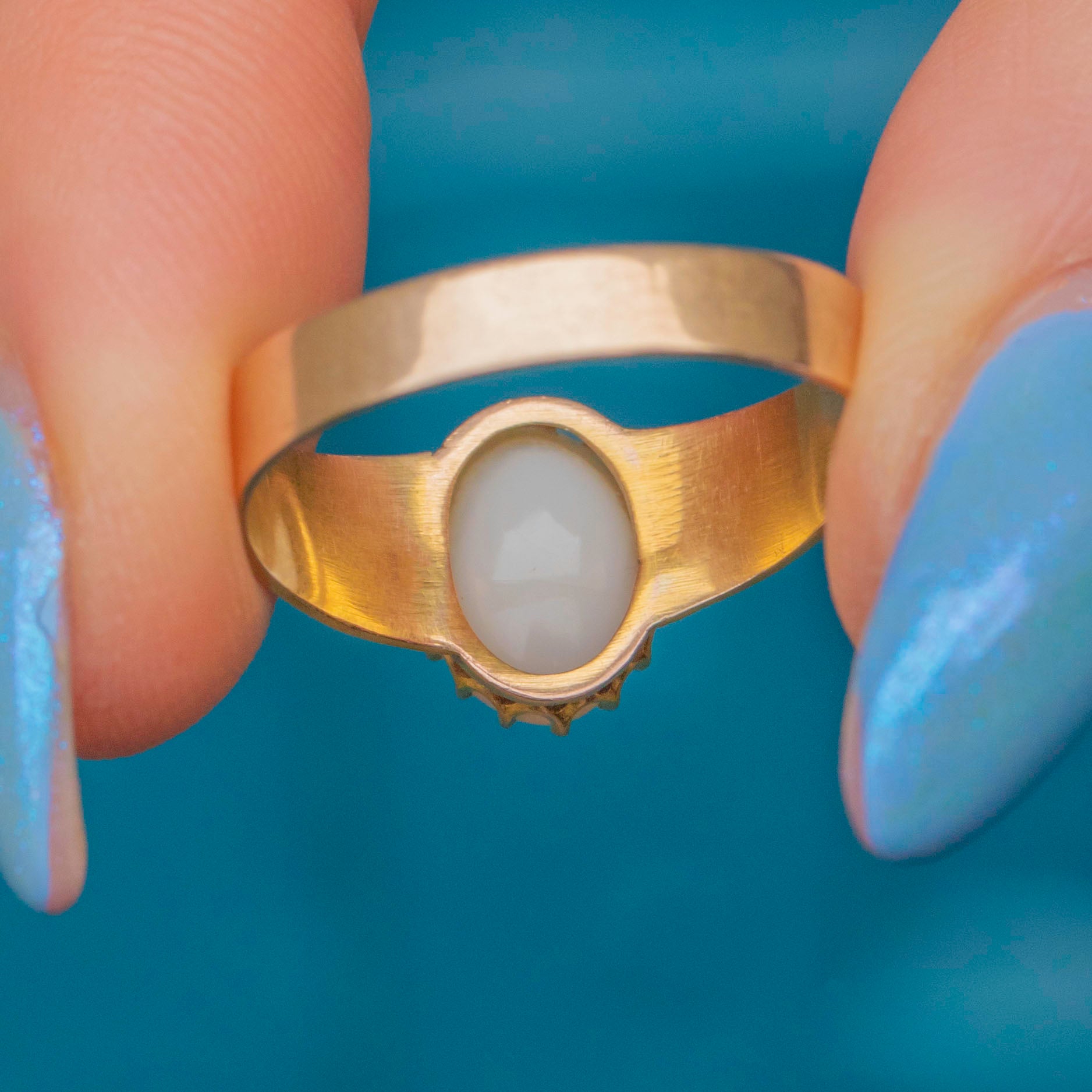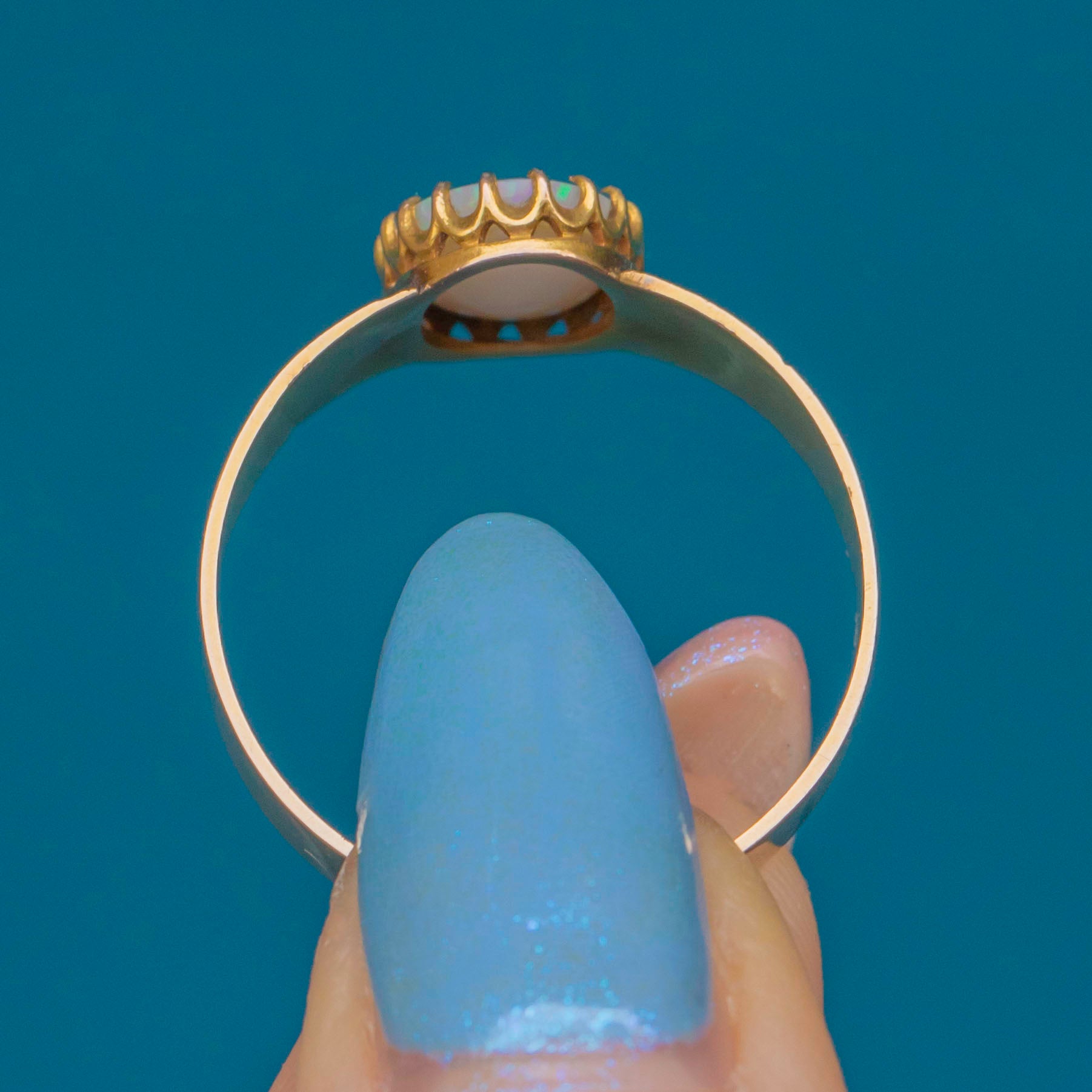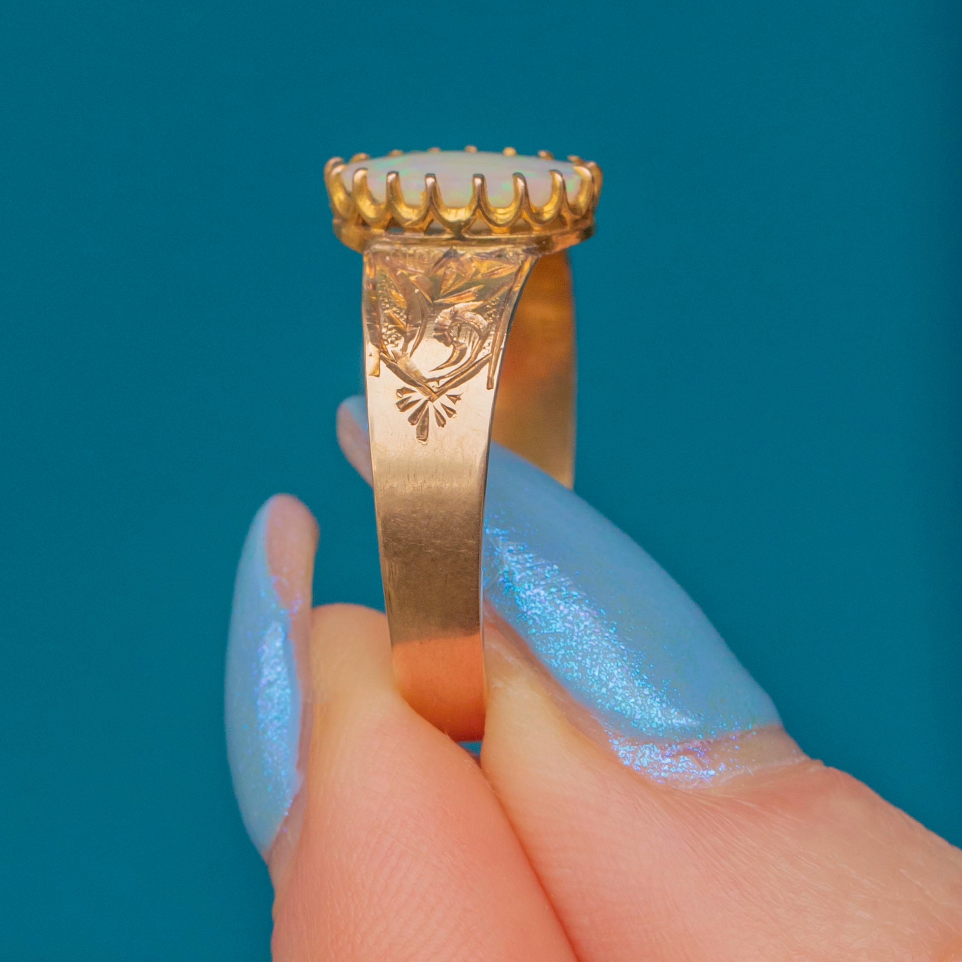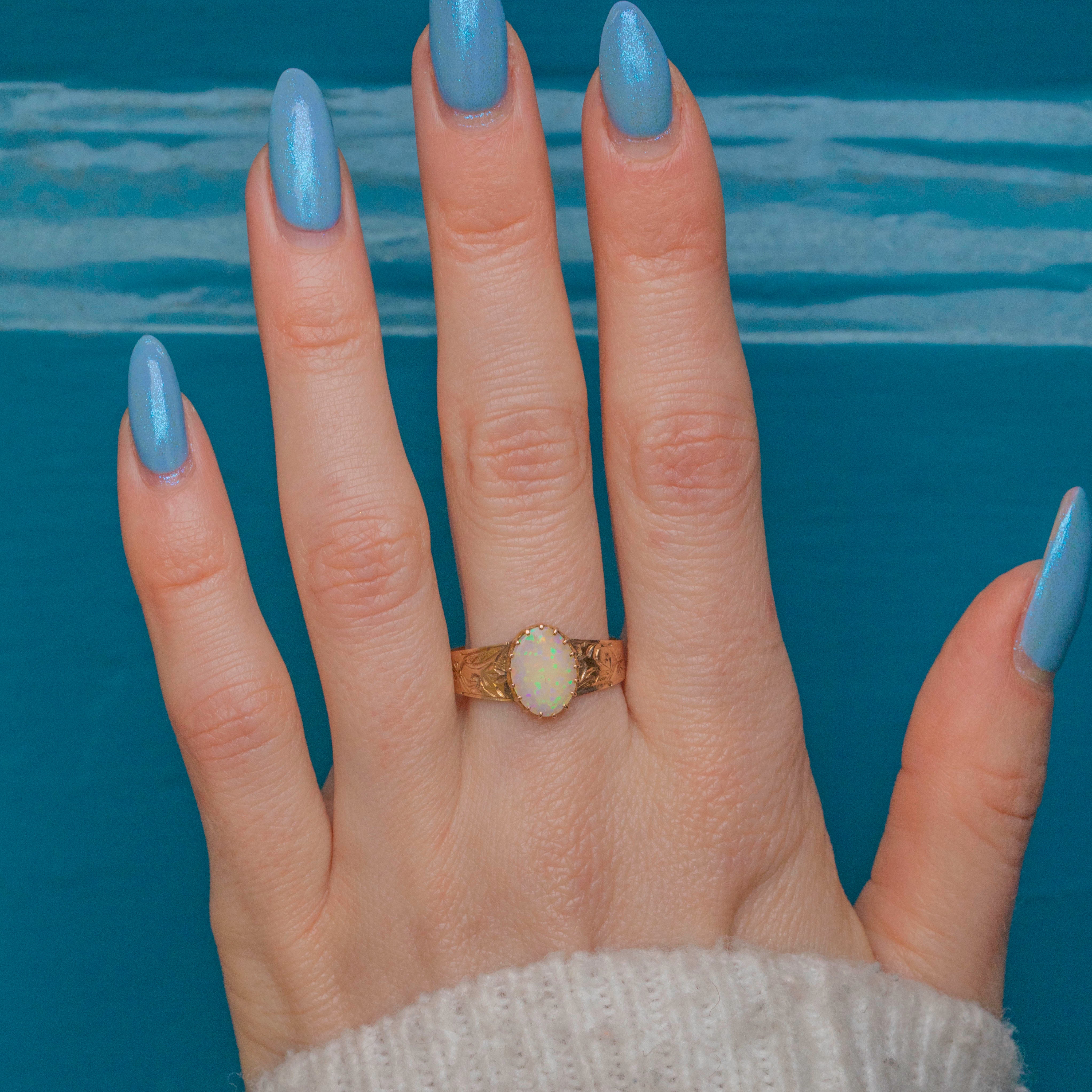 This Victorian 15ct Gold Opal ring is gorgeous! The thick, engraved 15ct Gold band is richly saturated with a warm, buttery hue, offering a regal touch that complements her striking centrepiece.