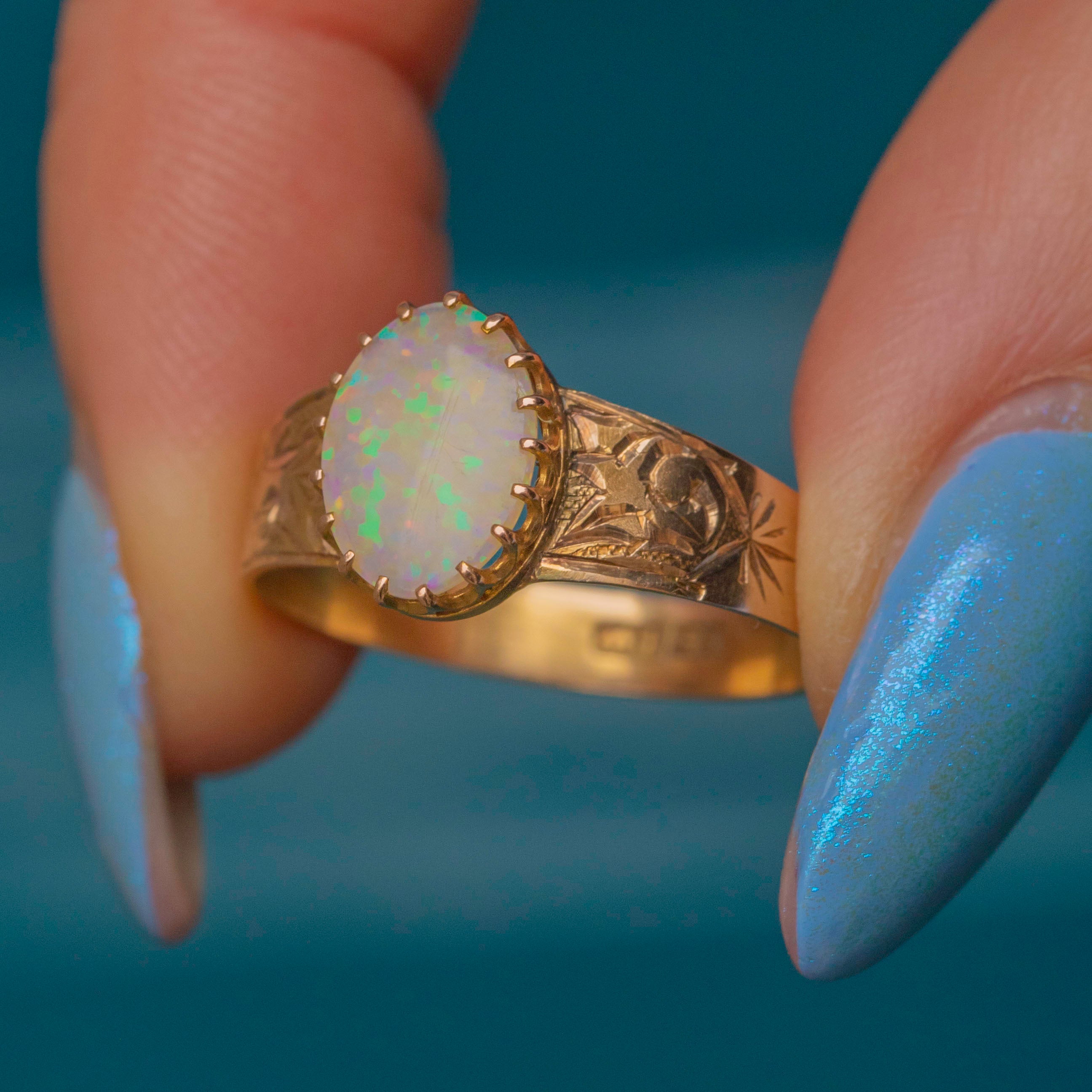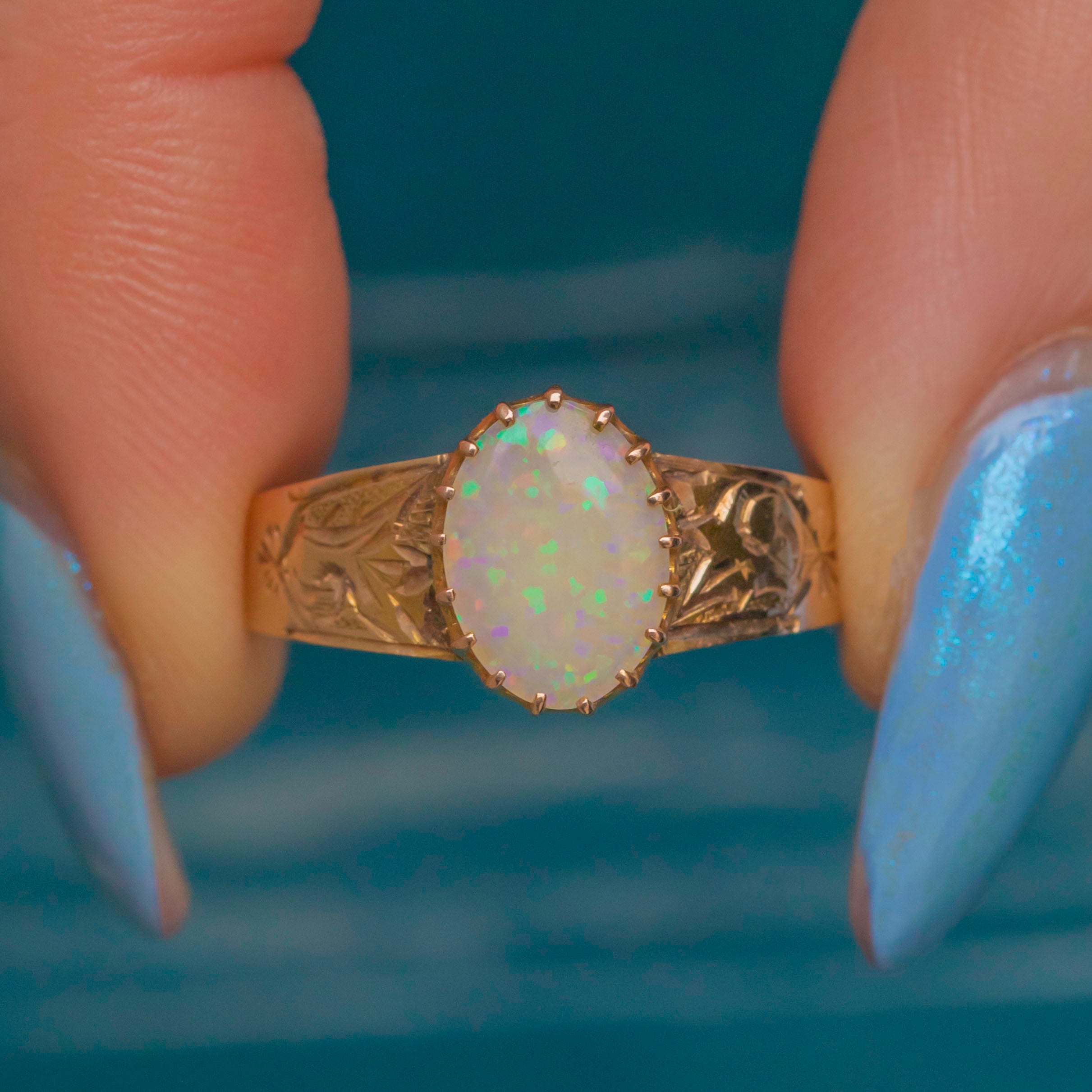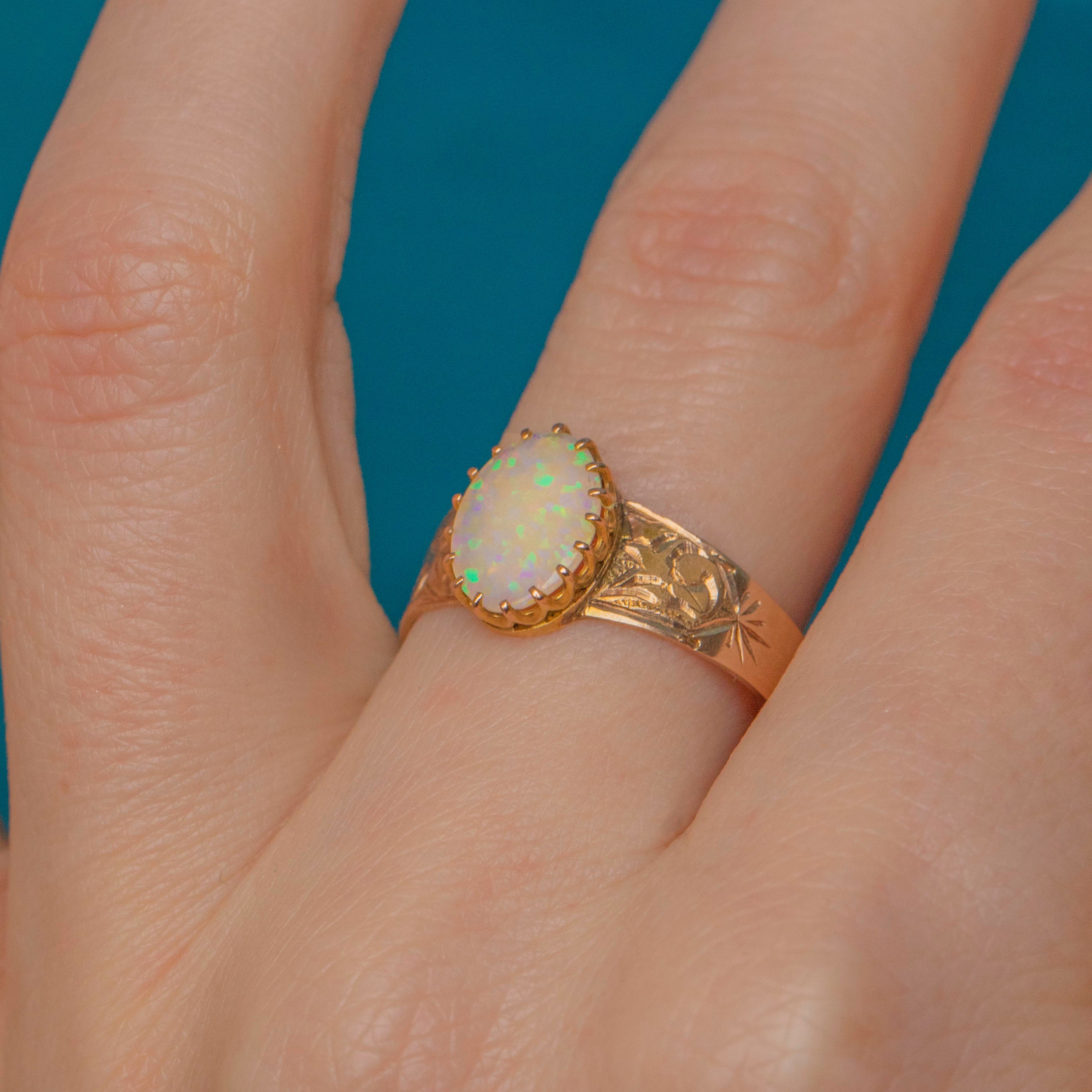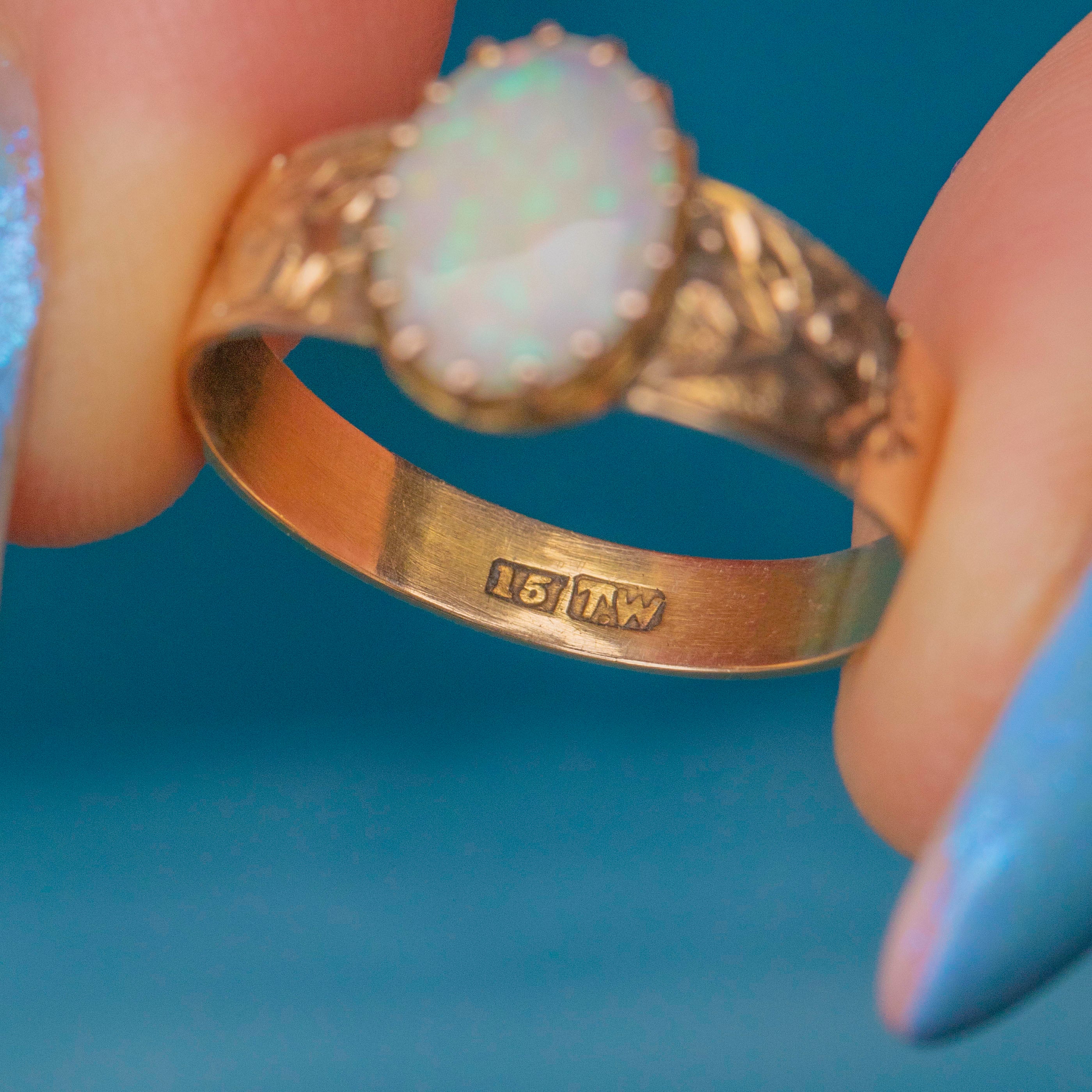 EXCELLENT. This antique 15ct Gold Opal ring is in excellent condition, with the Opal securely set and free from chips or cracks. The Gold band is richly saturated and the engraved details have remained crisp, with lovely shunky antique stamps inside. This striking Victorian Opal ring will make a fine addition to your collection!