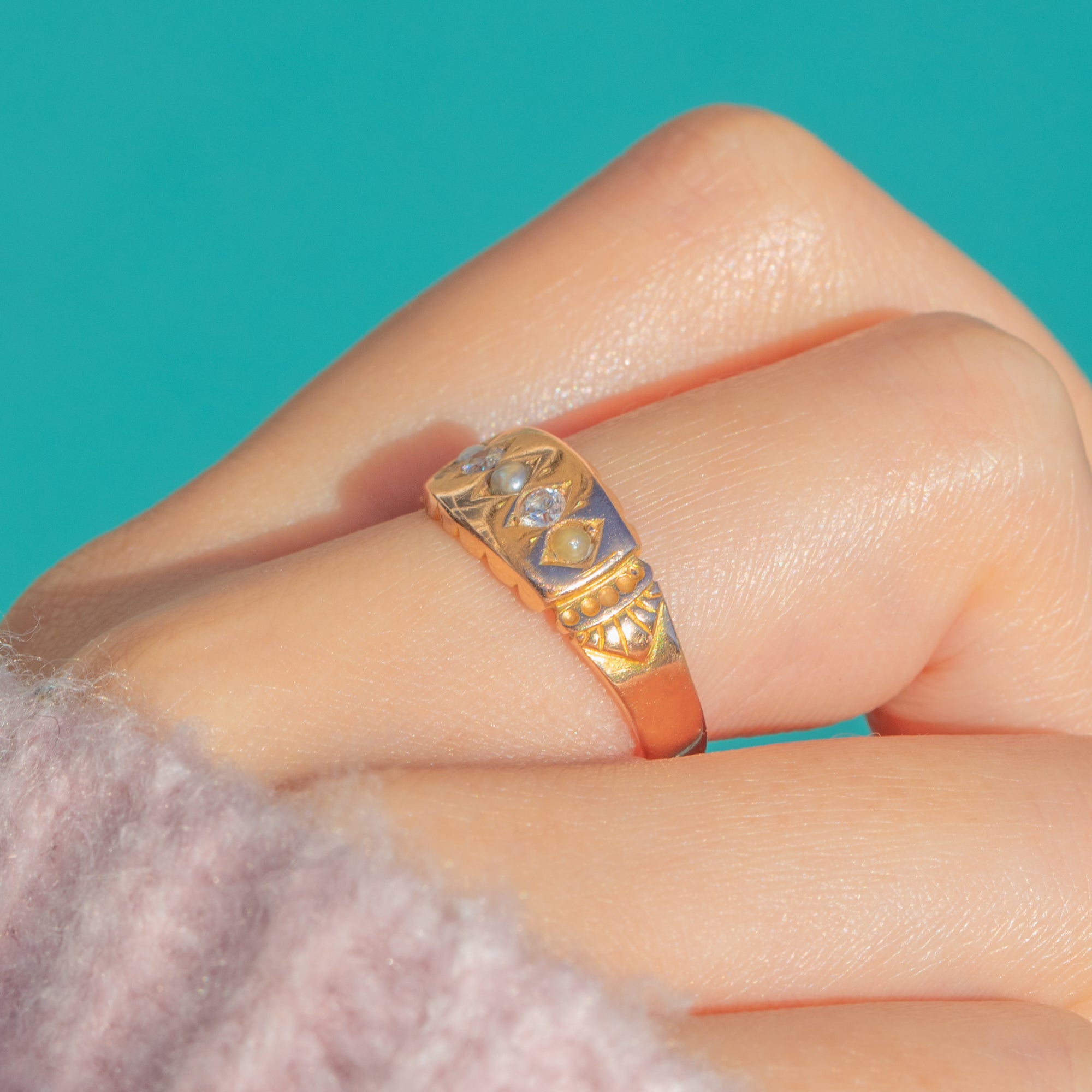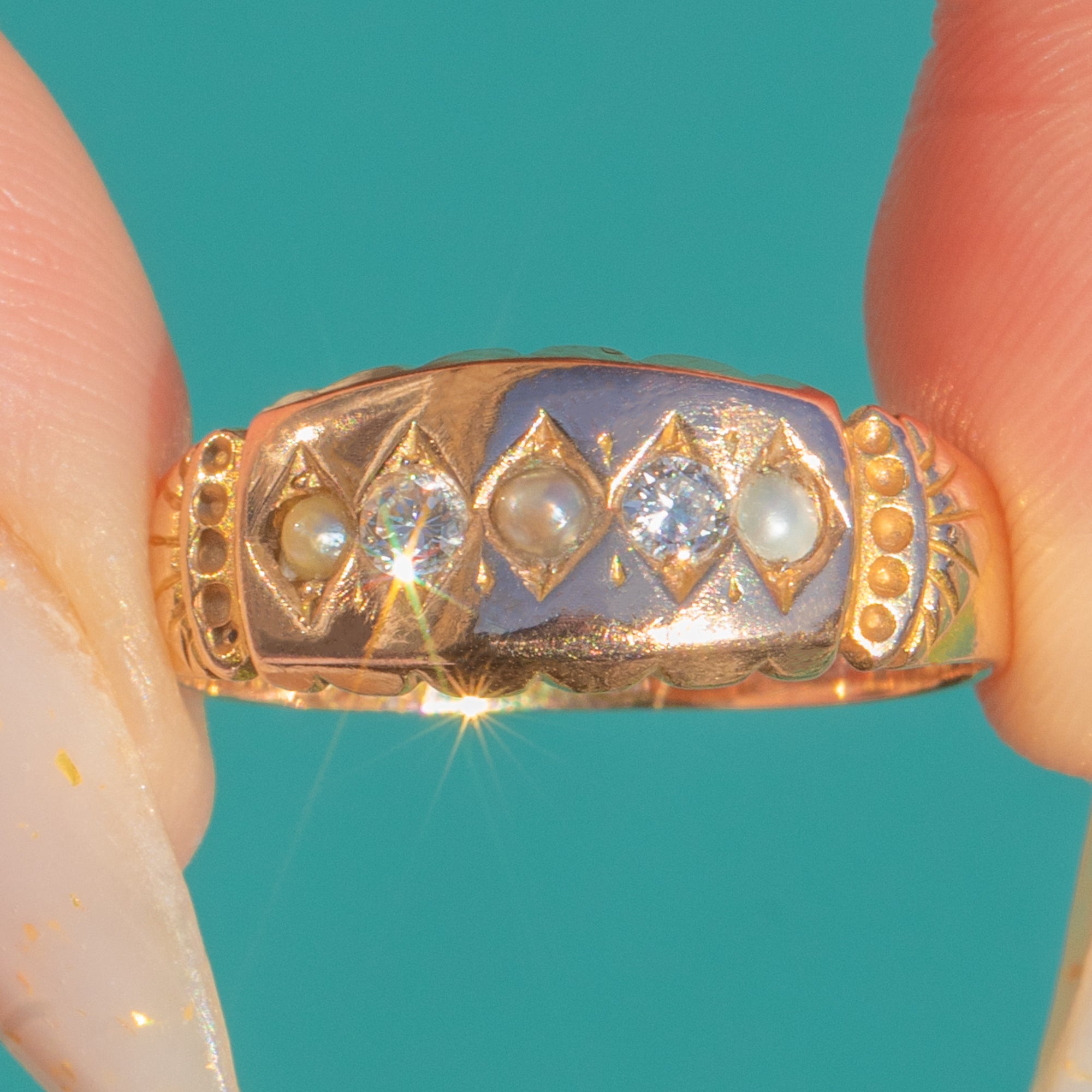 A beautifully preserved Victorian gypsy ring in warm 15ct Gold, bead-set with alternating Diamonds and Pearls across a geometric lozenge-style head. The low profile glides on the finger, while bright-cut engravings and fine beaded detailing lend a refined sparkle. A subtle two-tone effect at the head enhances the patterning and draws the eye to the alternating stones.