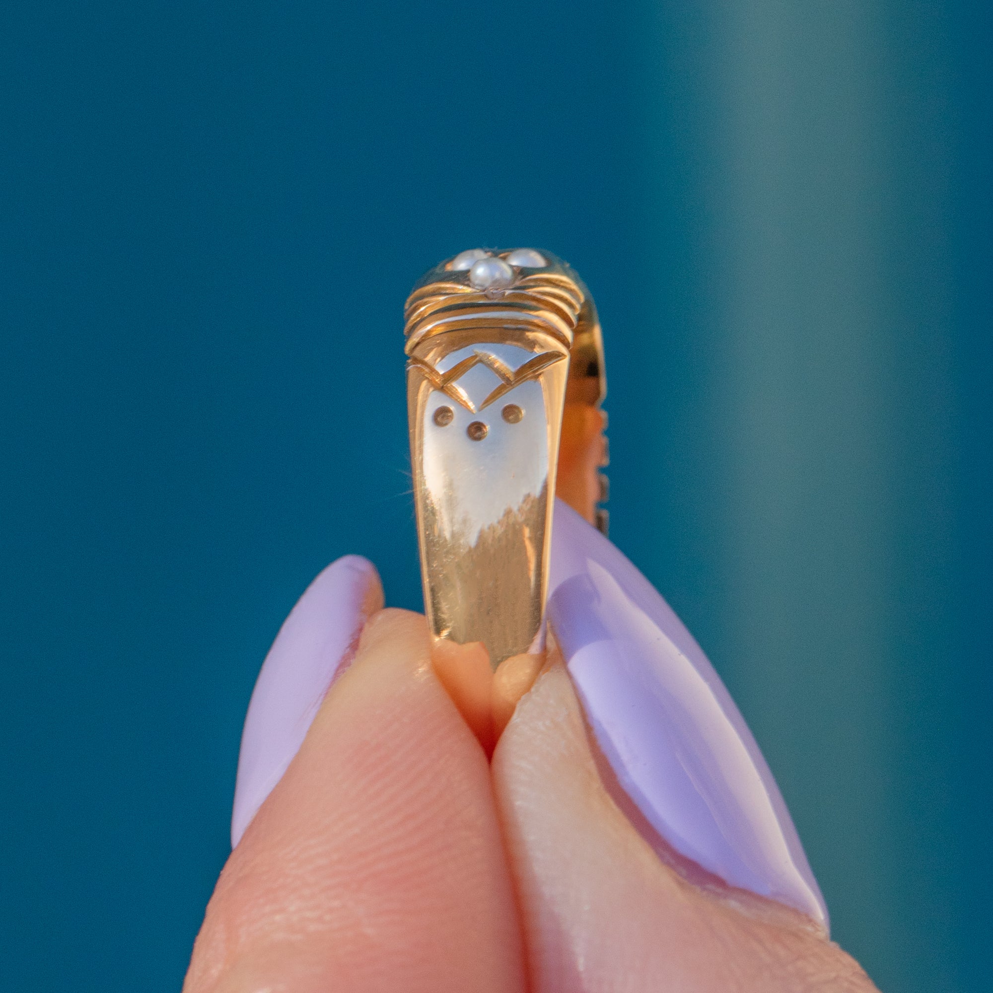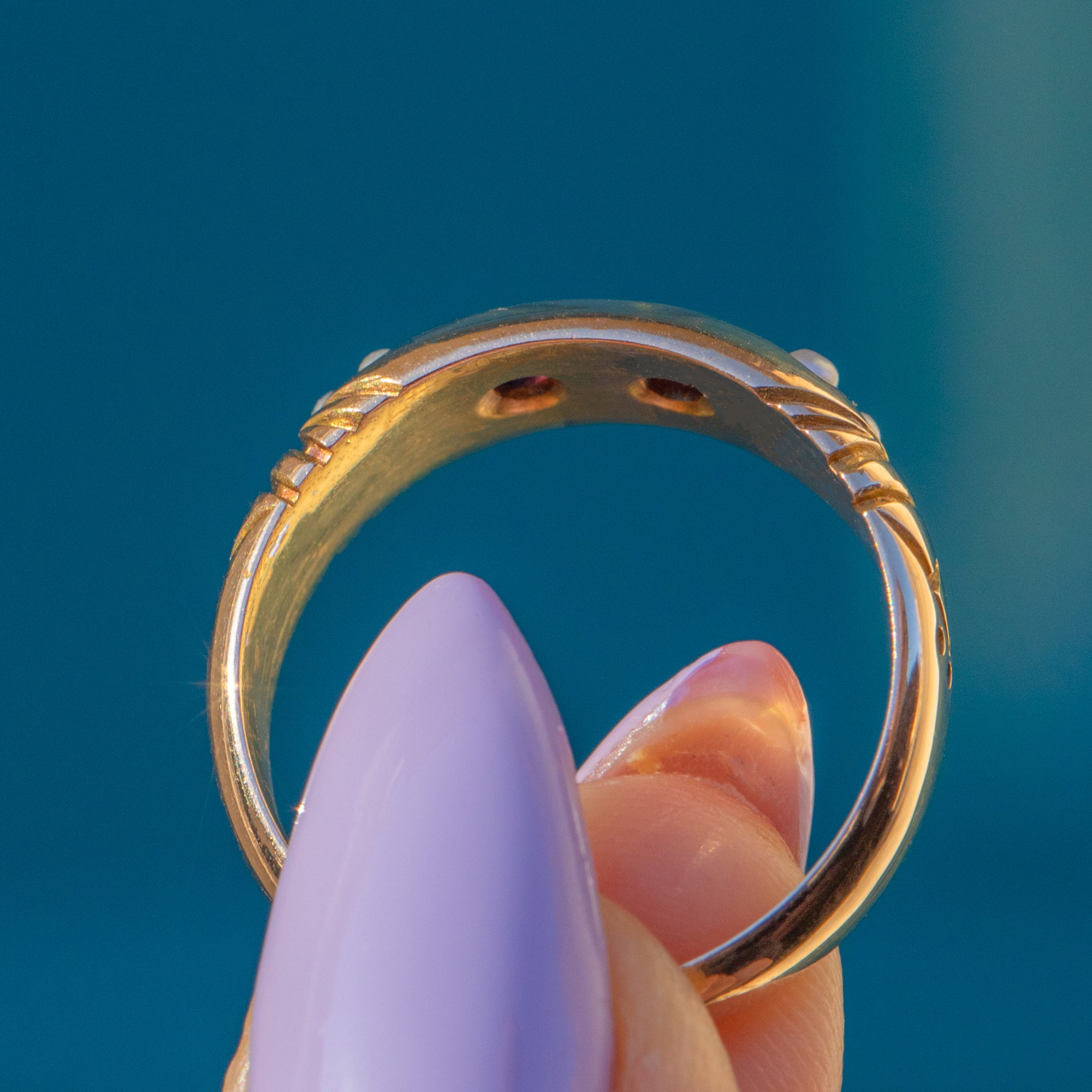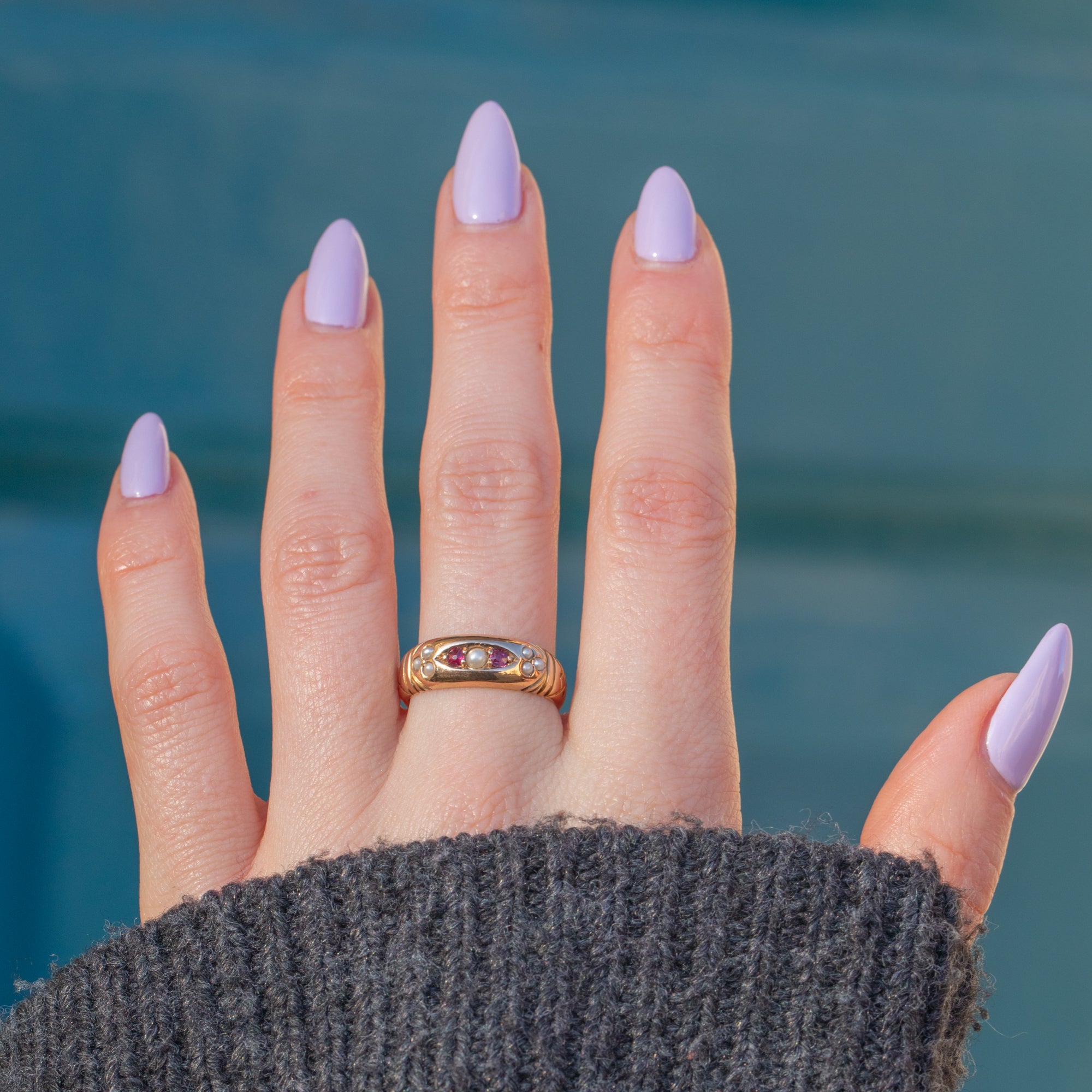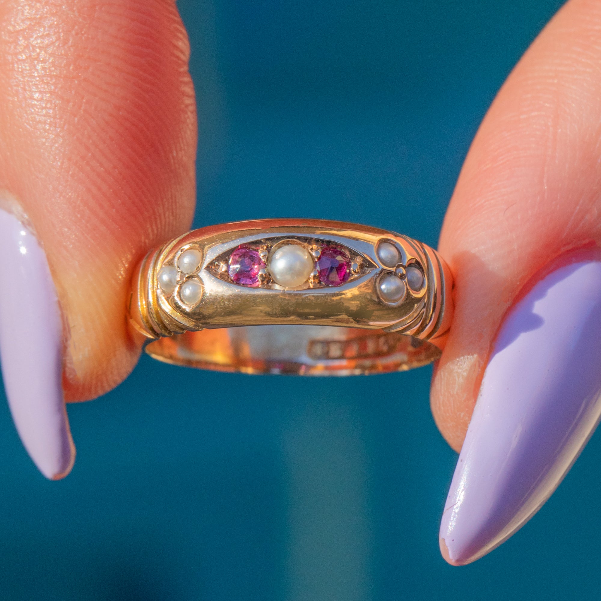This Victorian 15ct Gold Pearl & Ruby gypsy ring will bring luxury to your ring stack! The chubby band is formed from sumptuous 15ct Gold and comes complete with a full set of English hallmarks dating to 1890, making this Victorian ring a fine collector's piece.