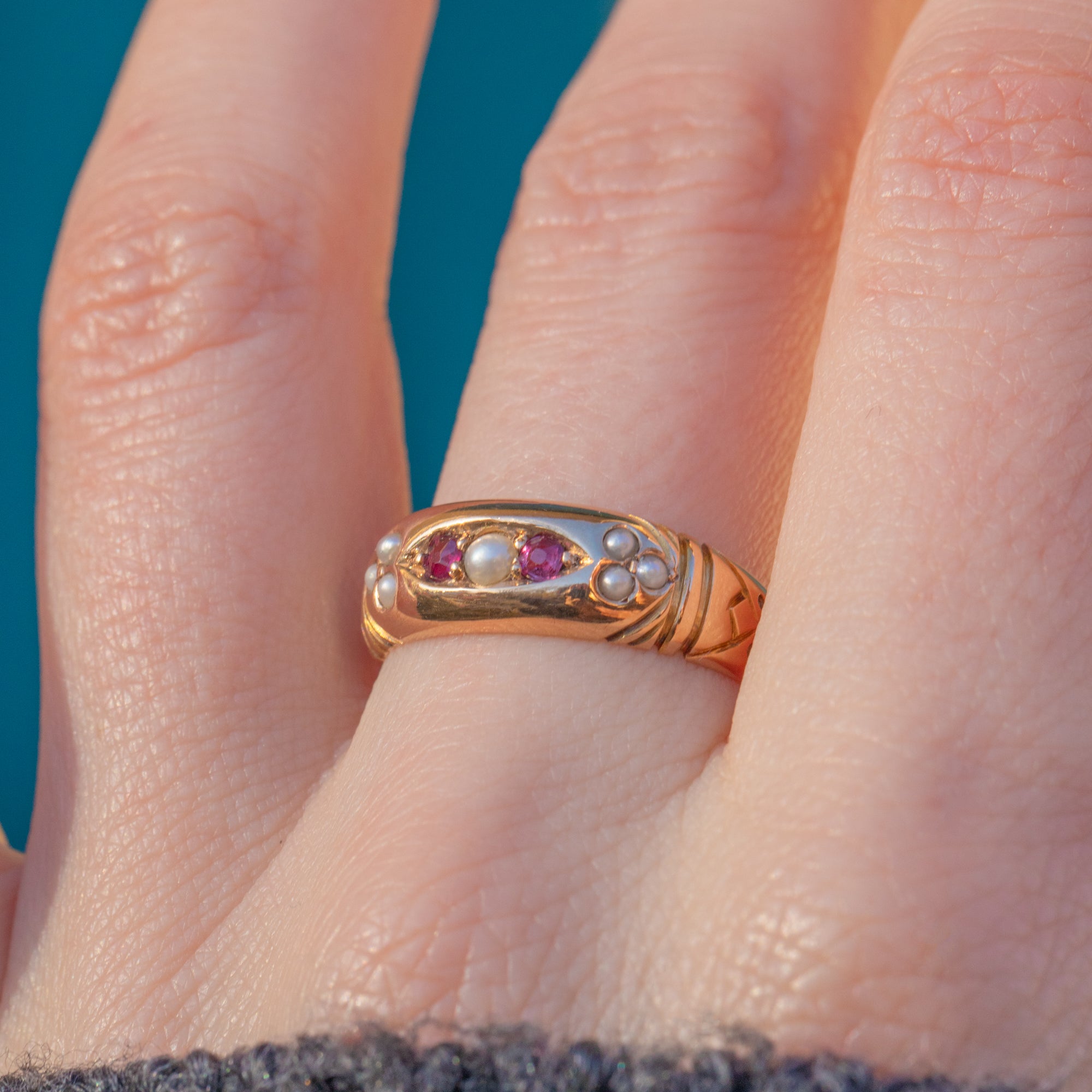 Victorian 15ct Gold Pearl & Ruby Gypsy Ring, c.1890