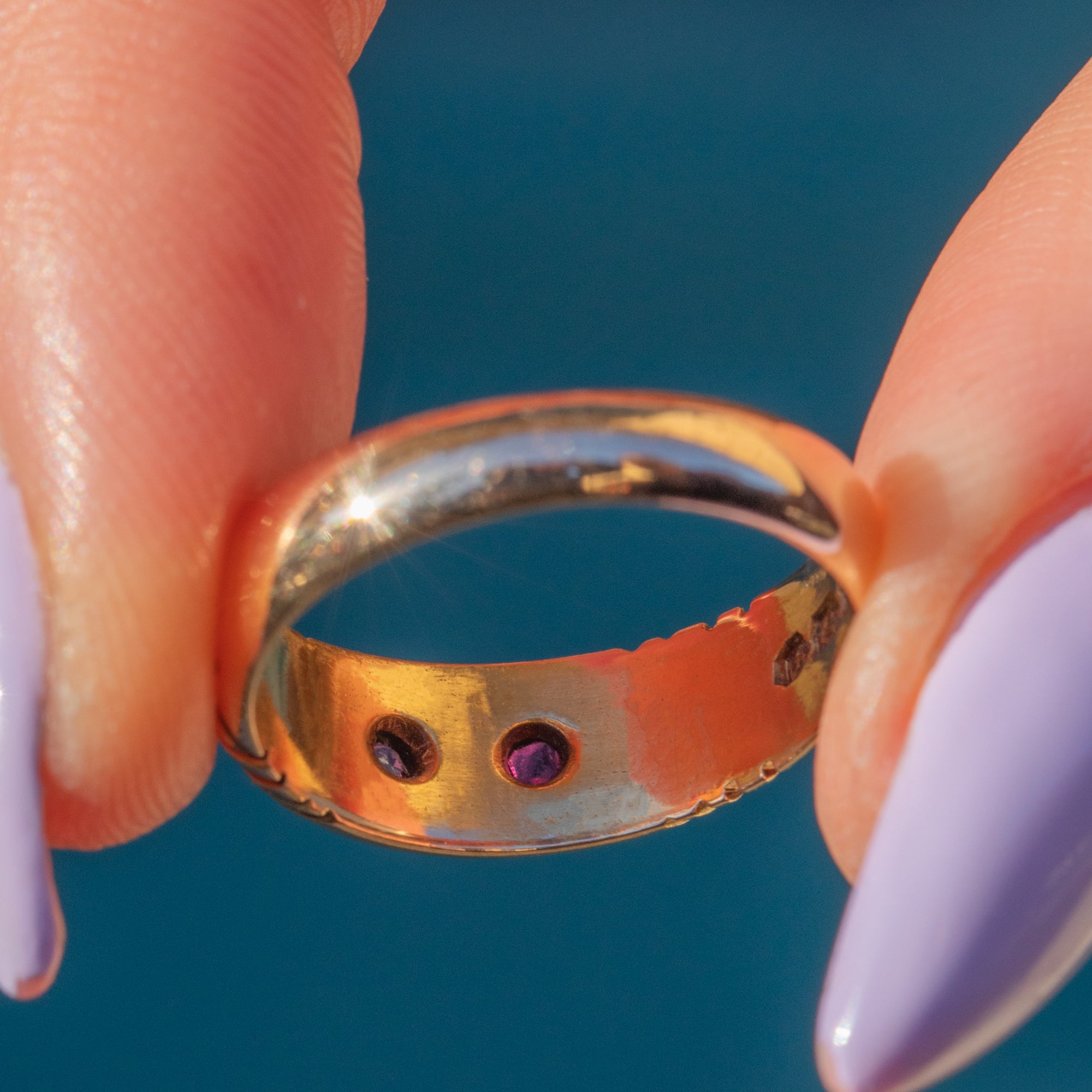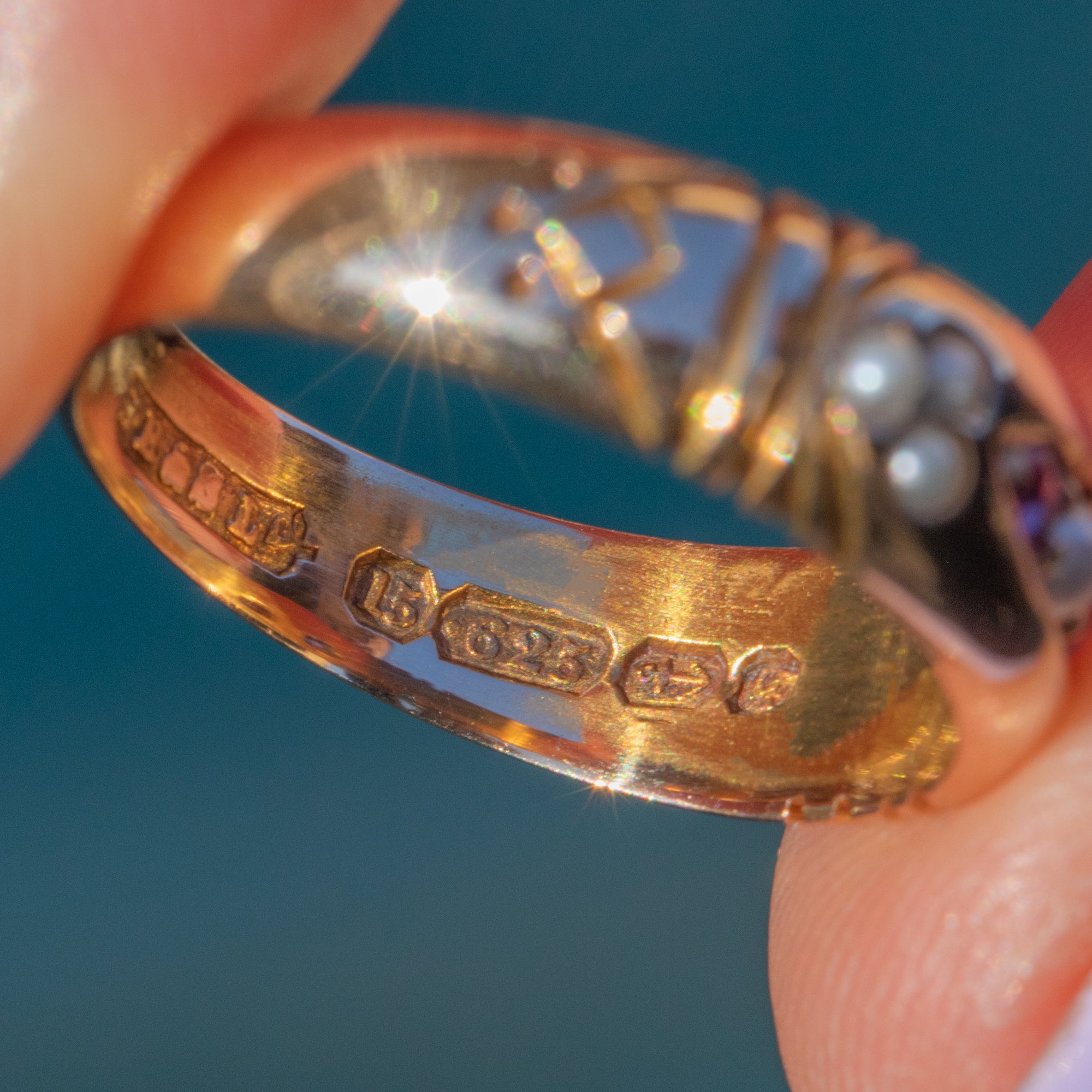 EXCELLENT. This Victorian 15ct Gold Pearl & Ruby gypsy ring is in excellent condition, especially when considering its grand age! The Gold is brightly saturated and the band has a full set of chunky antique hallmarks inside. The gemstones are all present, and although a couple of the Pearls have sunk slightly in their settings, they all remain secure with no visible surface wear. This Victorian gypsy ring has plenty of wear potential and promises many more years of enjoyment!
