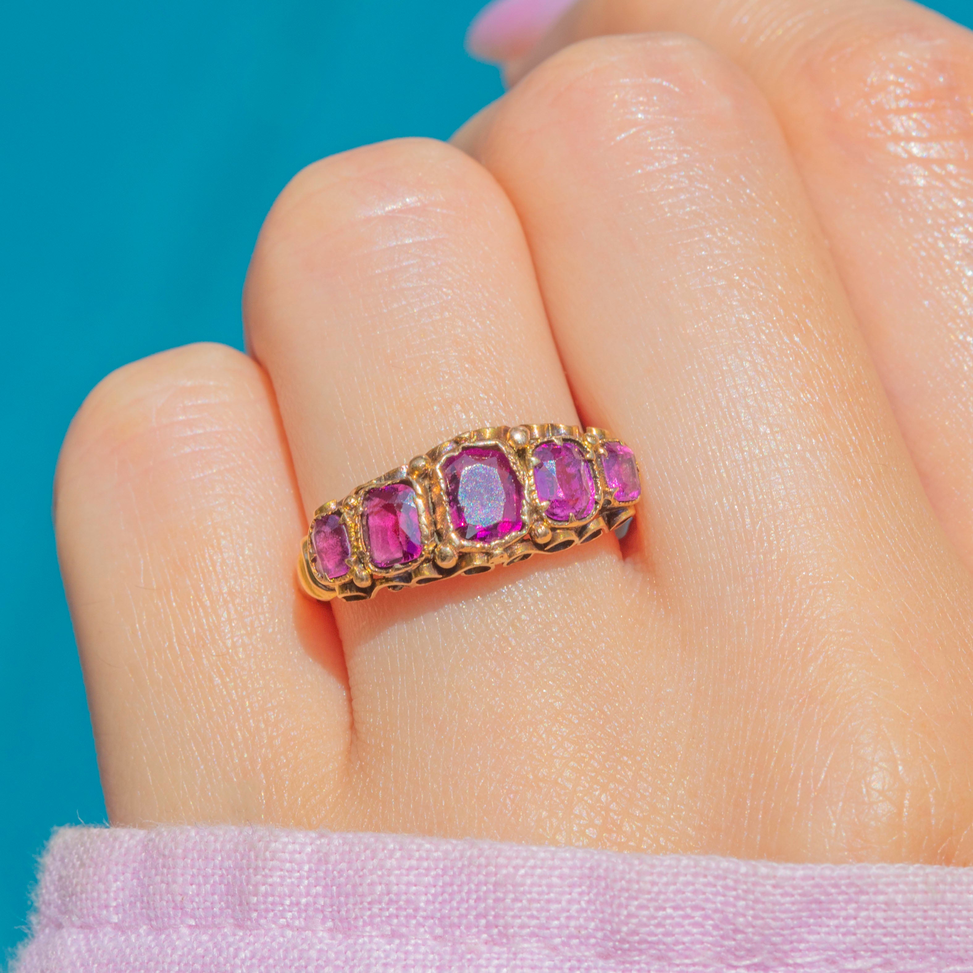 Victorian 15ct Gold Pink Rhodolite Garnet Five Stone Ring, 1.00ct