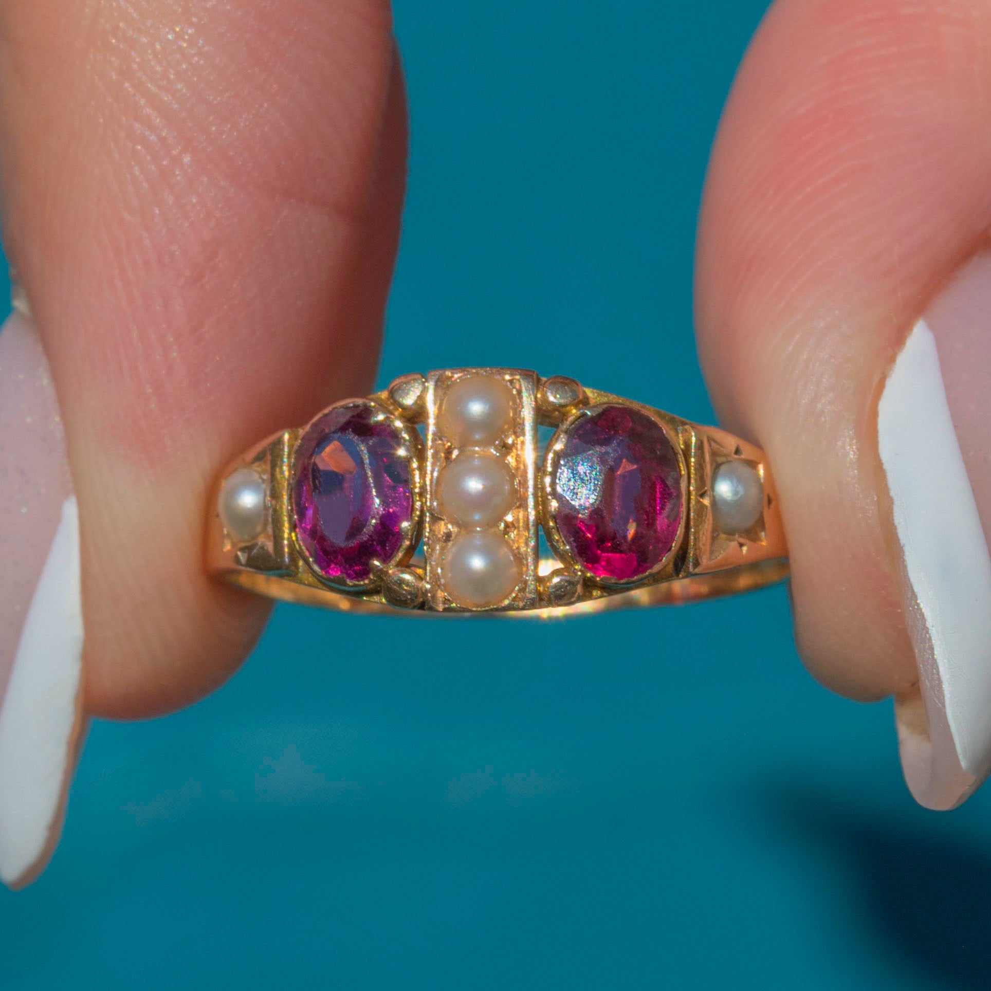 Victorian 15ct Gold Rhodolite Garnet Pearl Ring c.1879