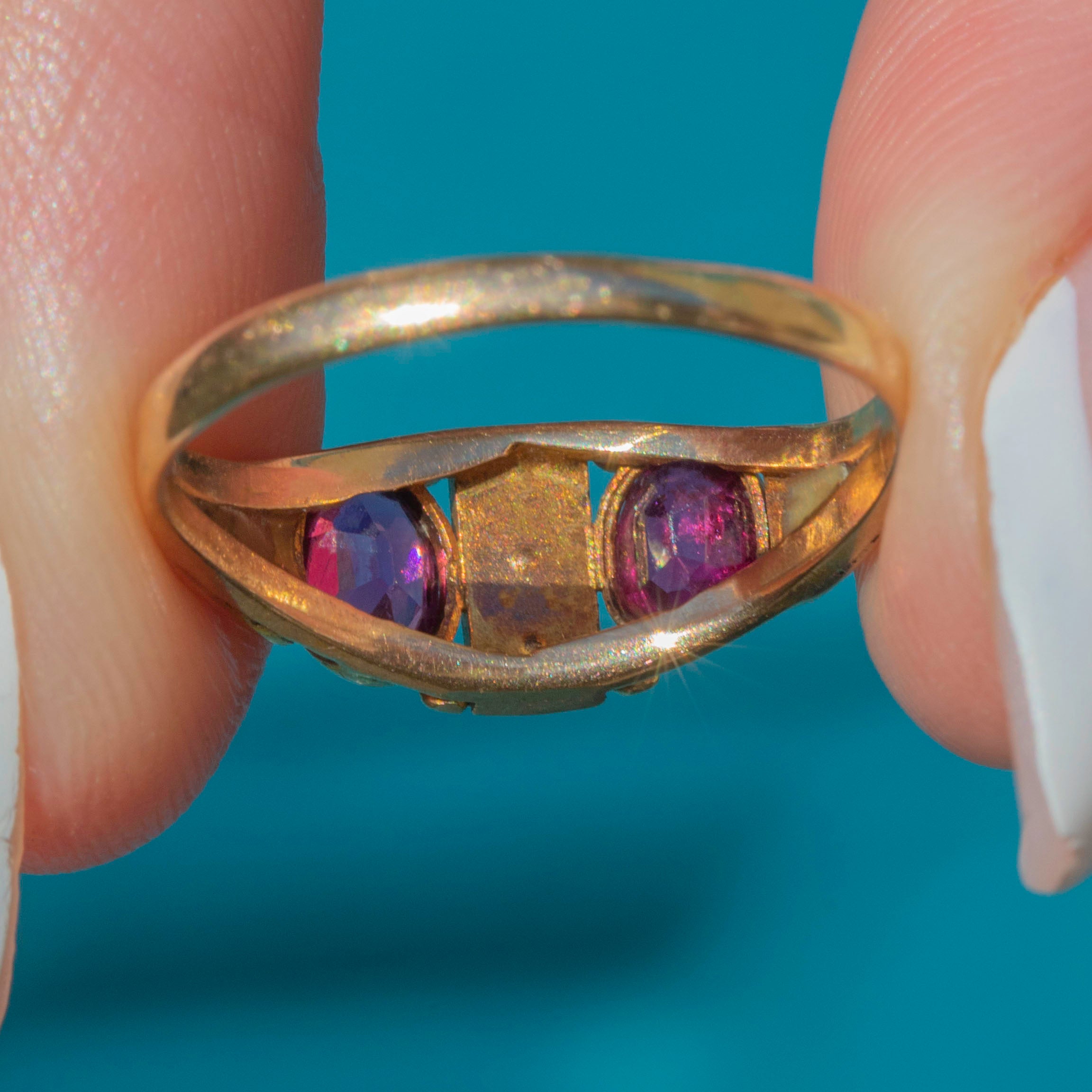 VERY GOOD: This Victorian 15ct Gold Rhodolite Garnet Pearl ring is in very good condition. The Gold is brightly saturated and the gemstones are all securely set. There is some mild age-related wear throughout, and a resize mark on the band, but this is only noticeable under close inspection and does not detract from the beauty of the piece. The ring has kept its form well and the hallmarks are fully legible, allowing us to accurately date this striking Victorian ring to 1879!