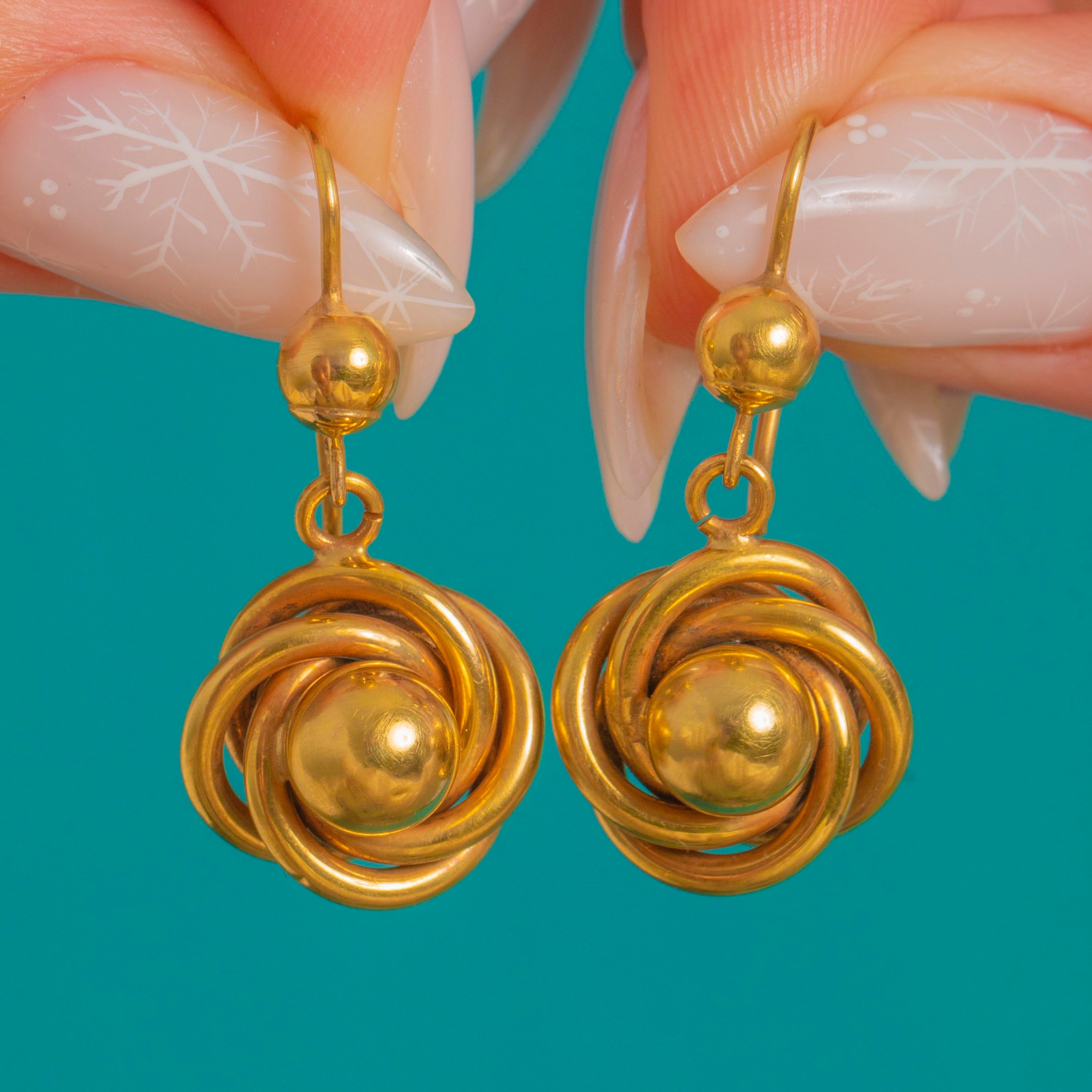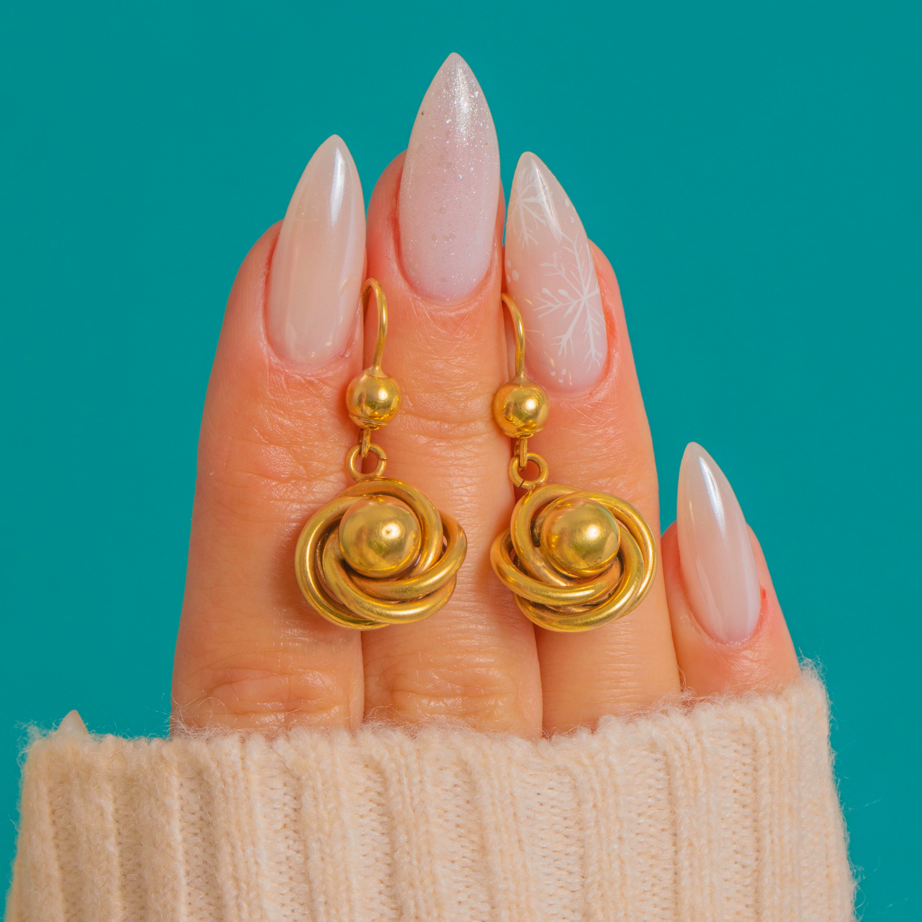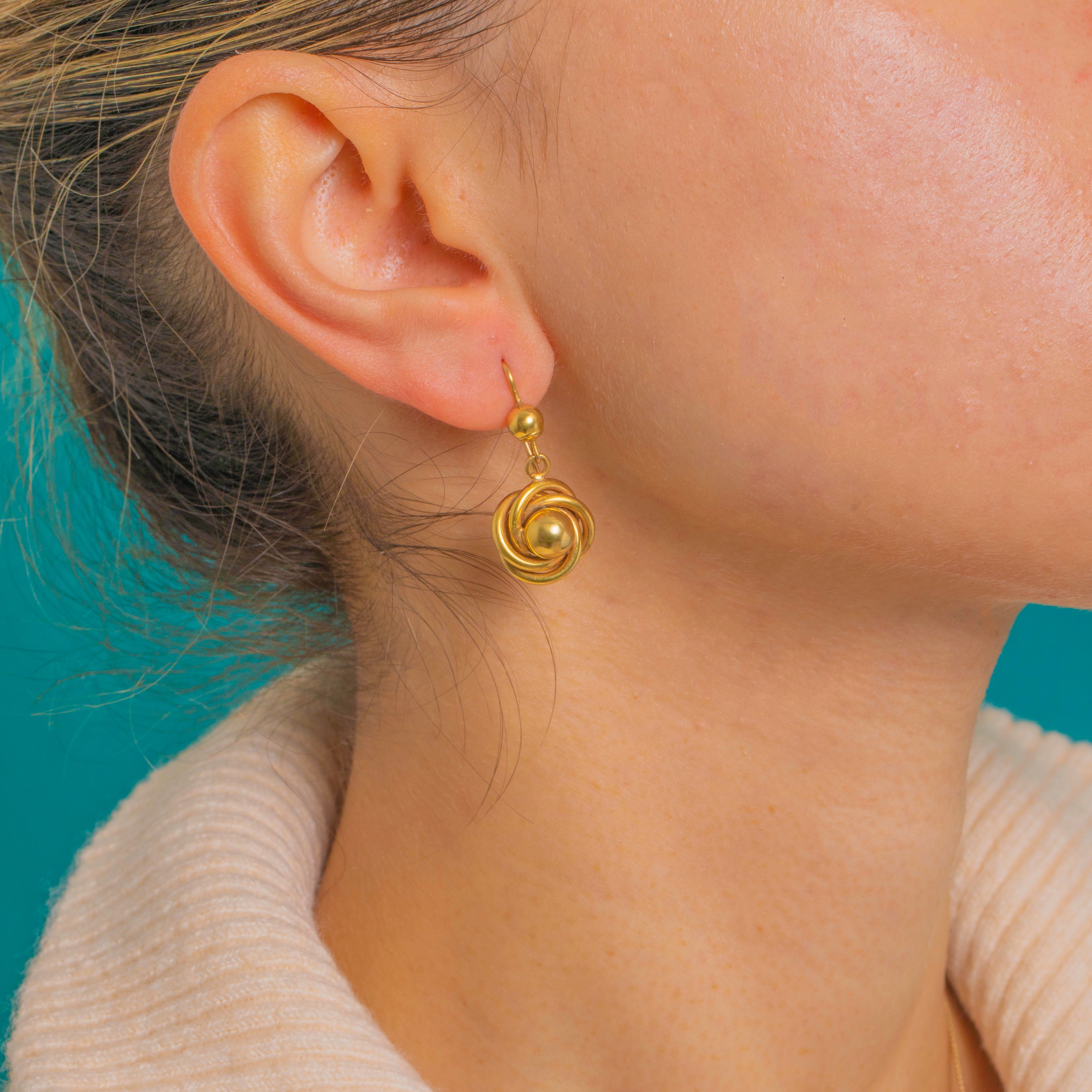 A sweet pair of Victorian love-knot earrings, beautifully modelled in rich 15ct Gold. Each compact rosette is formed by interlaced rounded loops that embrace a polished domed bead at the centre, catching the light with a soft, honeyed glow. Suspended from classic shepherd hooks, they sway delicately and feel timeless, romantic and effortlessly wearable.