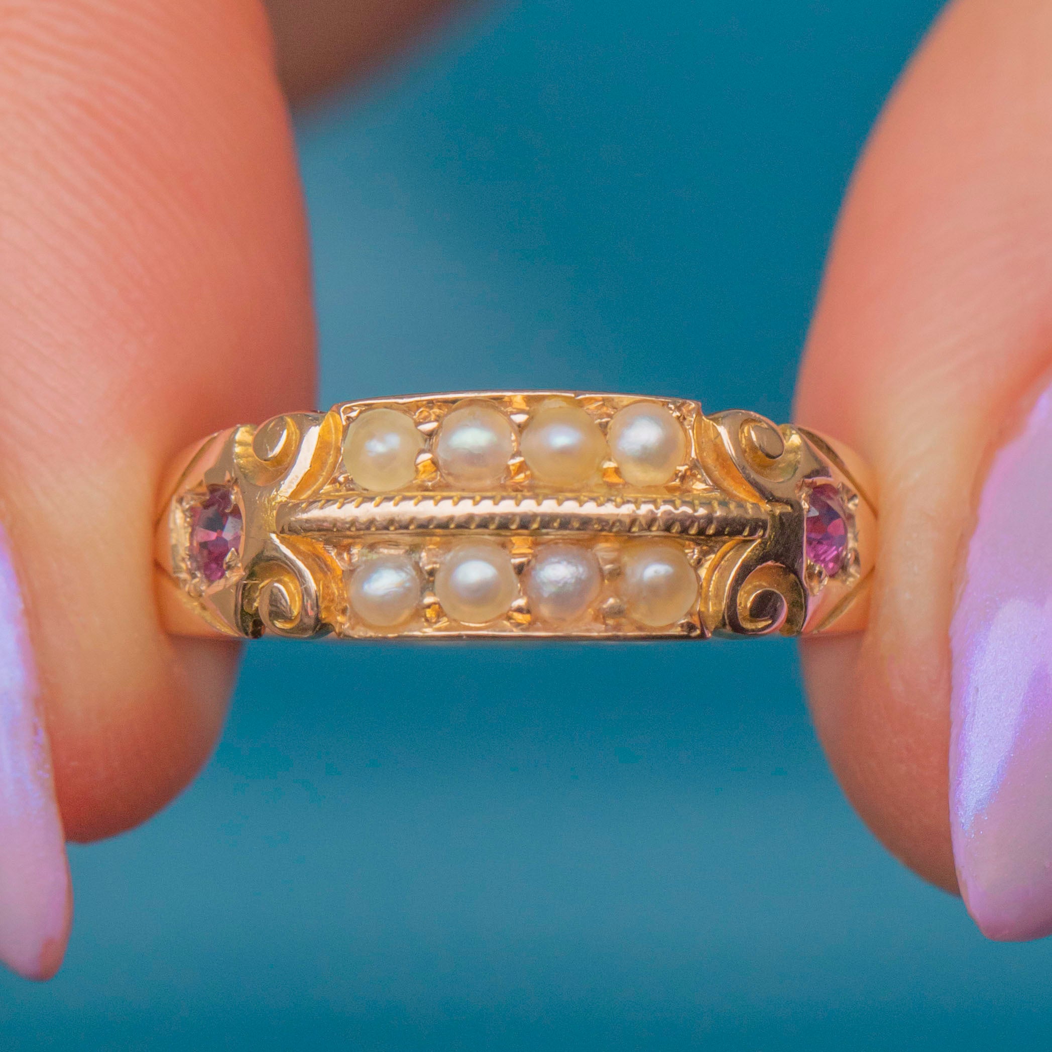 Victorian 15ct Gold Ruby Pearl Double Row Ring, c.1886