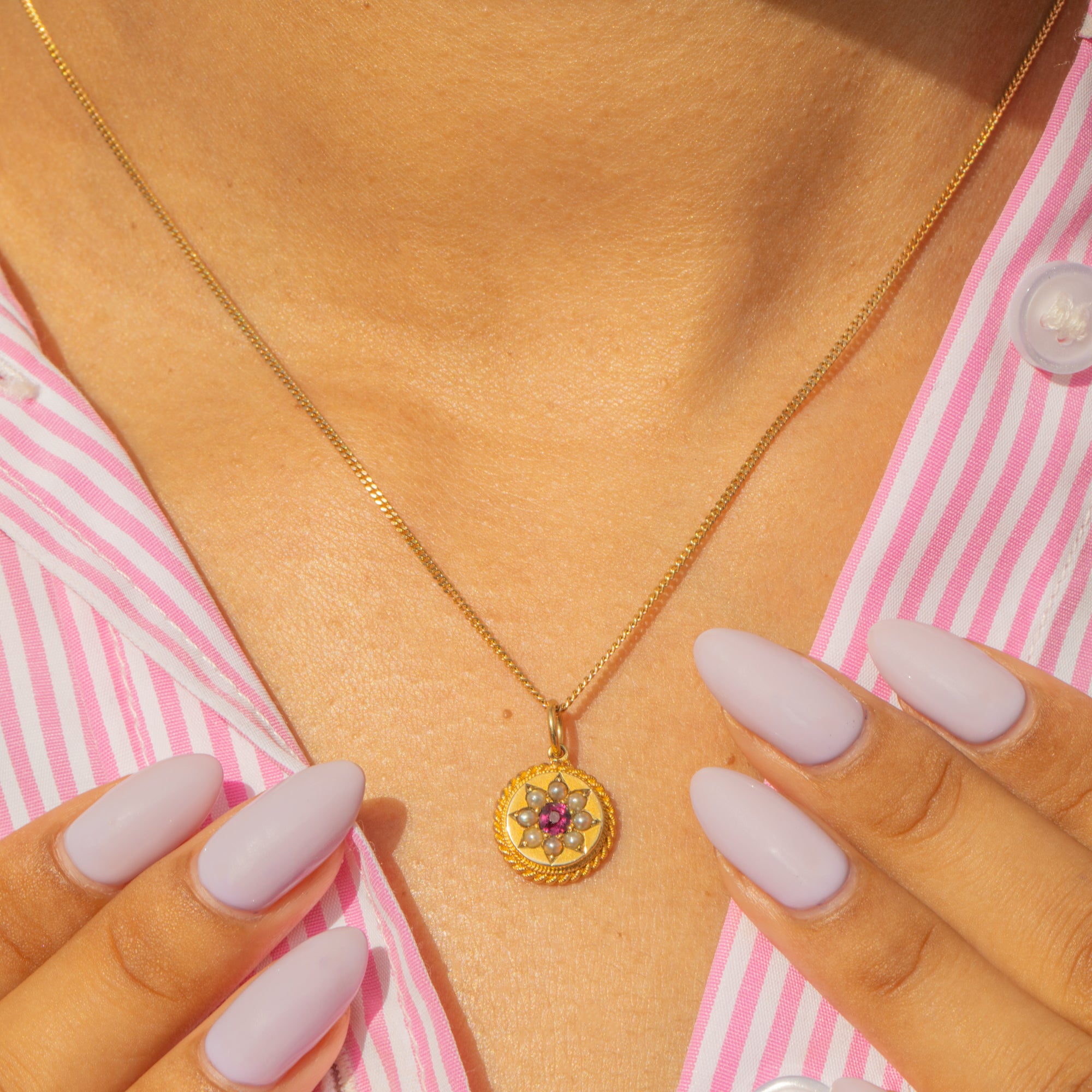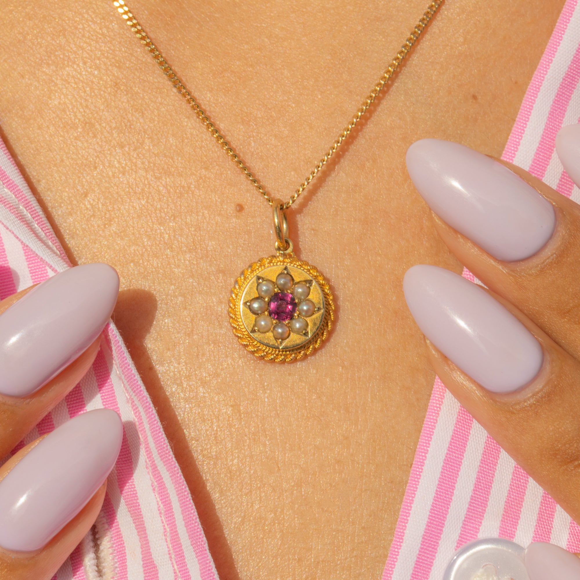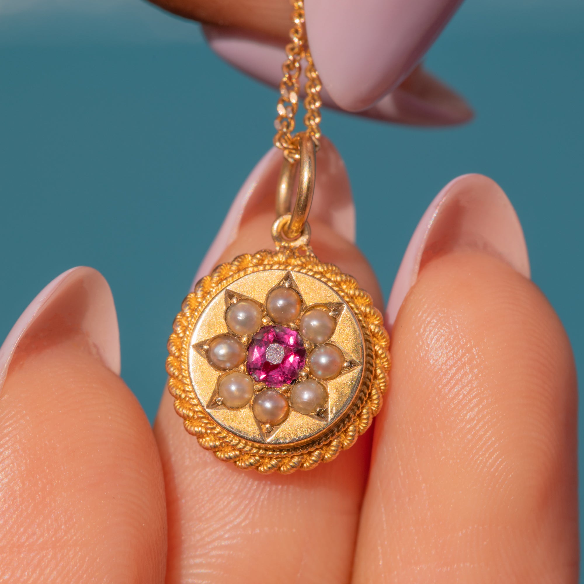 Framed within a decorative rope border, a fuschia-infused 0.30ct Ruby takes centre stage surrounded by creamy Pearls creating a mesmerising piece! This undeniably sumptuous Victorian pendant will add a regal touch to any attire!