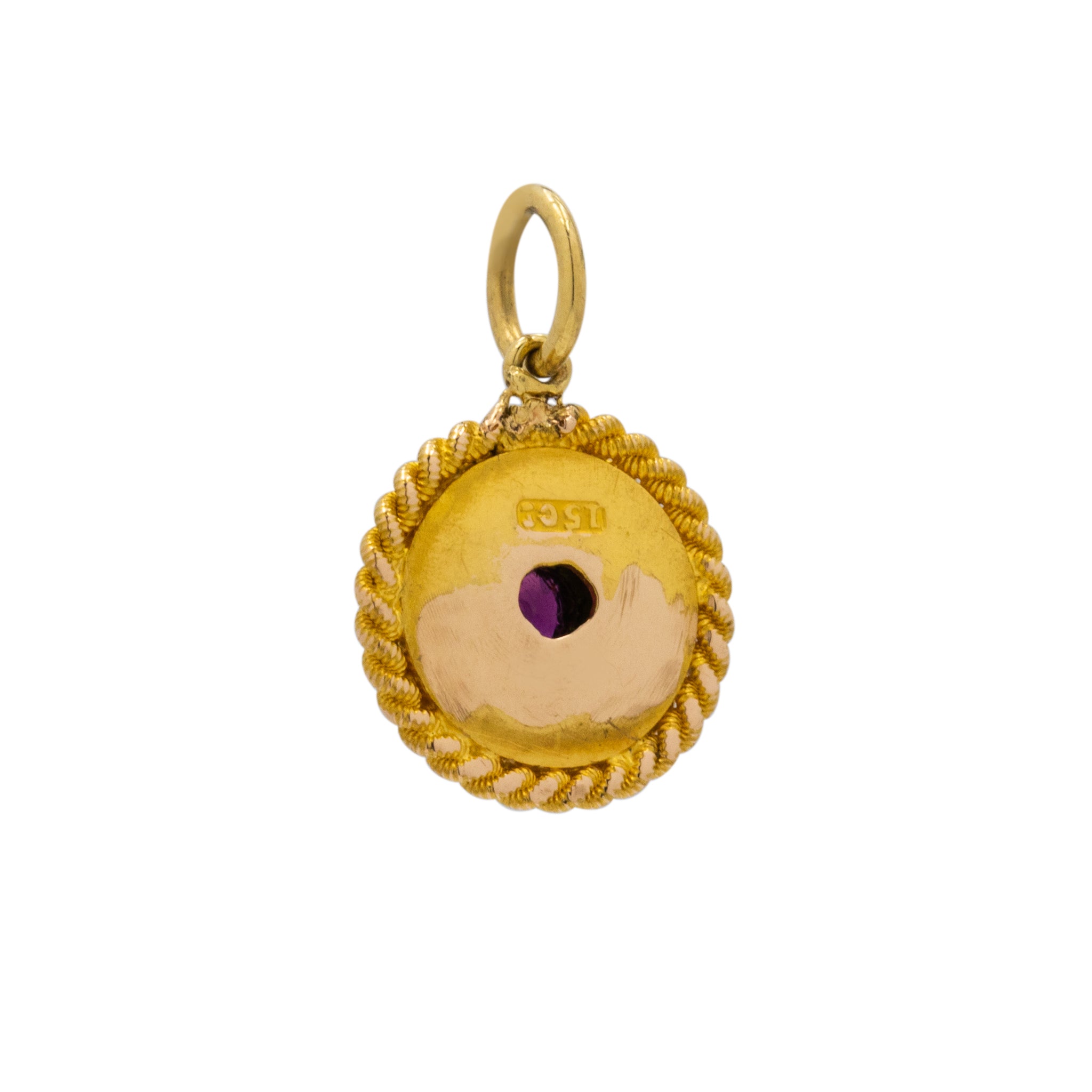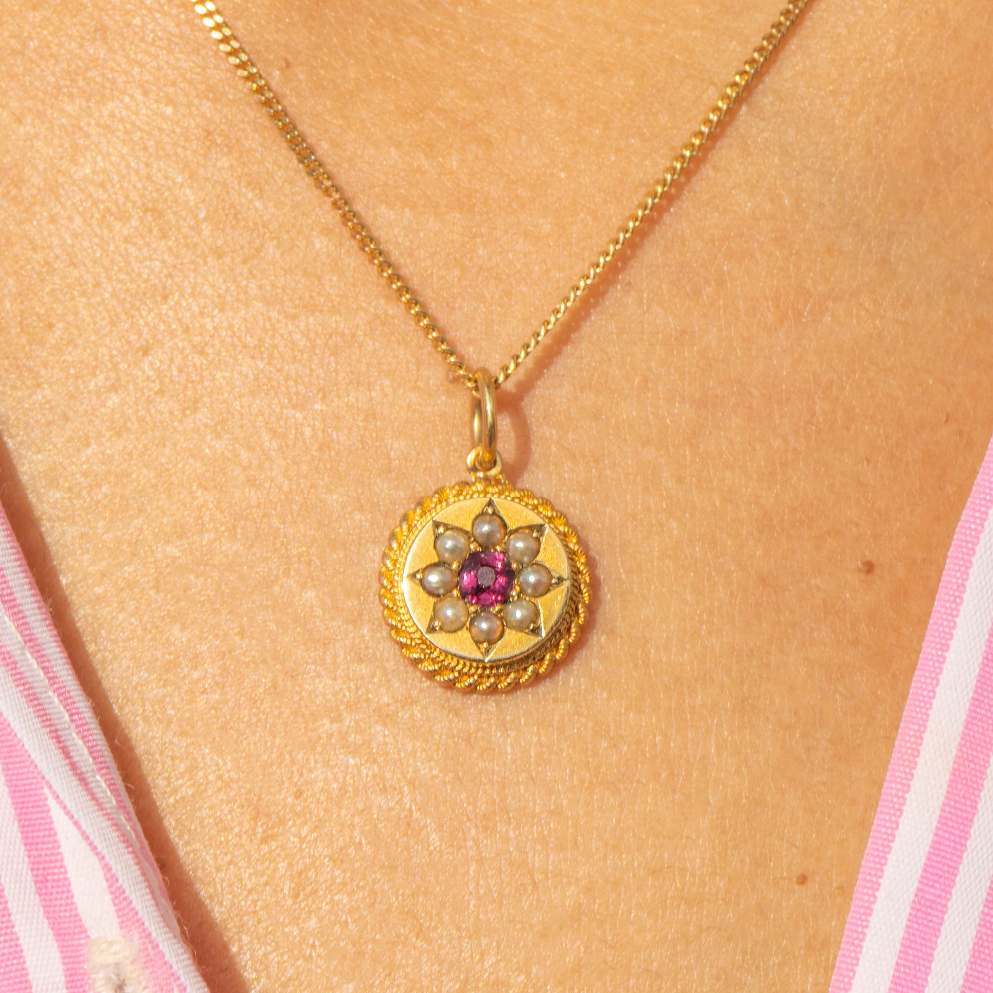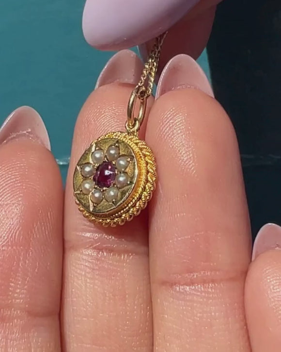 Framed within a decorative rope border, a fuschia-infused 0.30ct Ruby takes centre stage surrounded by creamy Pearls creating a mesmerising piece! This undeniably sumptuous Victorian pendant will add a regal touch to any attire!