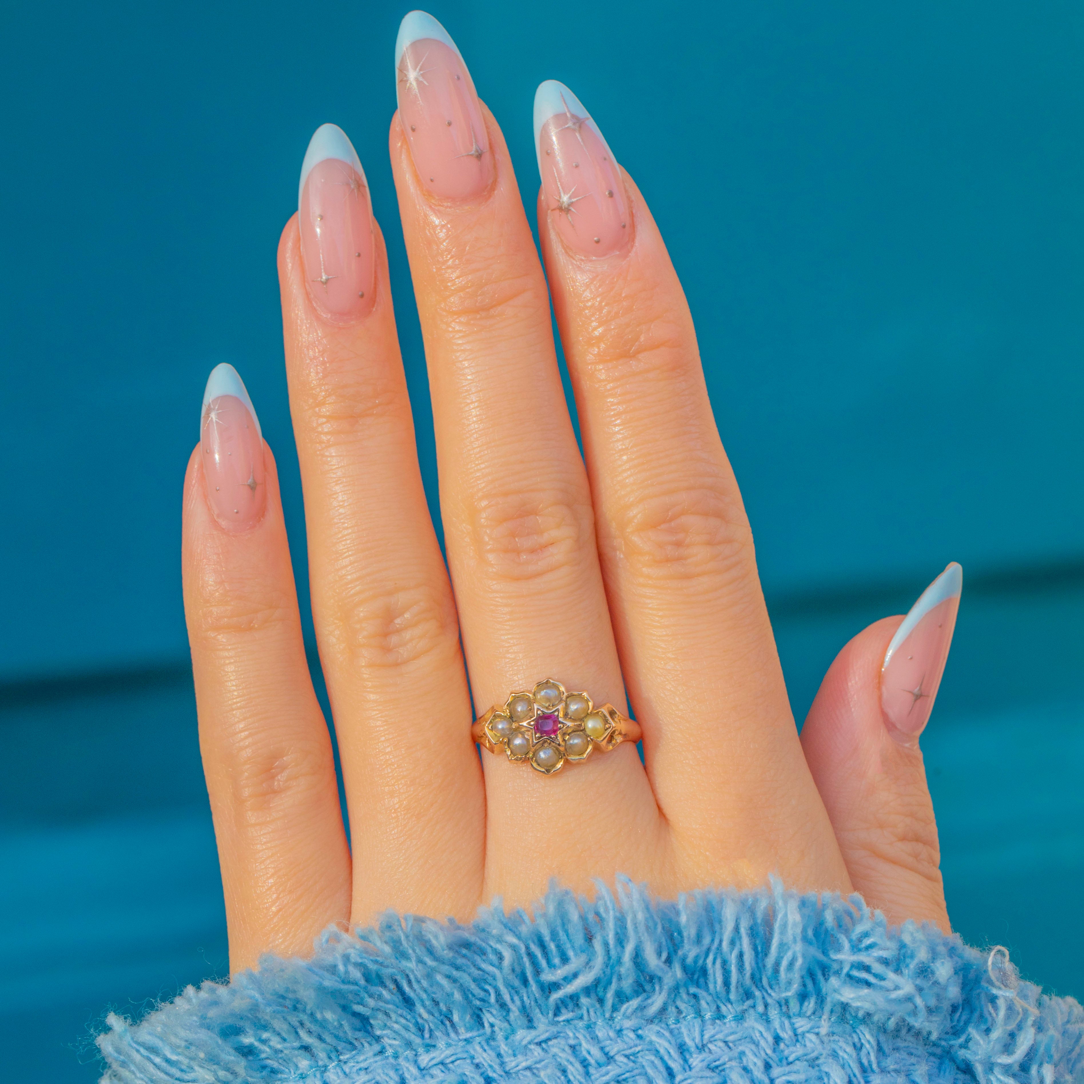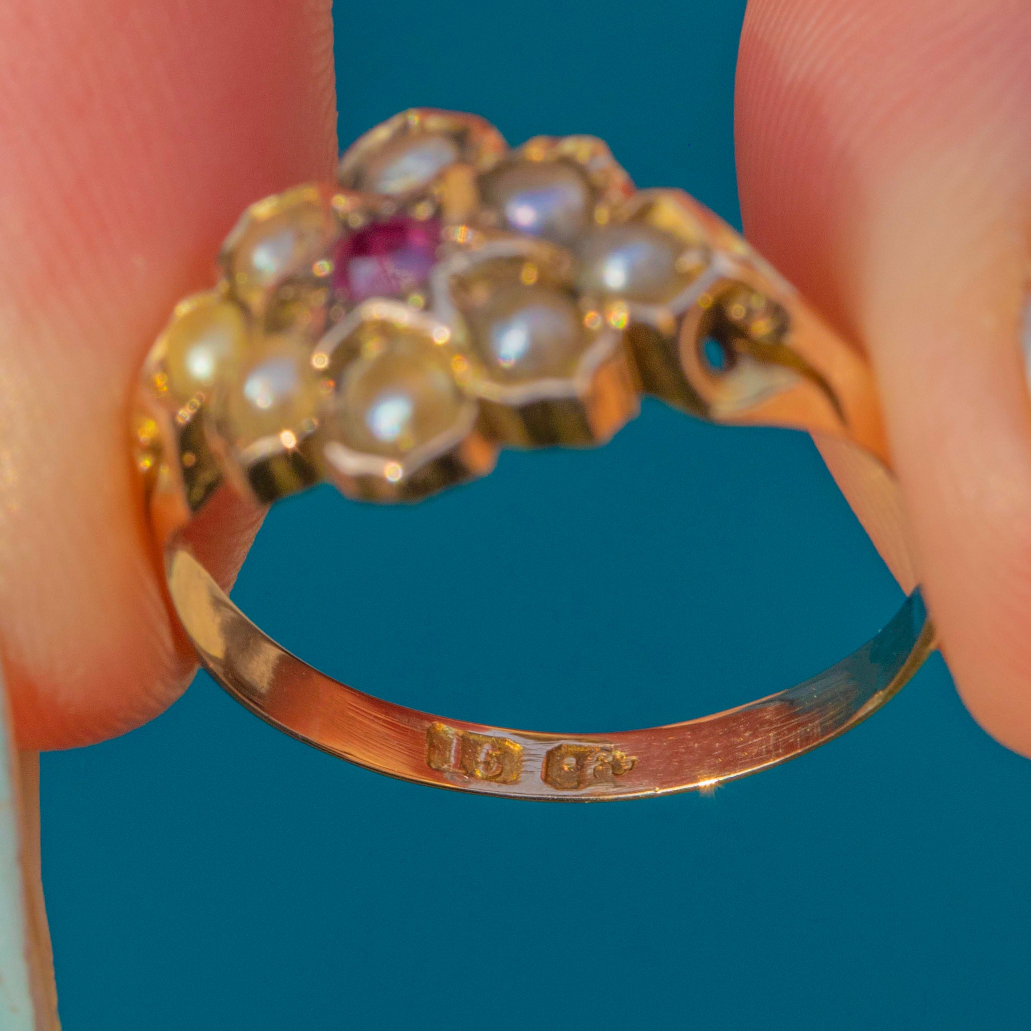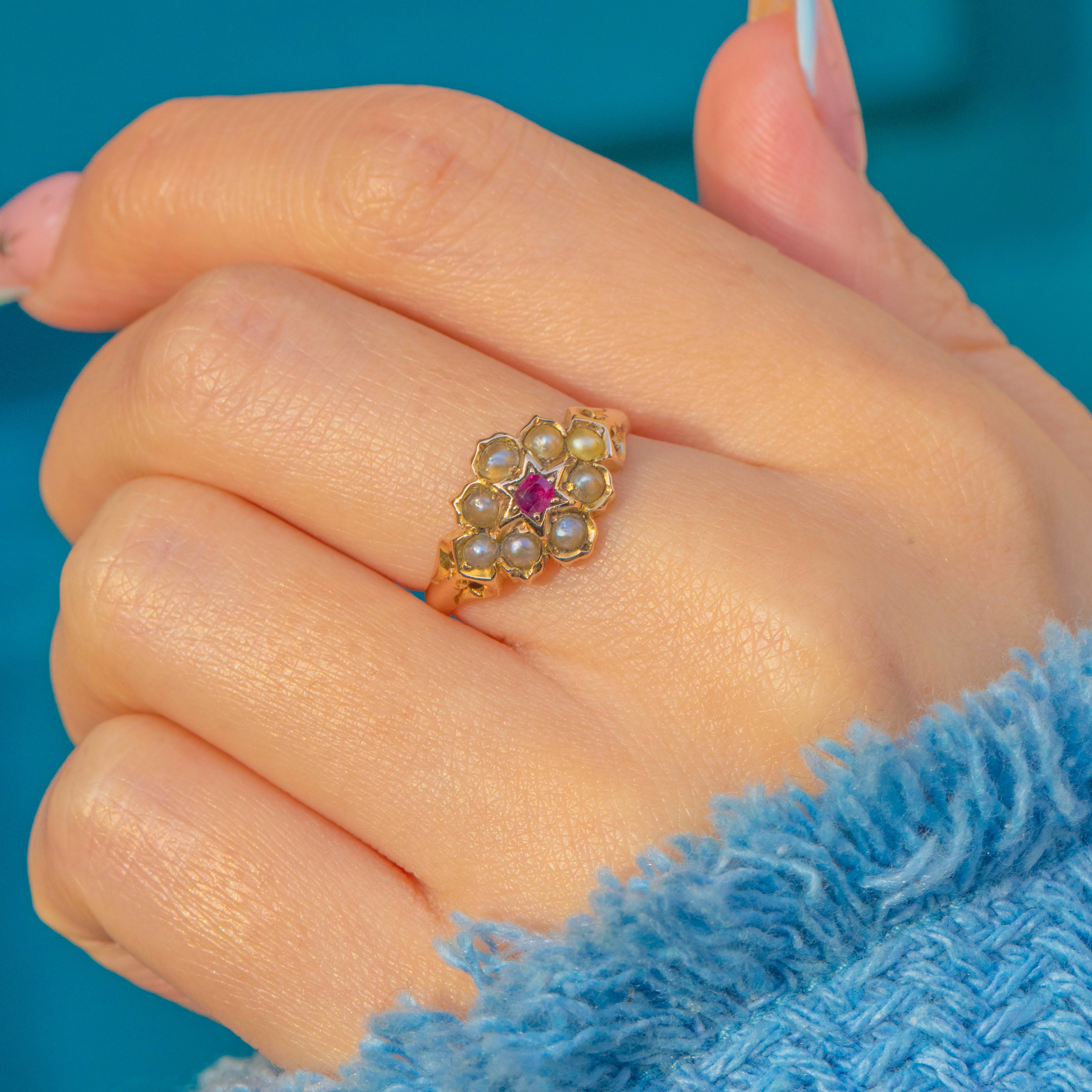A charming Victorian “star” cluster ring in rich 15ct Gold, set with a vivid pink-red Ruby encircled by a halo of creamy Seed Pearls. The scalloped collet cups create a delicate rosette that sits low on the finger for effortless, everyday elegance.