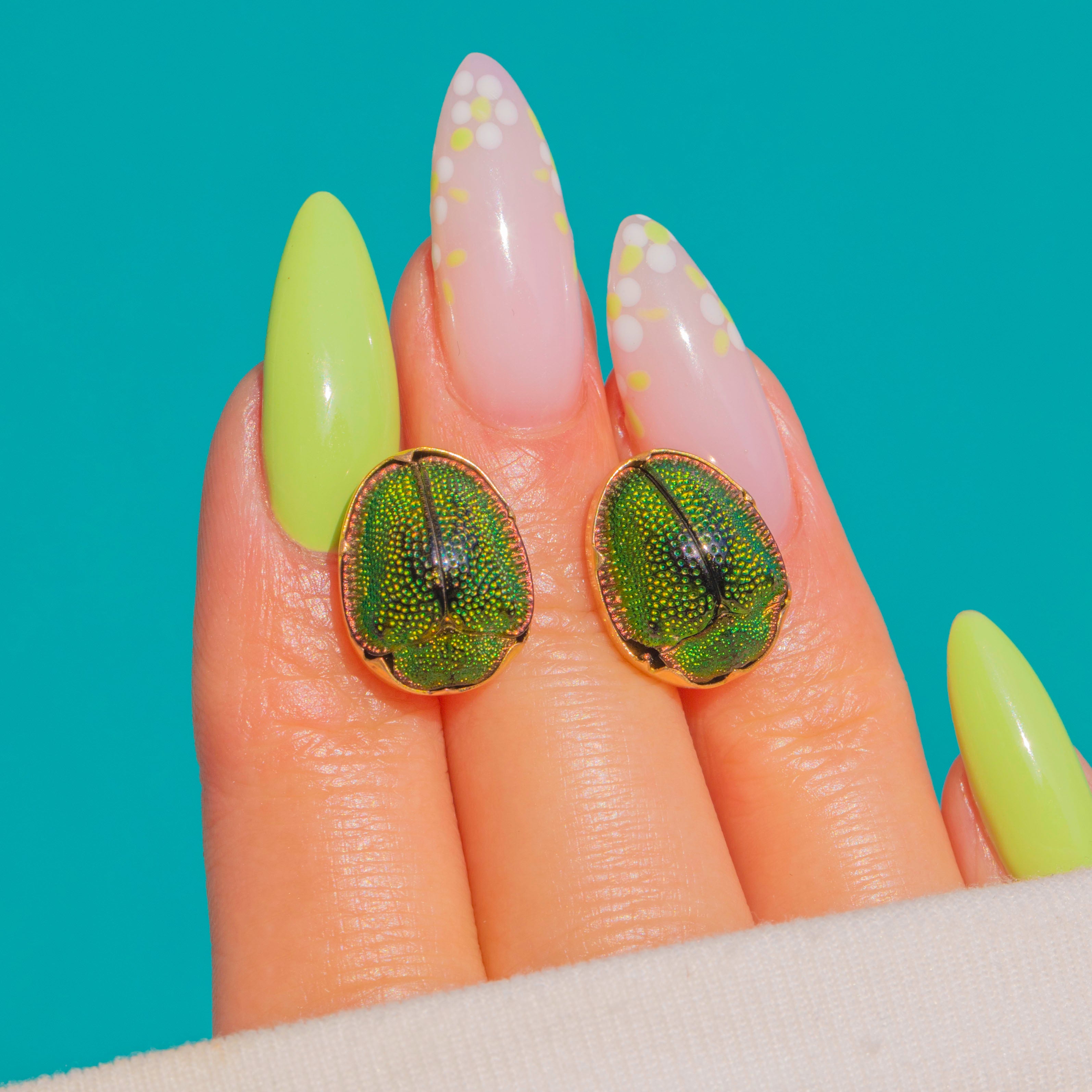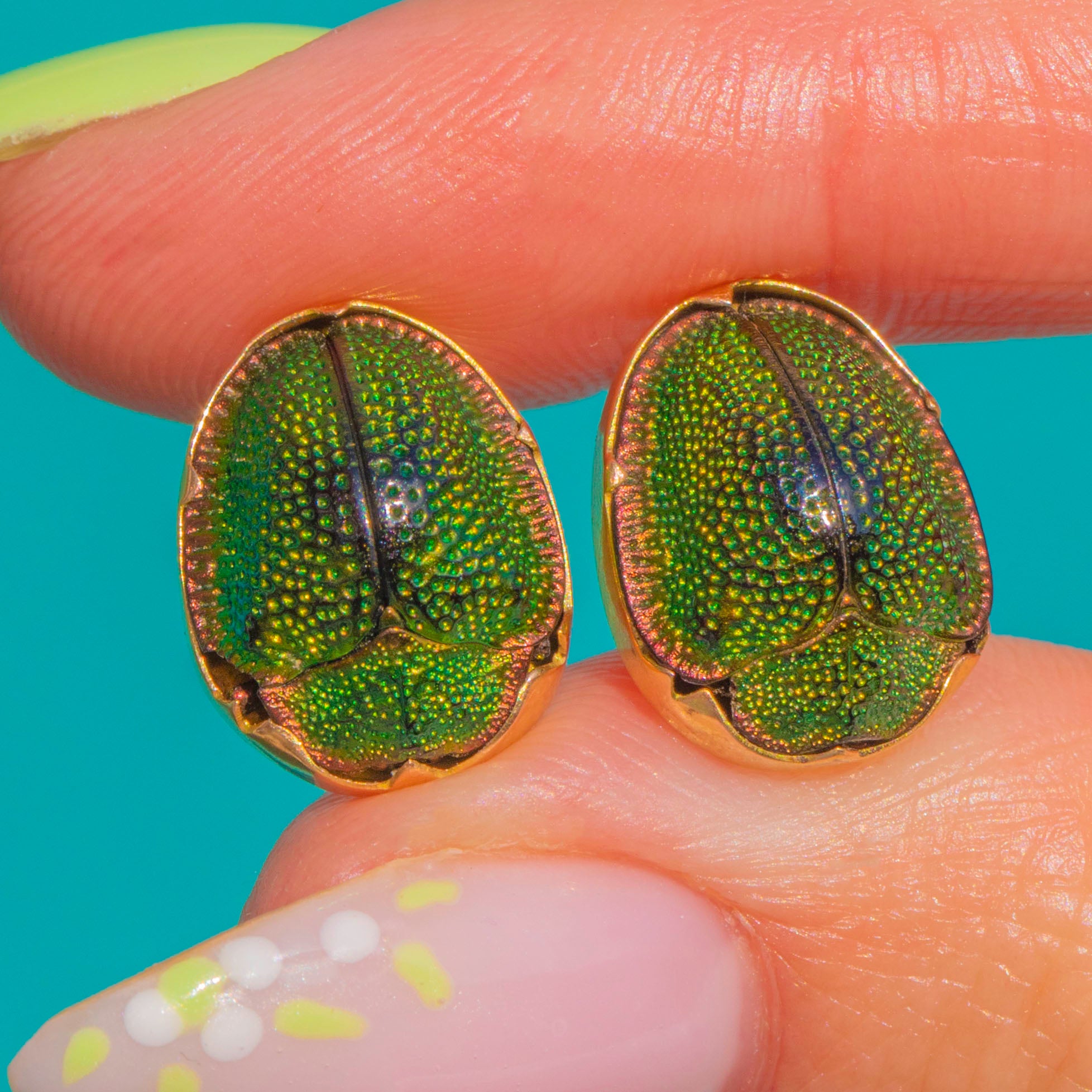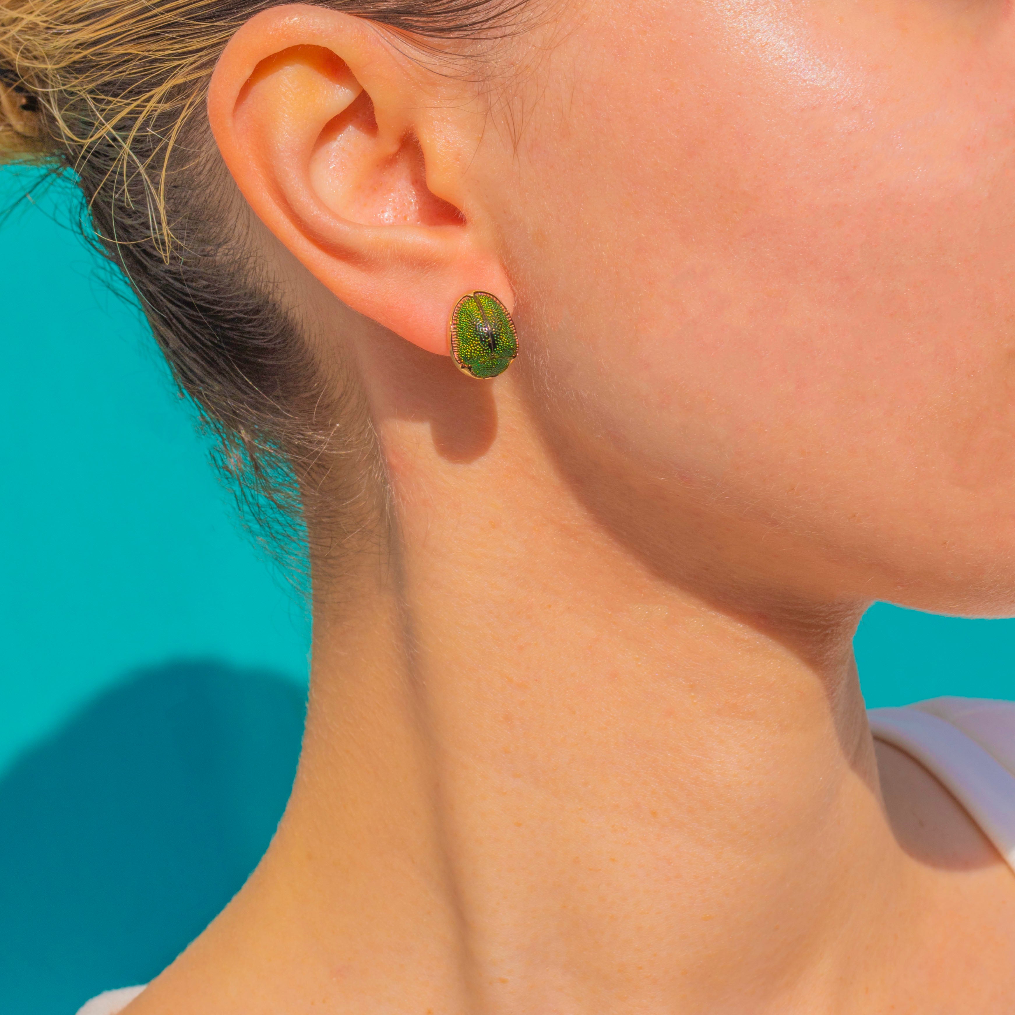 These Victorian Scarab earrings are a charming ode to nature, rendered in glowing 15ct Gold. Each petite beetle is richly coloured with luminous green tones and a sculptural domed profile, the fine bezel setting adding a refined golden frame that enhances their vivid sheen.
