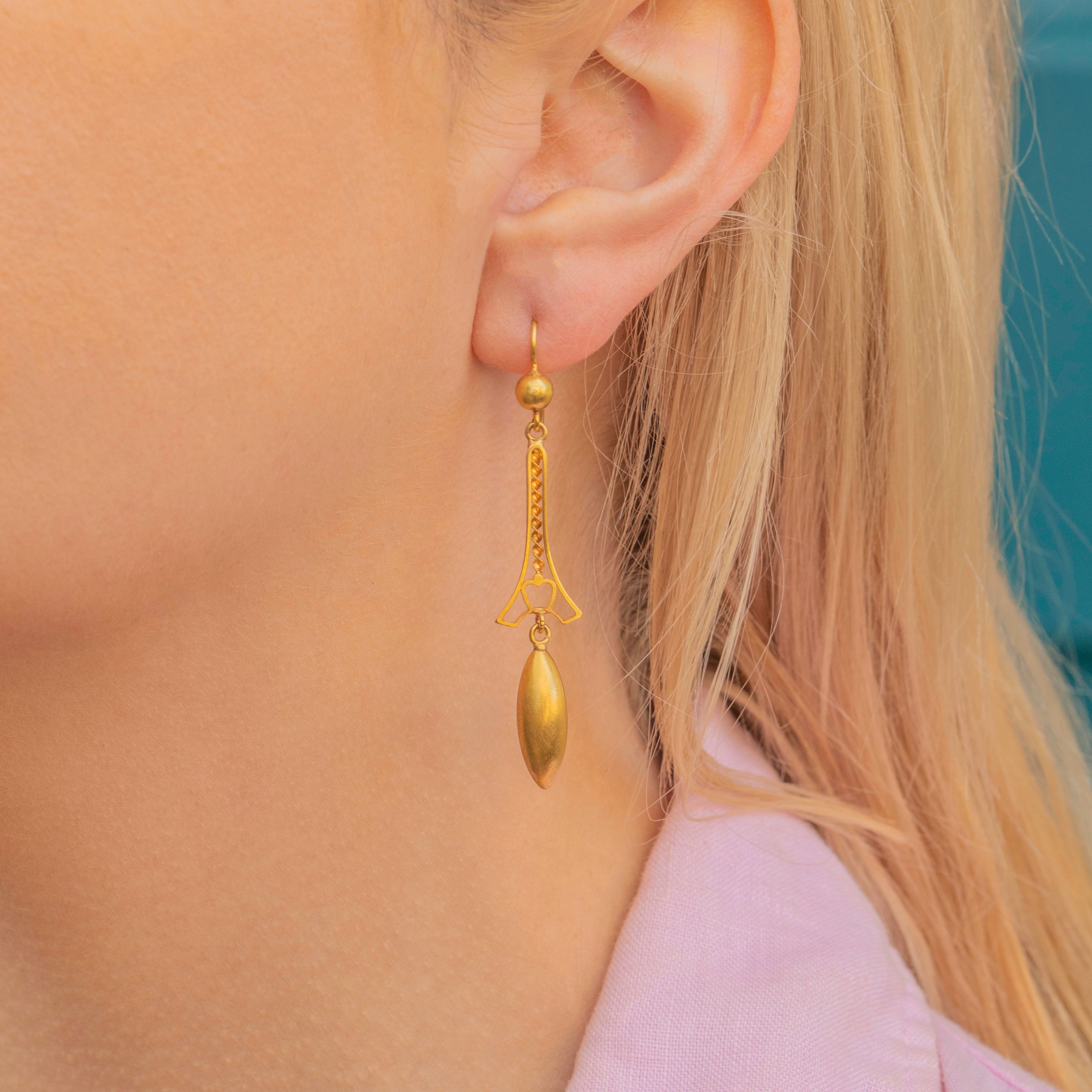VERY GOOD-EXCELLENT. These Victorian 15ct Gold Torpedo drop earrings are in great condition. Beautifully crafted, their intricate design has stood the test of time with each component securely affixed. There are some minor signs of wear to the earrings commensurate with age, however, this is not noticeable while wearing. The Gold is brightly saturated and the slender hooks provide comfortable wear. In such great condition, these earrings are a real treat!