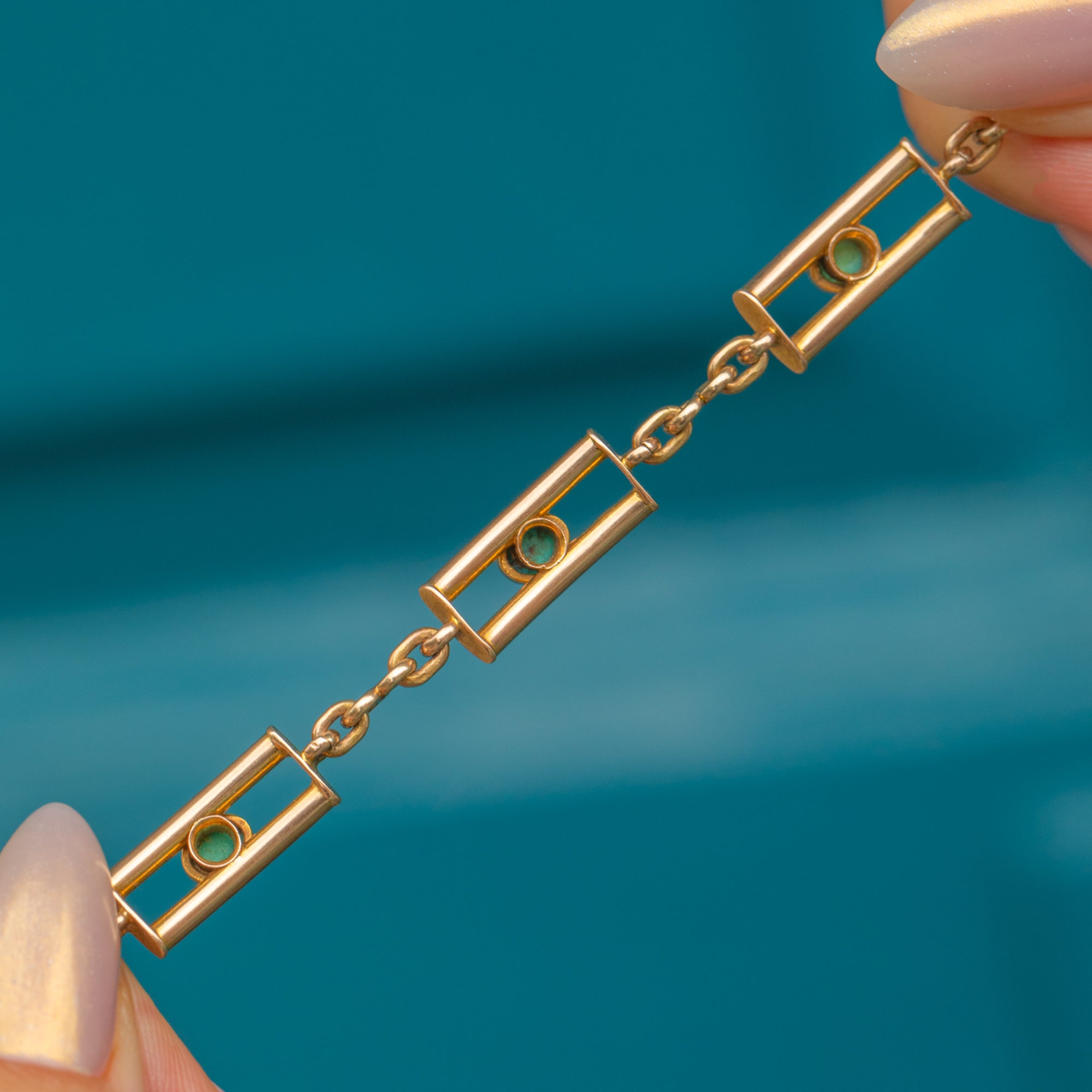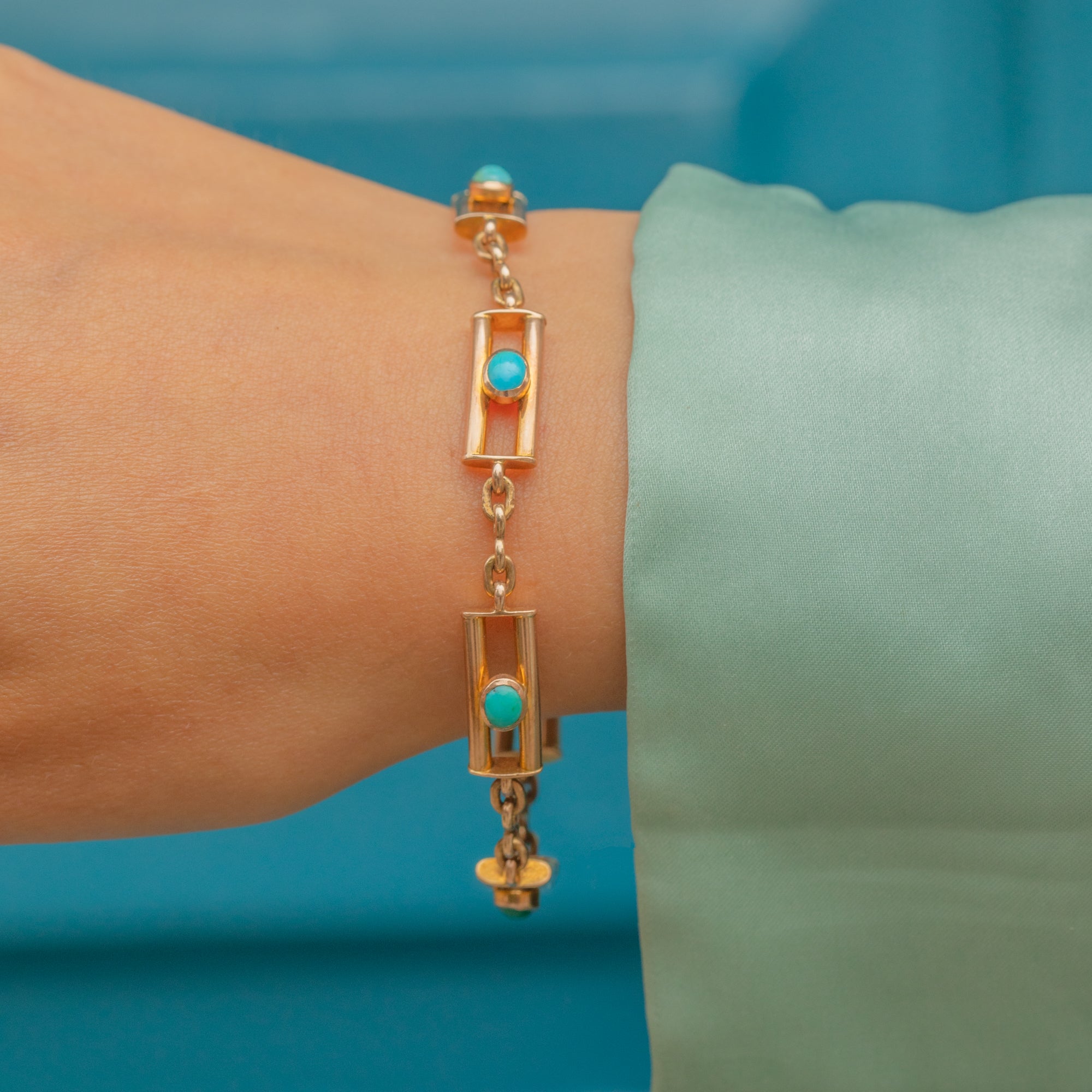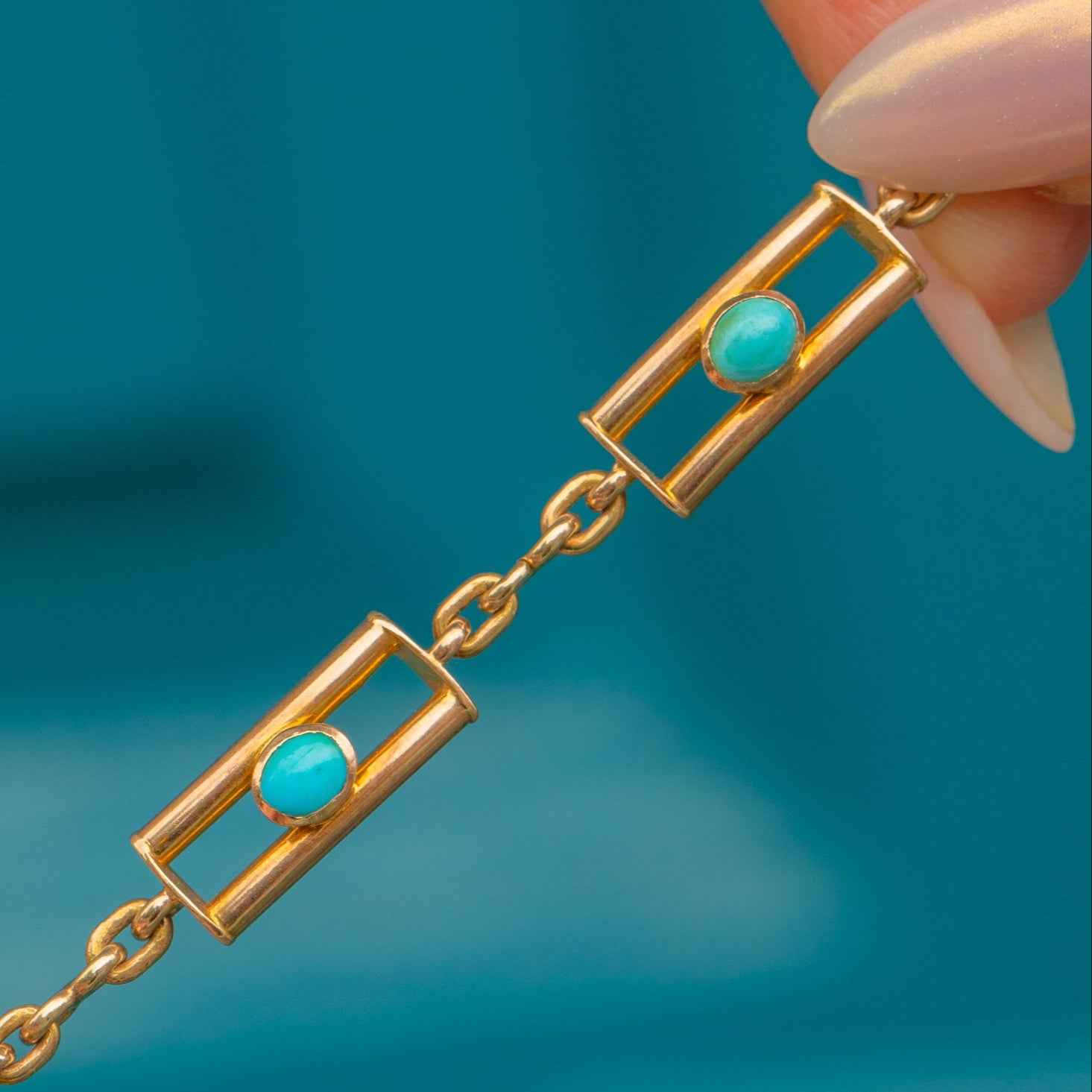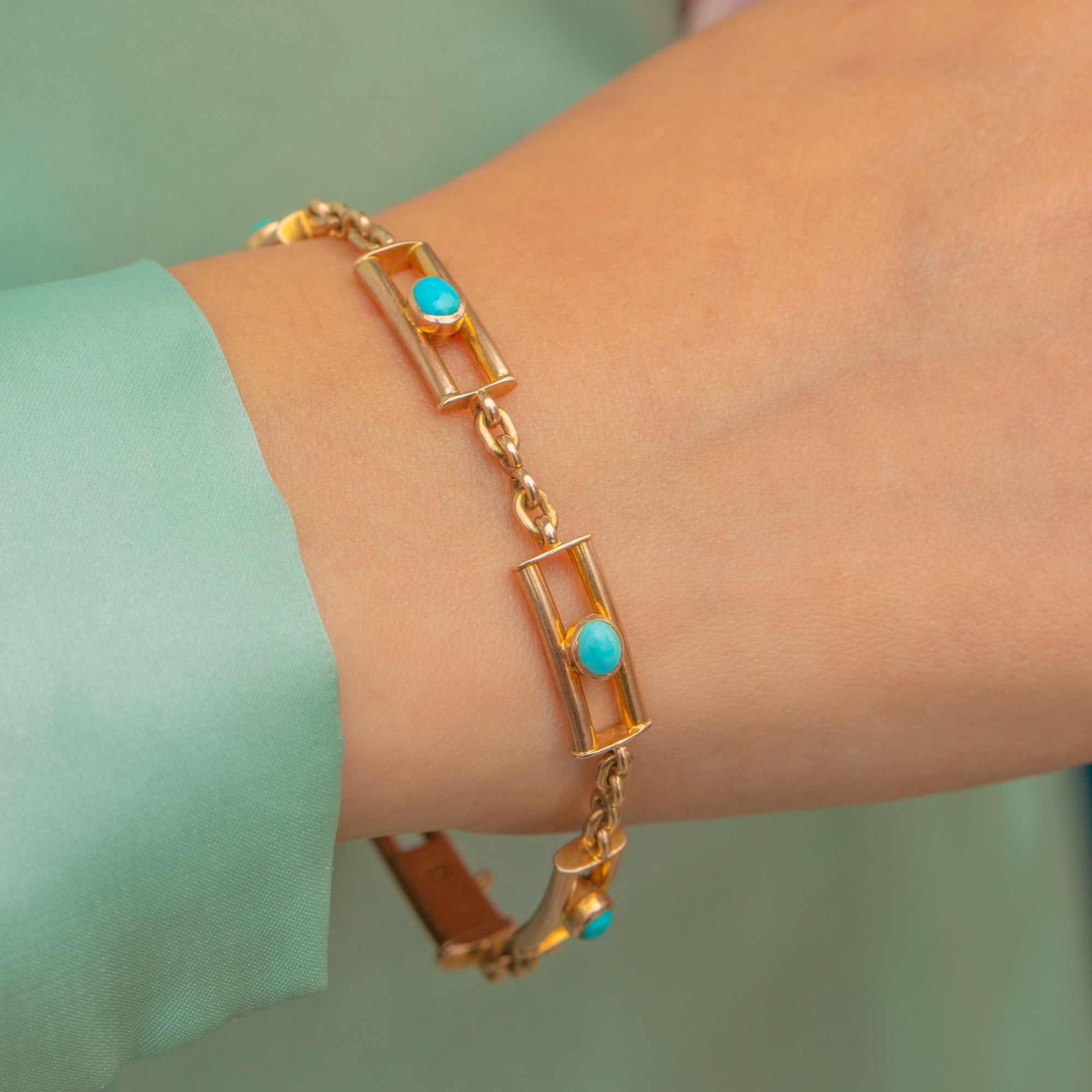 This Victorian bracelet is crafted in buttery 15ct Gold and set with bright natural Turquoise cabochons.