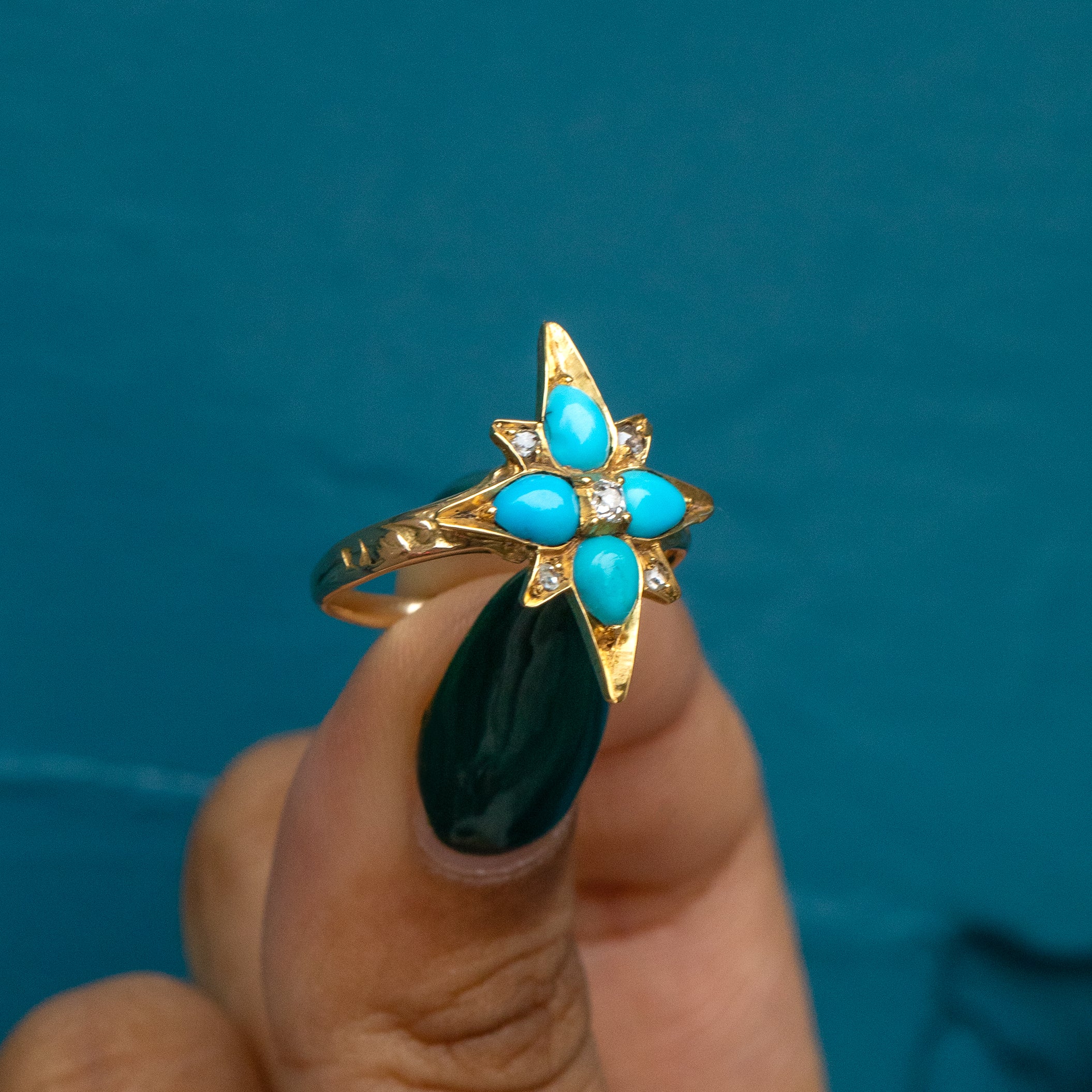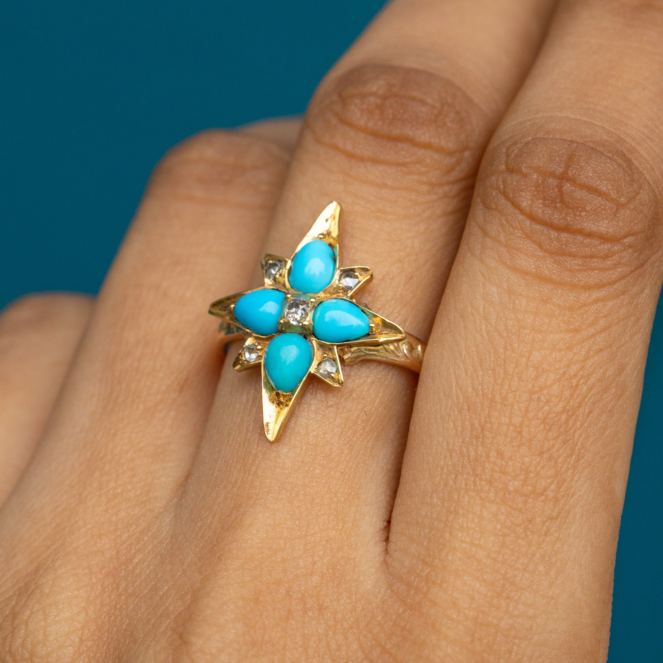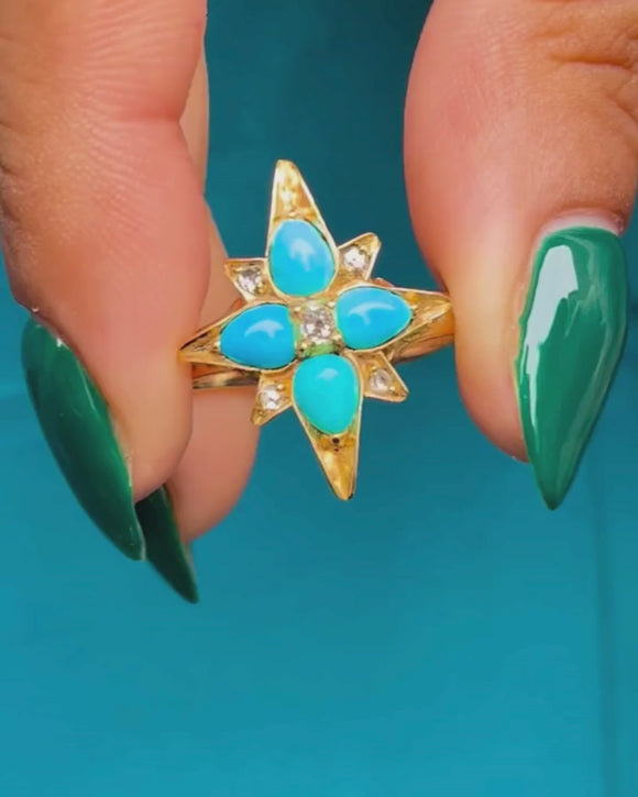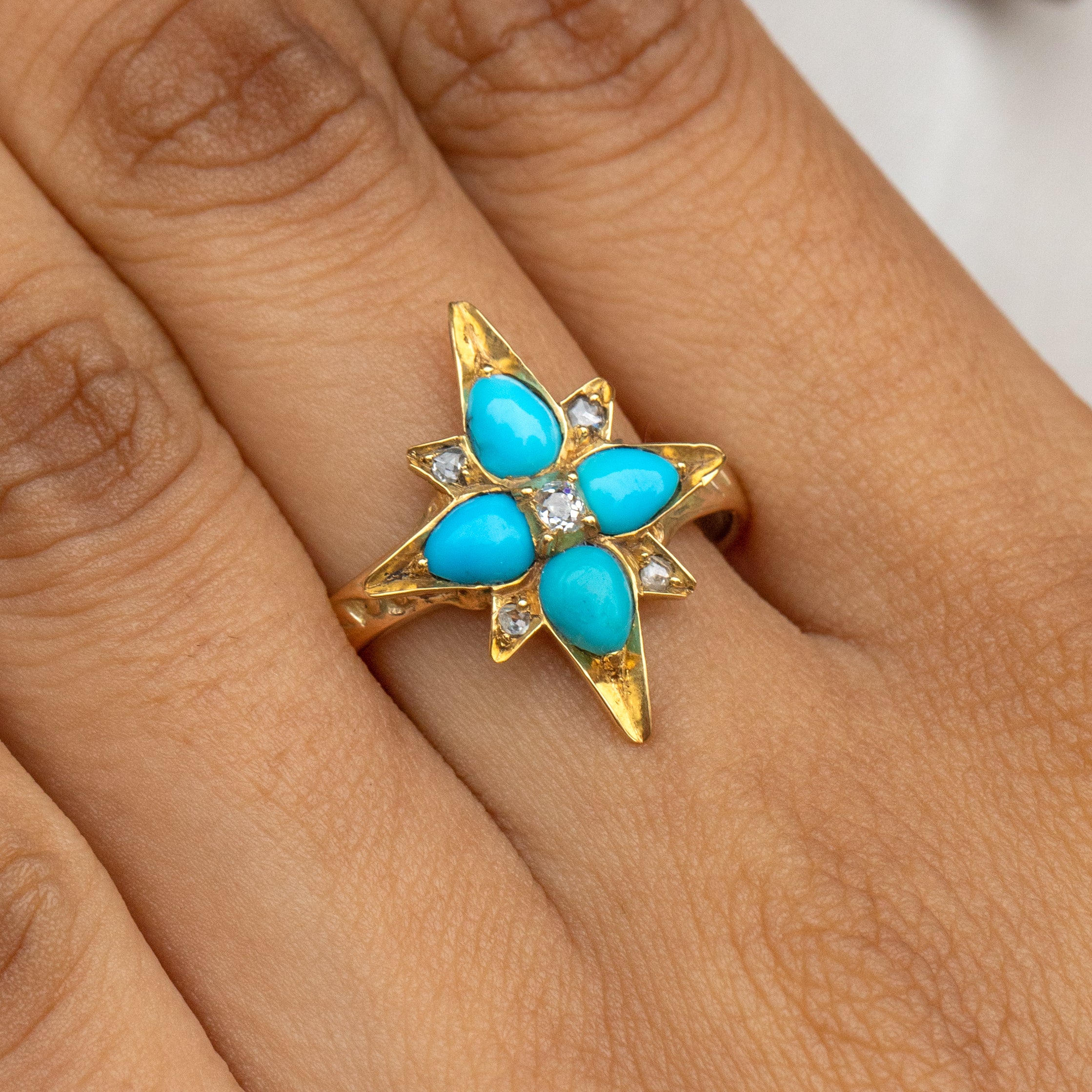 EXCELLENT. This Victorian 15ct Gold Turquoise Diamond star ring is in exquisite condition! The 15ct Gold is saturated and smooth to the touch, free from dents or signs of wear. The gemstones are all free from nibbles and securely held within their settings. The ring has retained its structural integrity incredibly well and the robust band will provide you with years of wear and enjoyment!
