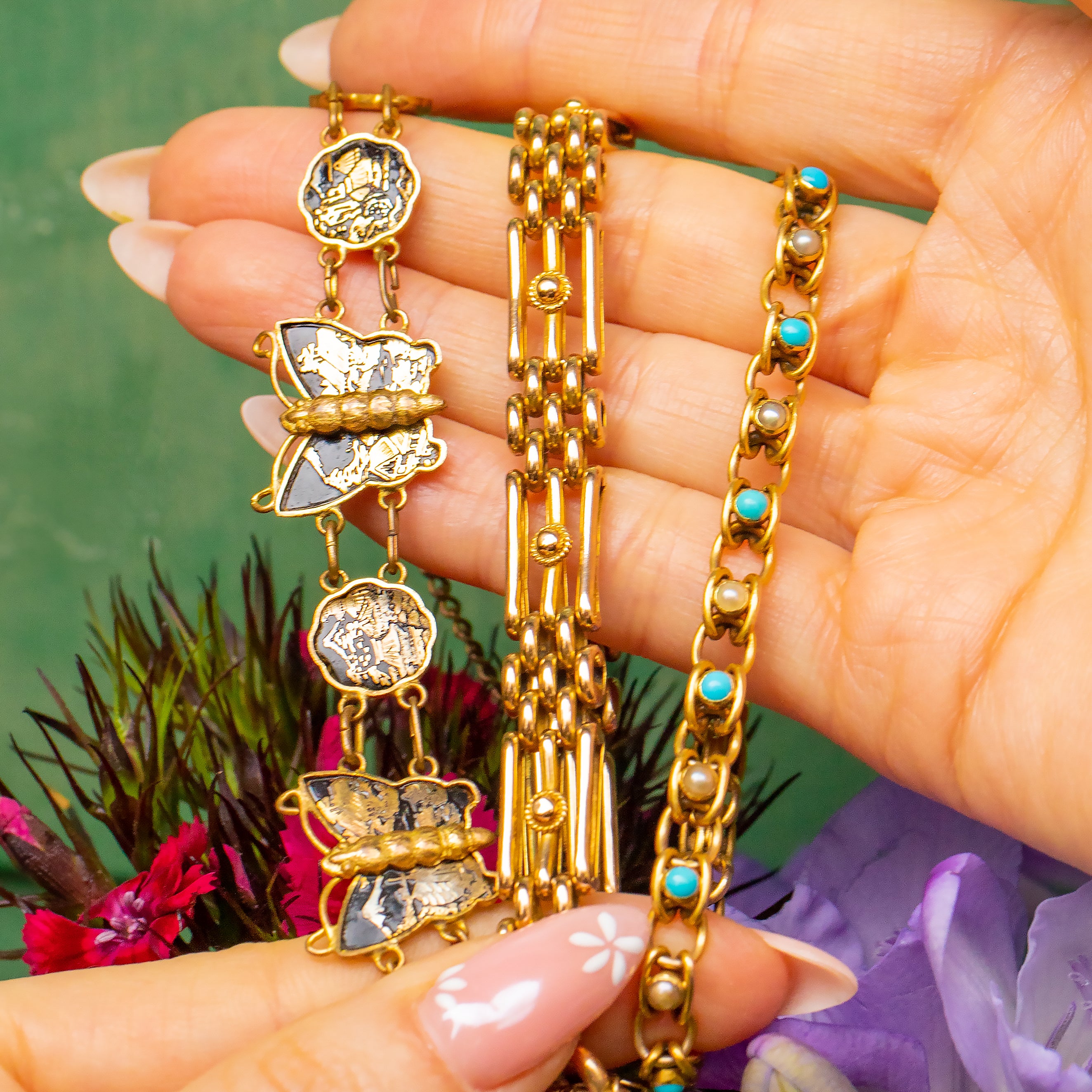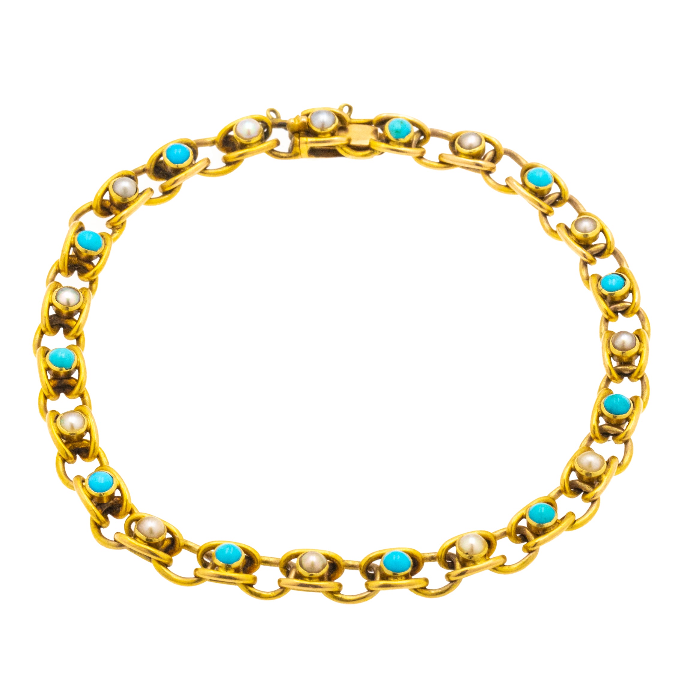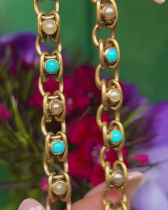 EXCELLENT. This Victorian 15ct Gold Turquoise Pearl bracelet is in excellent condition. The links on the bracelet are smooth, securely attached, and have remained robust. The Pearls and Turquoise are secure and each one has its own unique hue, an homage to their natural heritage. The bracelet closes securely and can be worn confidently. There are two discreet hoops near the clasp, where a safety chain was once attached, but this is no longer the case - if you'd prefer extra peace of mind we can organise a safety chain to fit with the piece, just get in touch to discuss it further!
