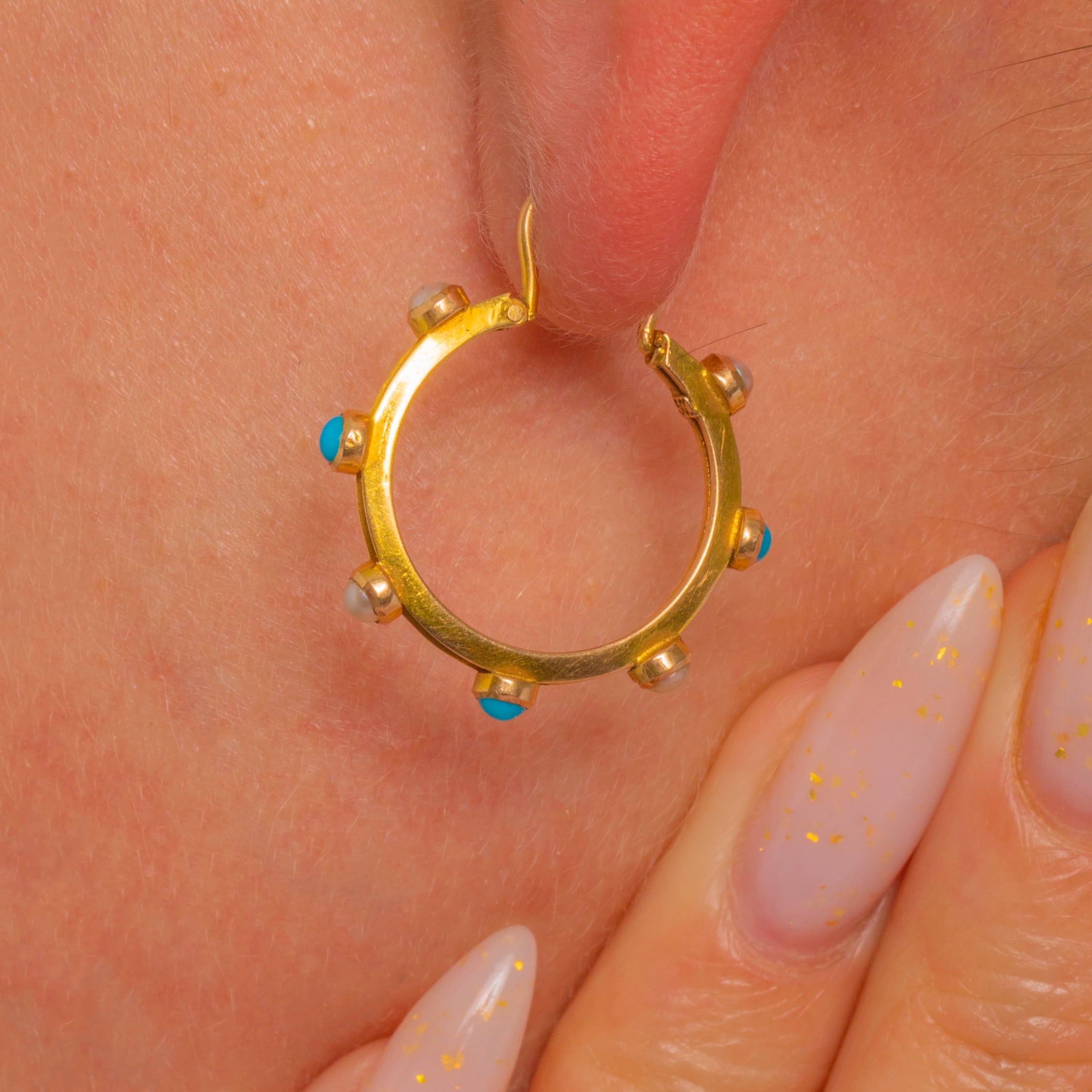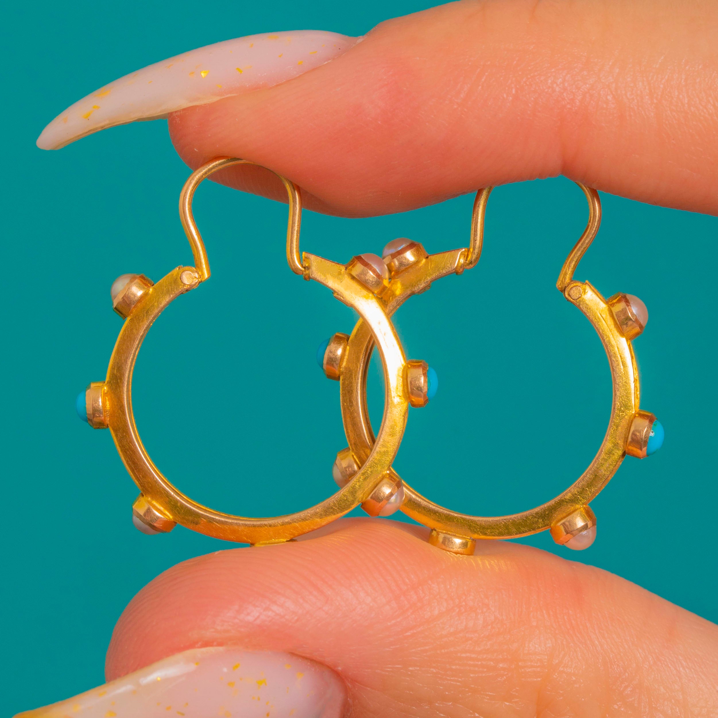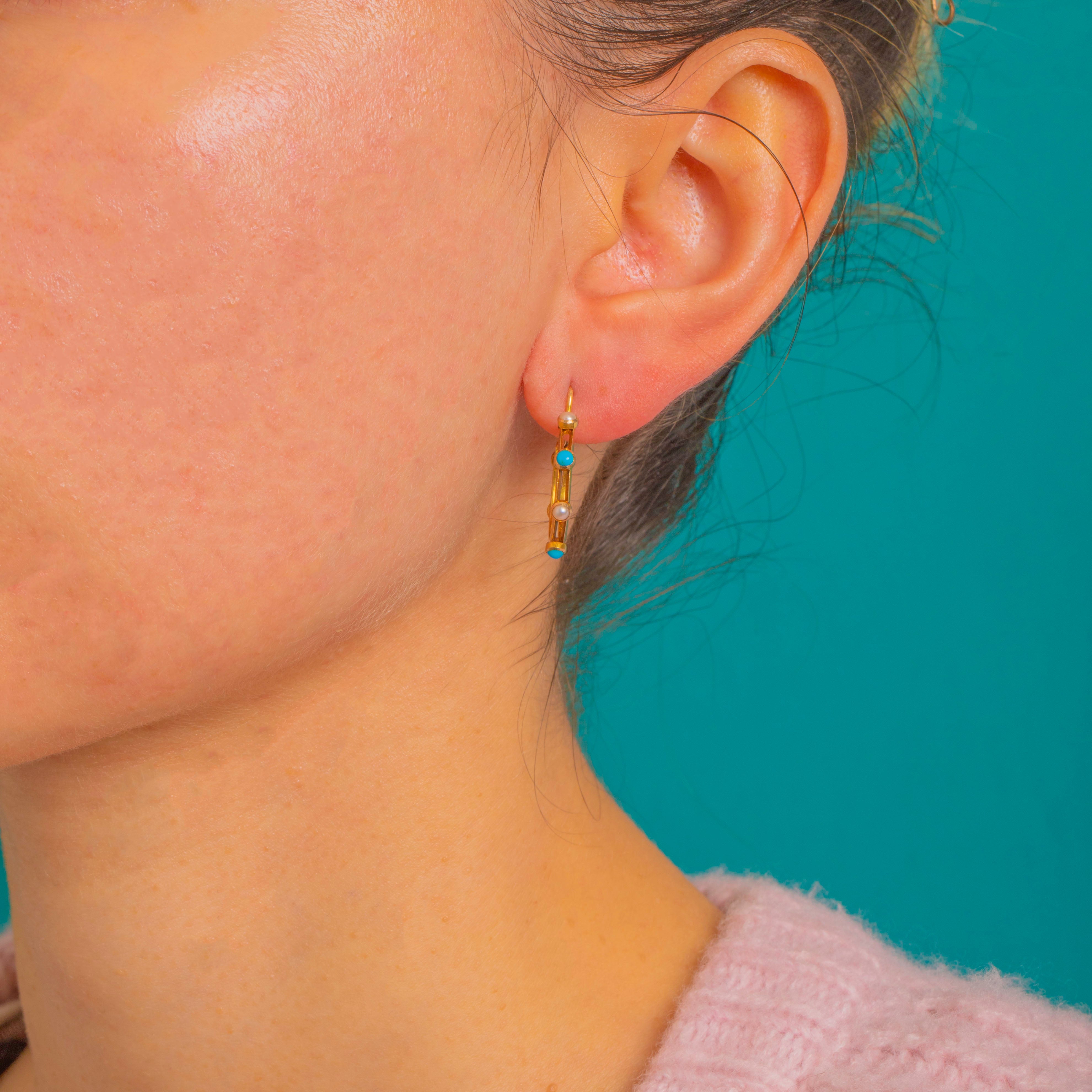 A refined pair of 15ct Gold hoop earrings with a coordinating slim articulated drop, each set with alternating bright Turquoise round cabochons and small creamy Pearl seed beads.