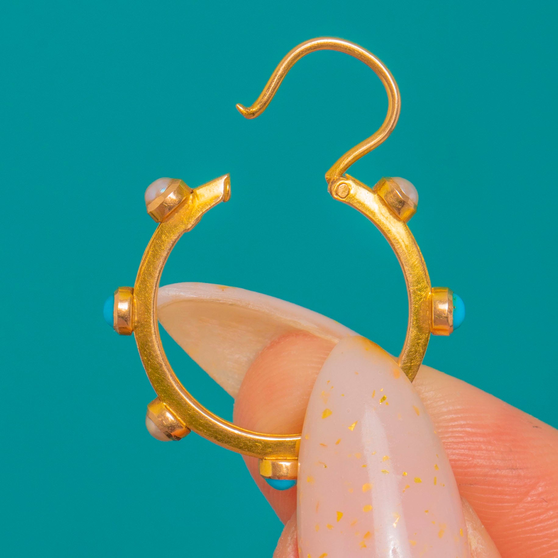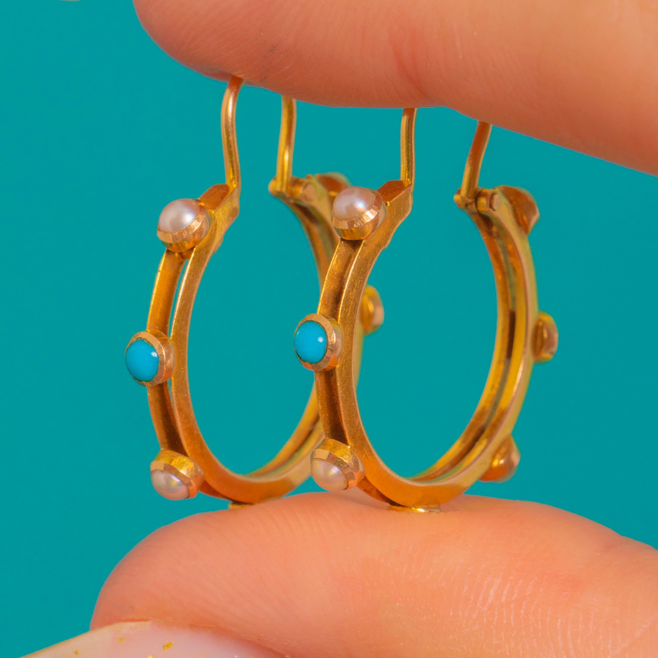 Victorian 15ct Gold Turquoise & Pearl Hoop Earrings