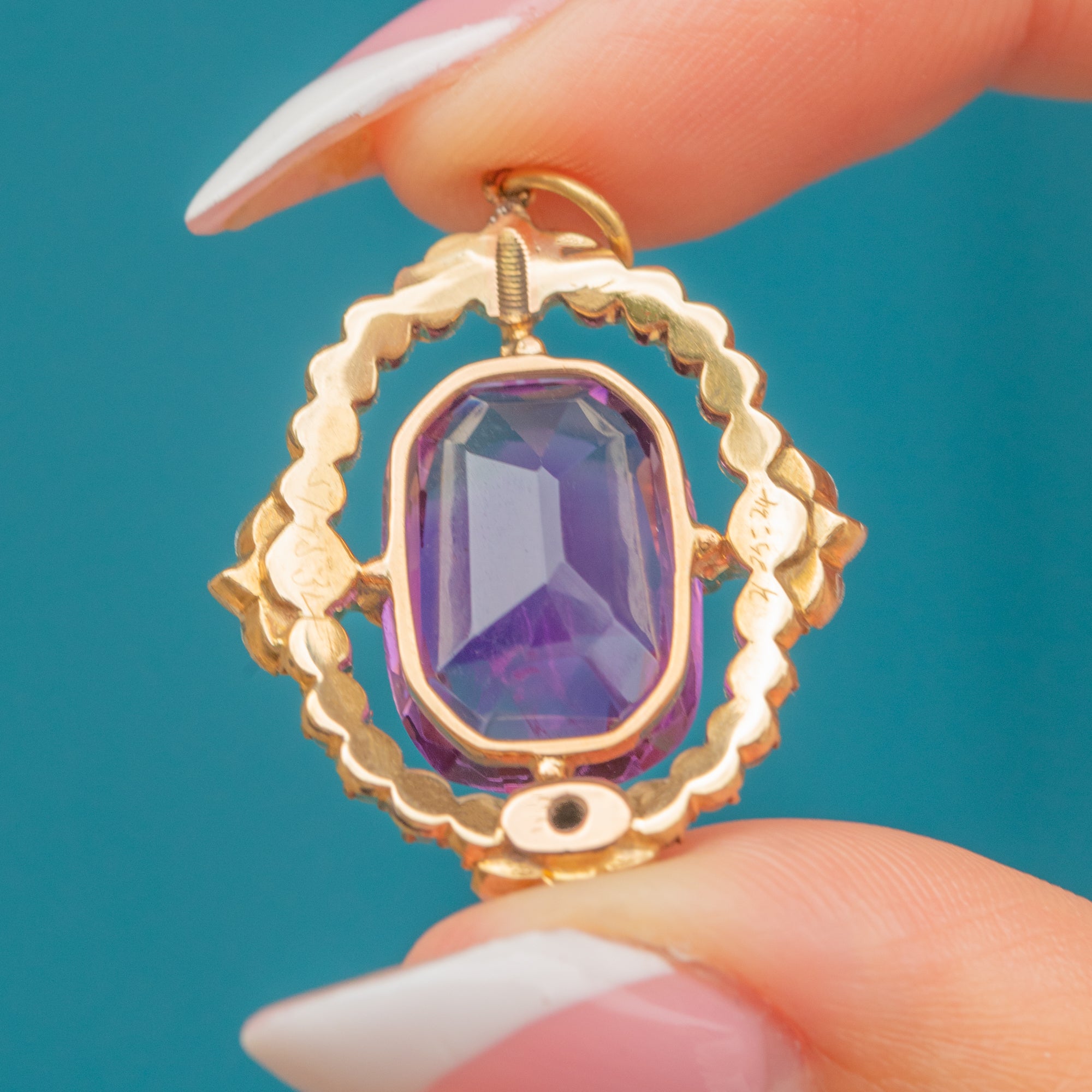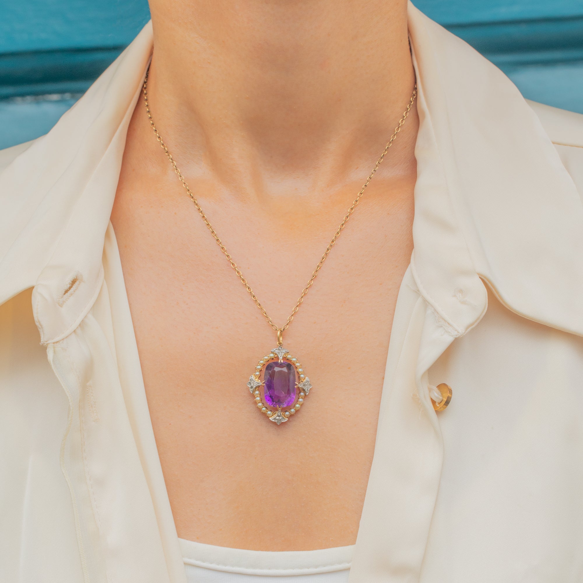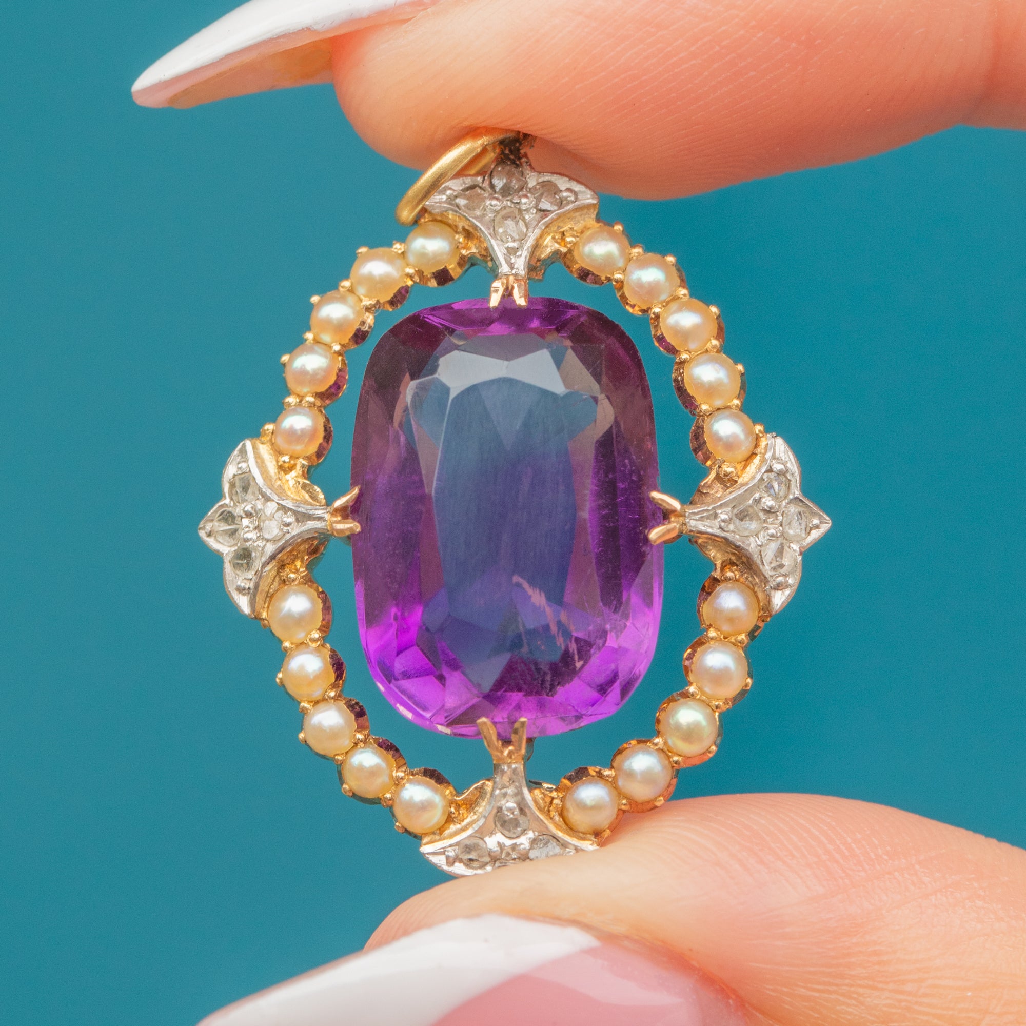 This stunning Victorian pendant, dating to around 1860, features a deep purple Amethyst set securely in a Sterling Silver collet, surrounded by a delicate halo of natural Pearls. Rose-cut Diamonds, set in elegant Platinum settings, add subtle sparkle, each nestled in charming star-shaped mounts to the north, south, east, and west of the central stone. The rich Amethyst contrasts beautifully with the luminous Pearls and glittering Diamonds, all framed by luxurious 18ct Gold.