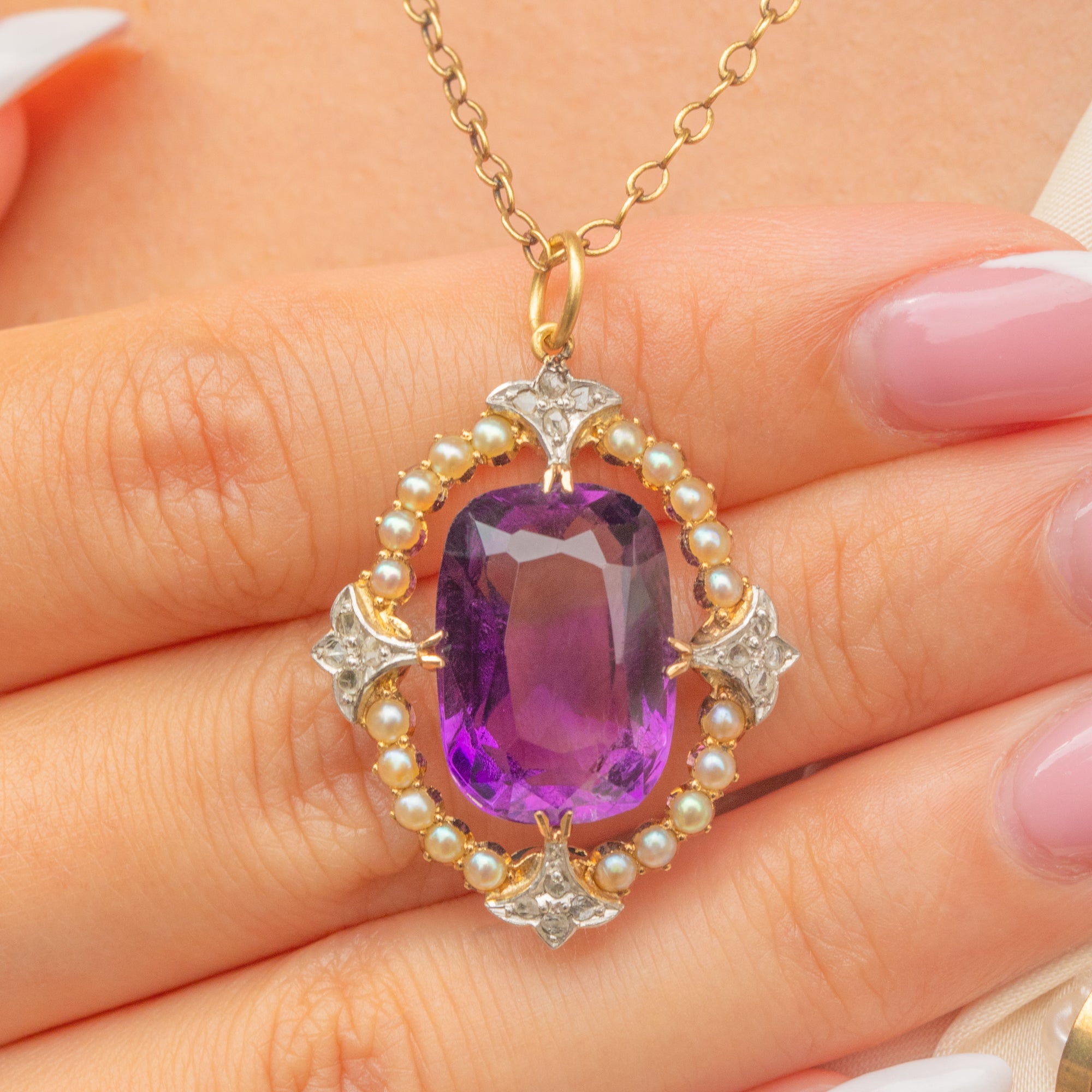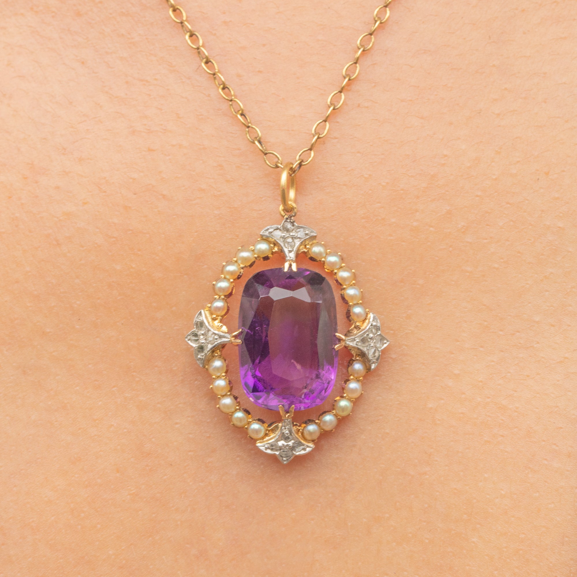 MATERIALS: Tests as 18ct Gold, Sterling Silver, Amethyst (5.25ct), Pearl, Rose-cut Diamond