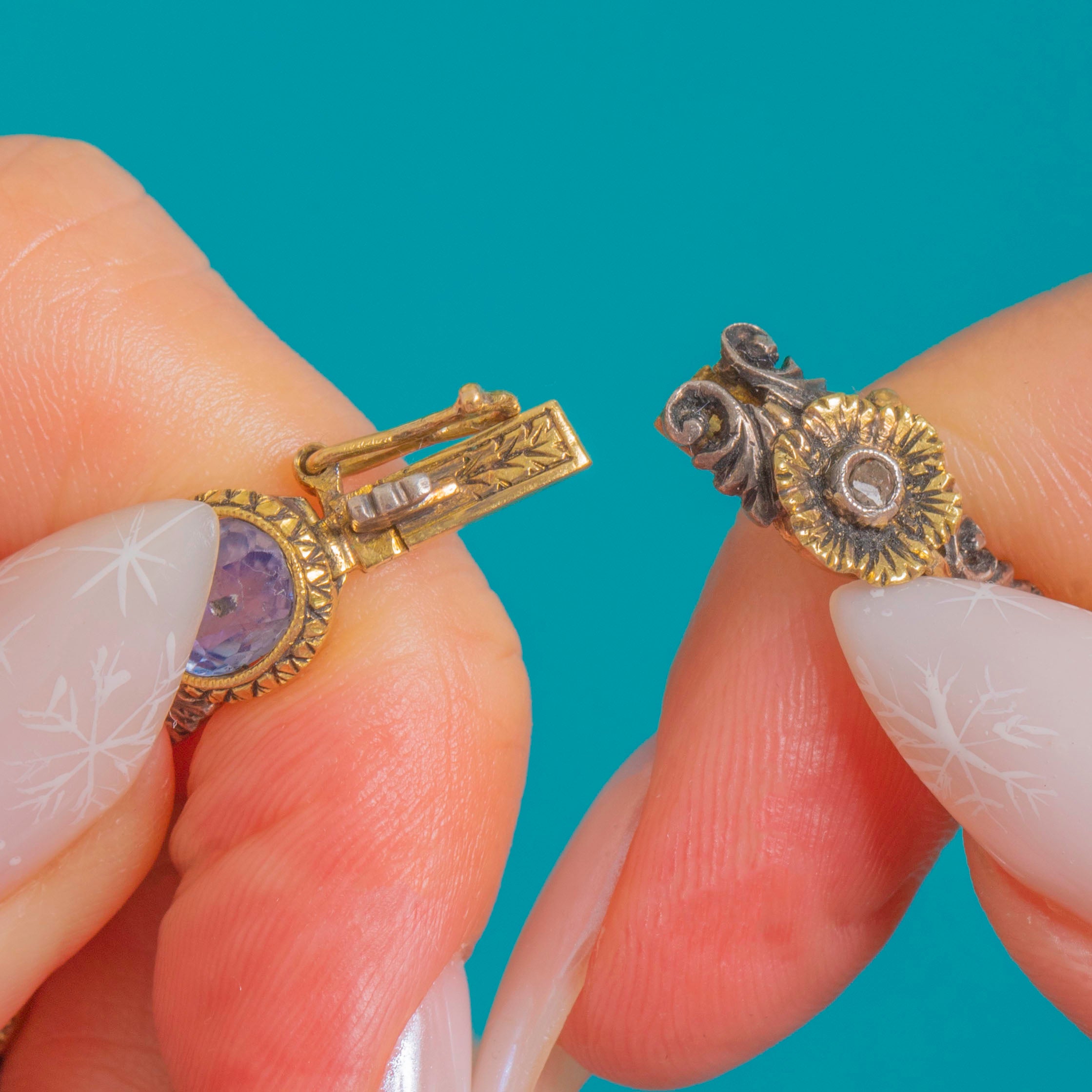 Richly detailed and wonderfully wearable, this Victorian bracelet marries Natural Blue and Yellow Sapphires with delicate rose-cut Diamond accents in ornate foliate and rosette motifs. Crafted in 18ct Gold and Silver, the two-tone palette and textured collet settings lend a refined, romantic character typical of the period.