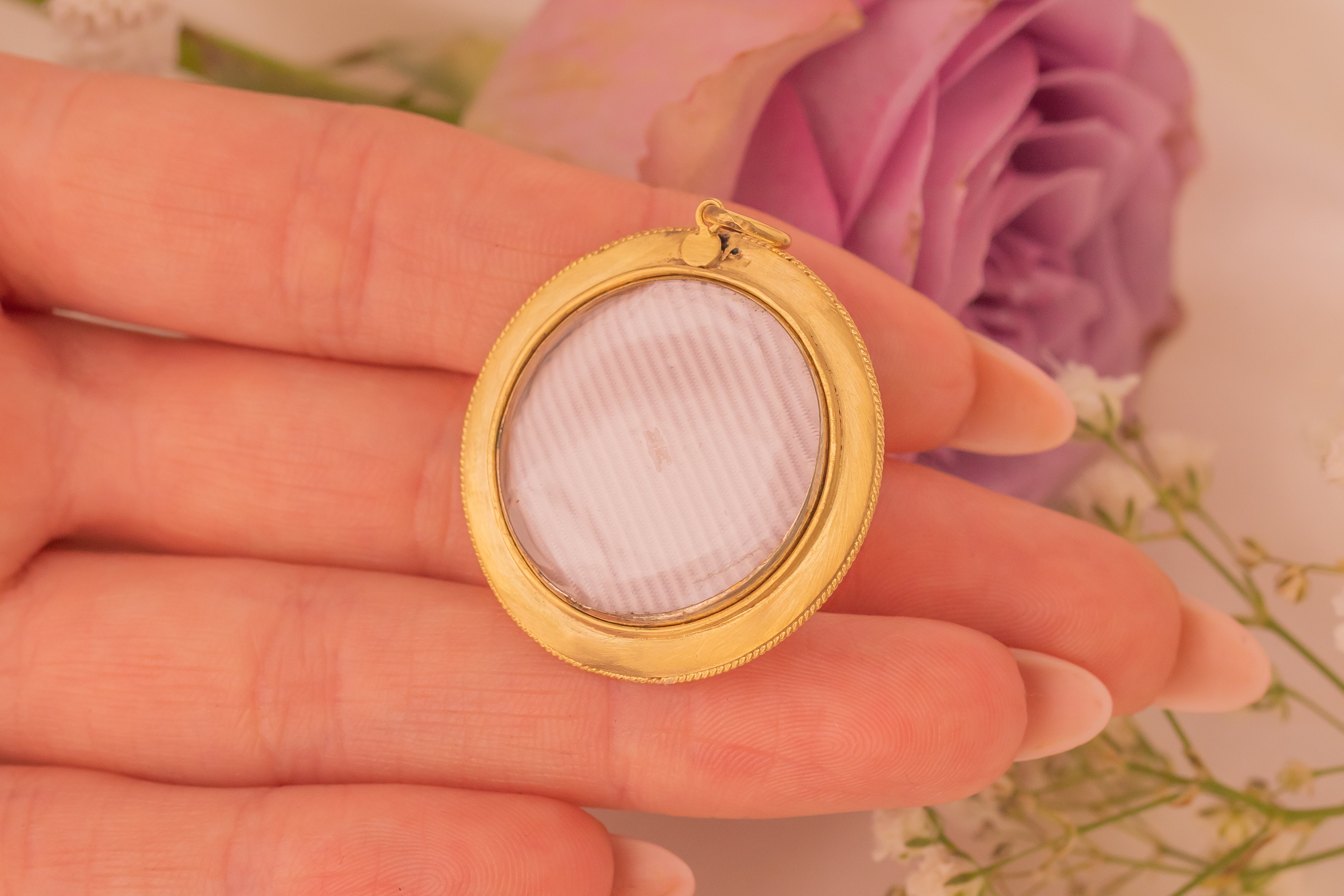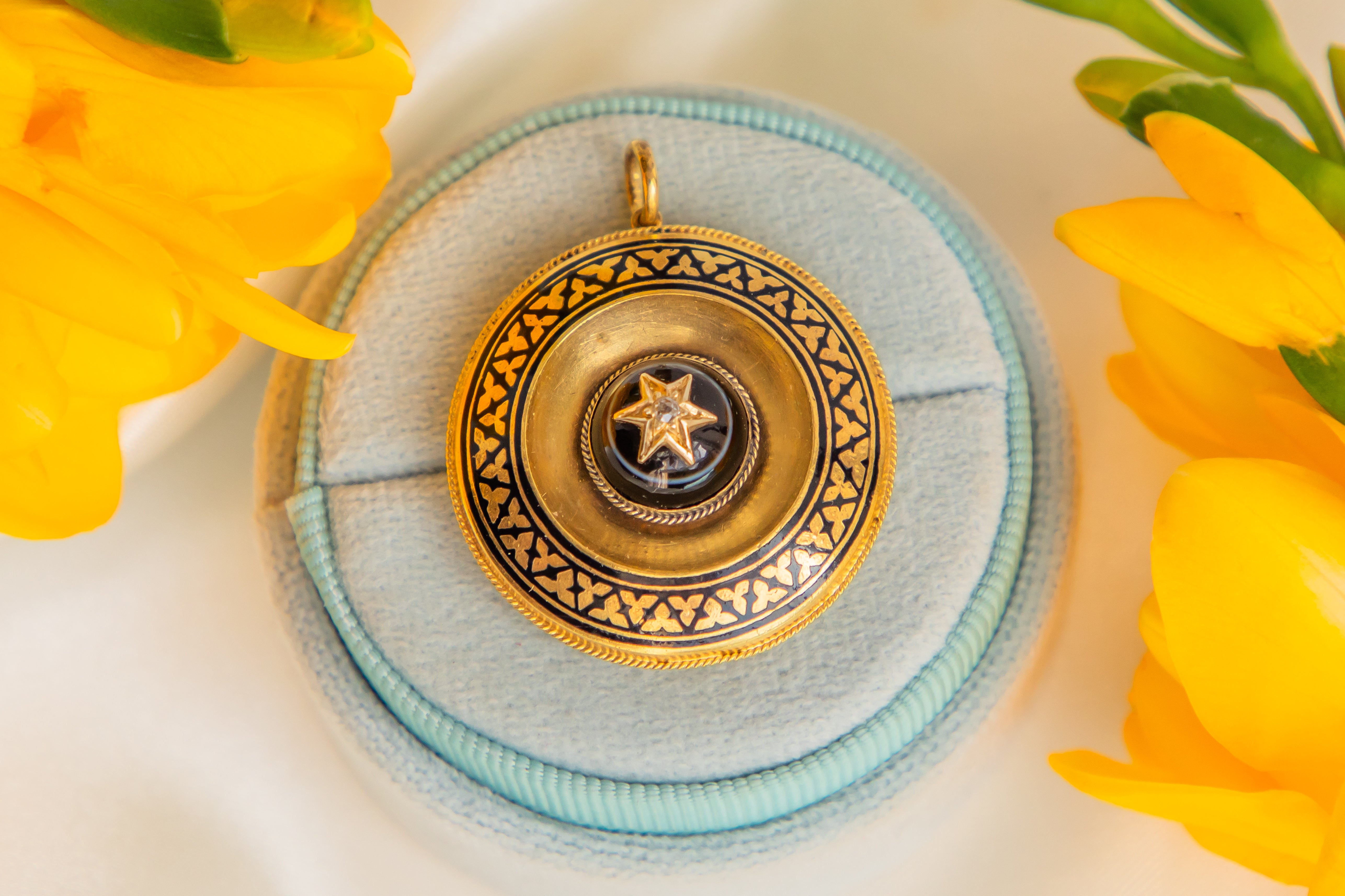 Your favourite part of this jewel will be the meticulously hand-painted black Enamel details on her rich 18ct Gold, adding another flourish of elegance. Complete with a locket back, she will also be home to your most precious photograph!