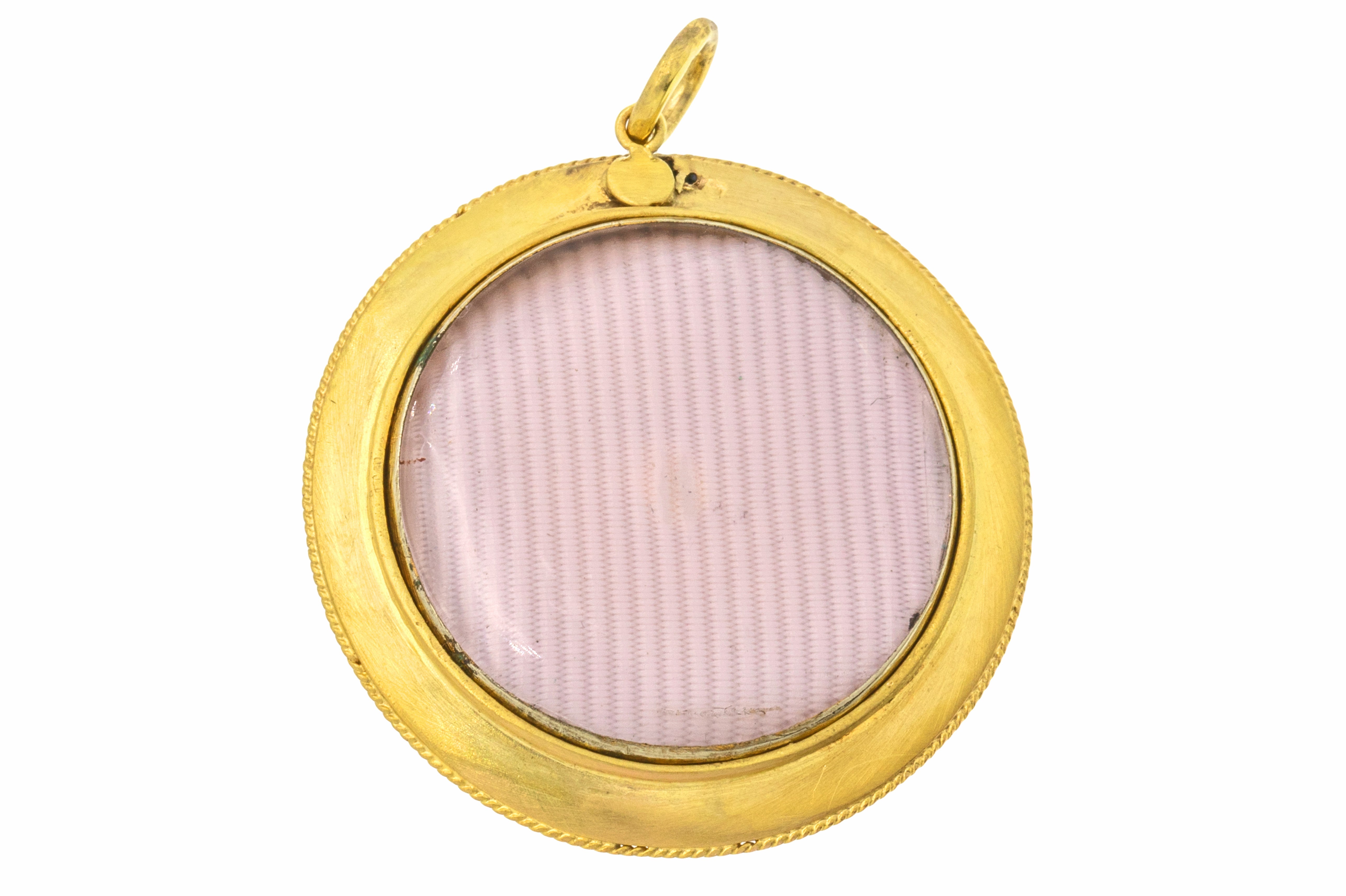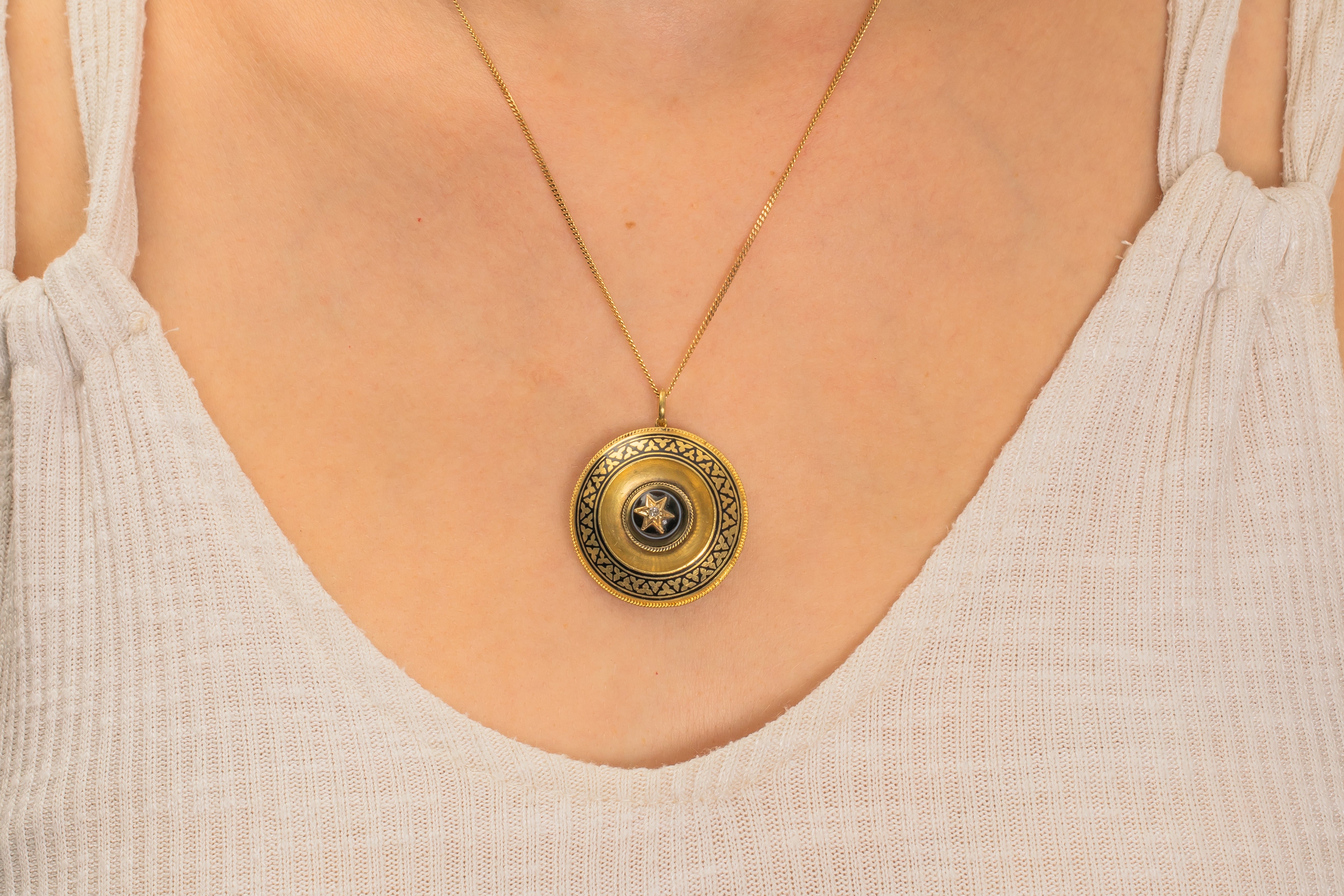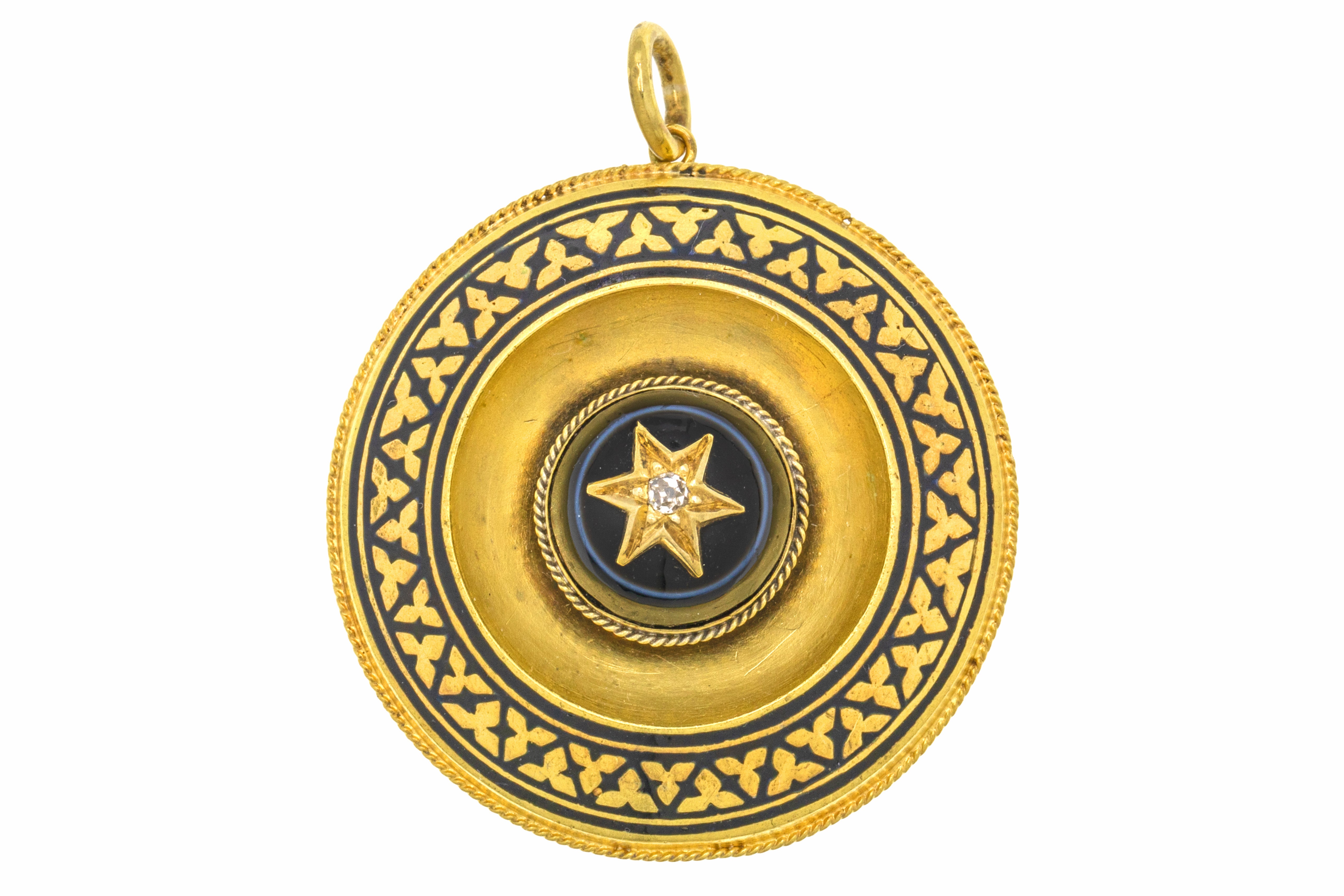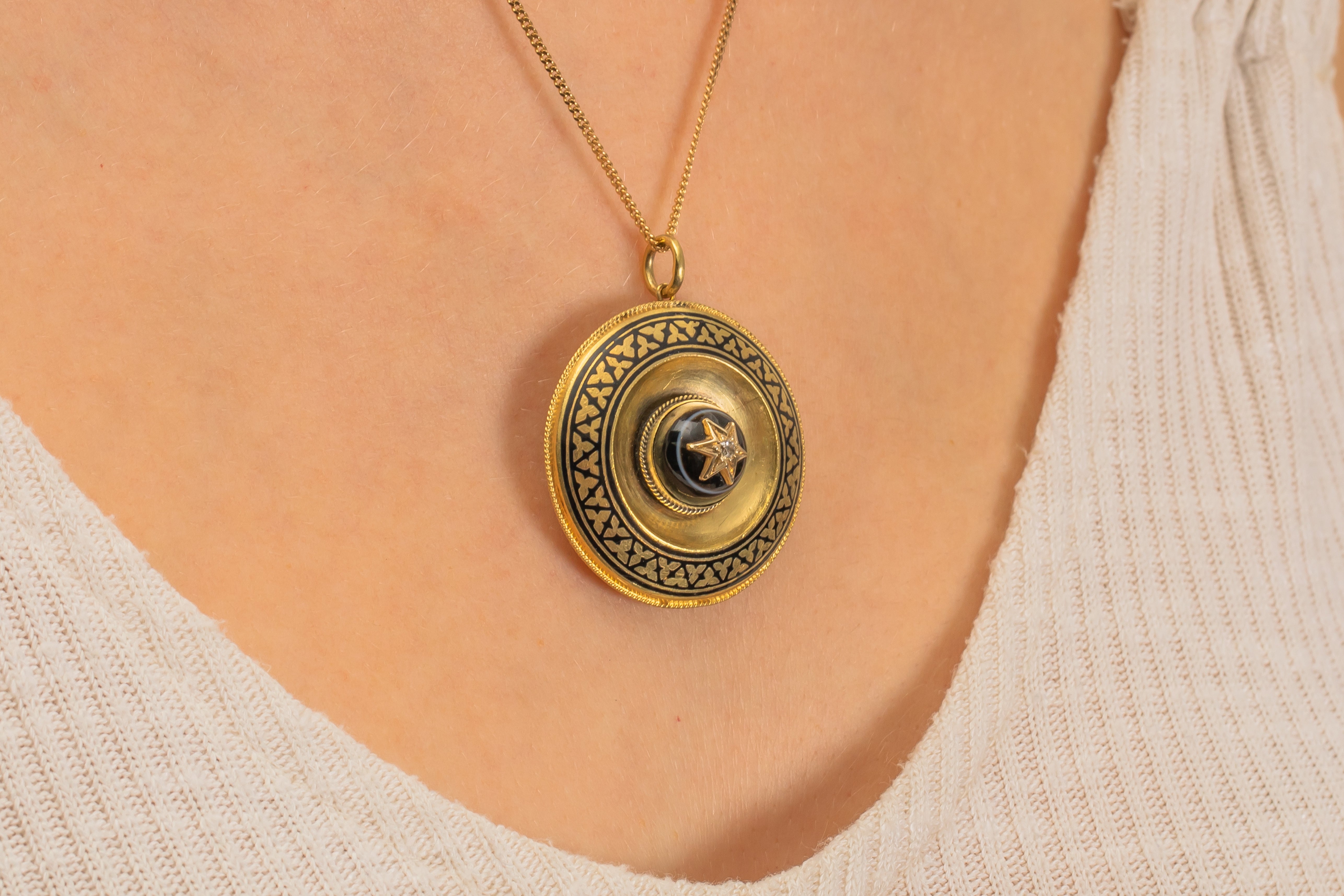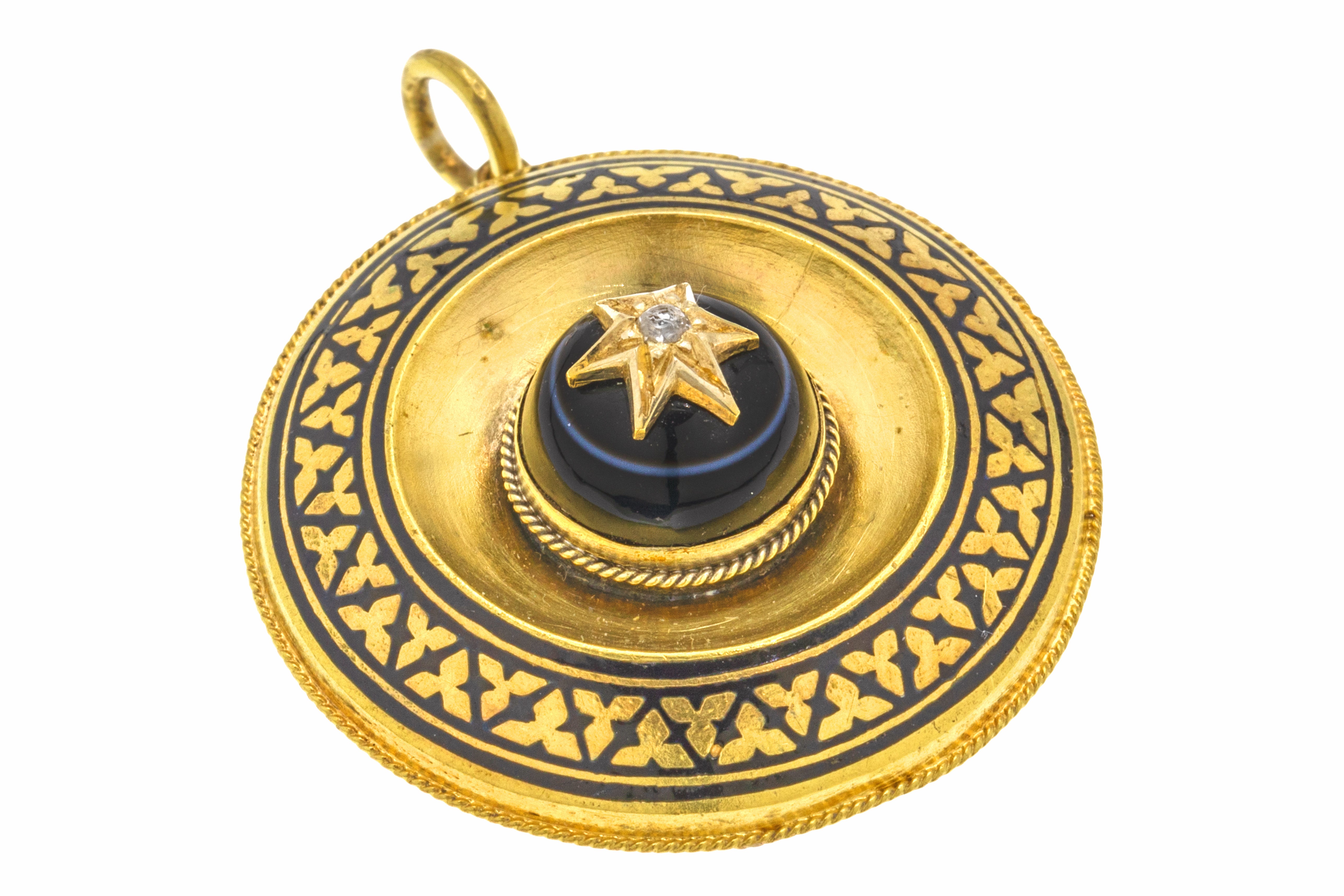 VERY GOOD-EXCELLENT: This Victorian 18ct Gold banded Agate Enamel Diamond pendant is in wonderful condition. Starting life as a brooch, she has been expertly converted into a pendant locket, where you can remove the back and place your own photos. With such minimal signs of this conversion, it's as though she has always been destined to be a pendant. Under close inspection, you will see abrasions around where the jump ring has been added. The jump ring is soldered ensuring secure wear at all times. This Etruscan revival pendant will add bundles of character to your jewellery box.