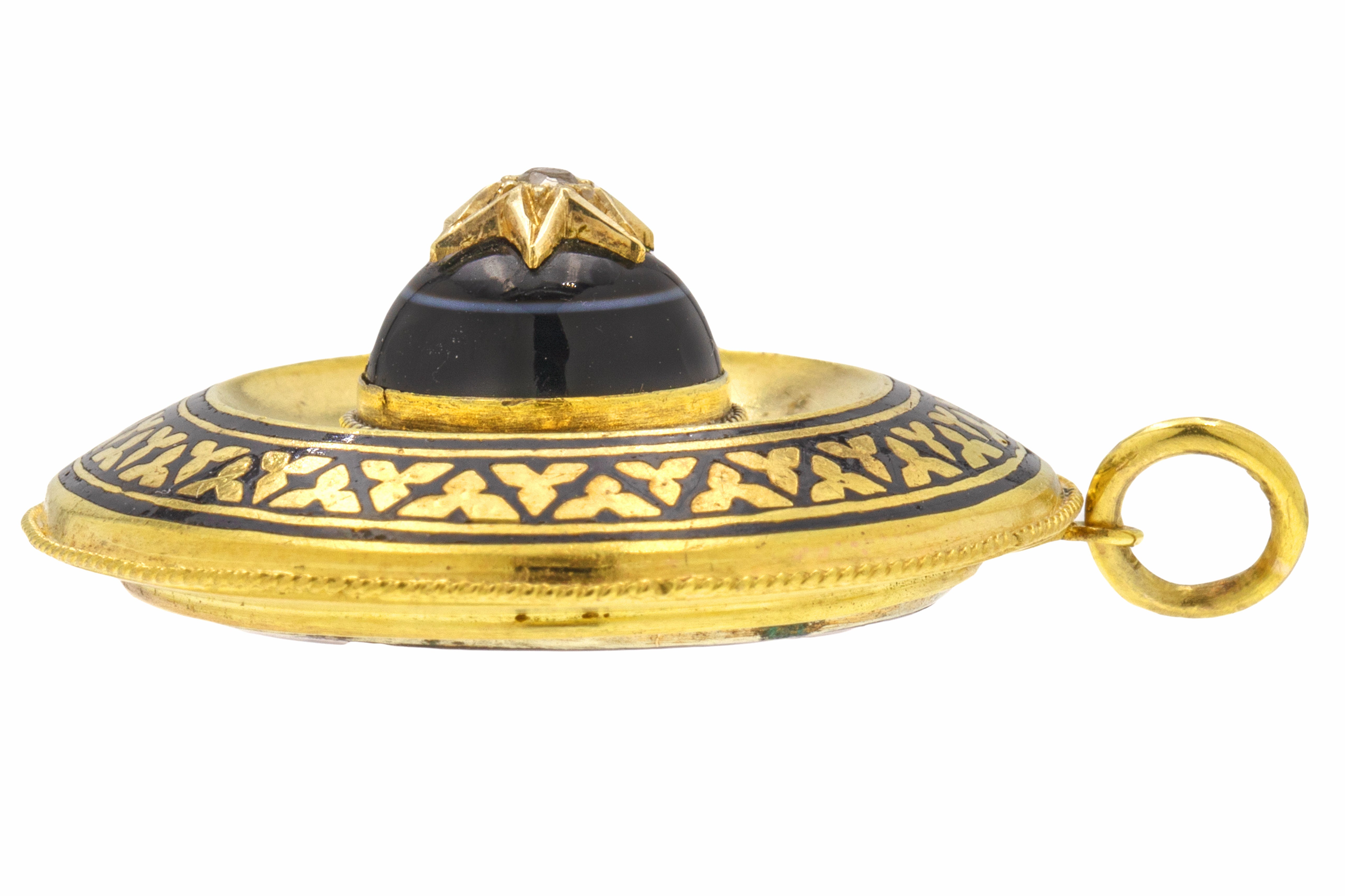 MATERIALS: Solid 18ct Gold, Black Enamel, Banded Agate, old-cut antique Diamond.