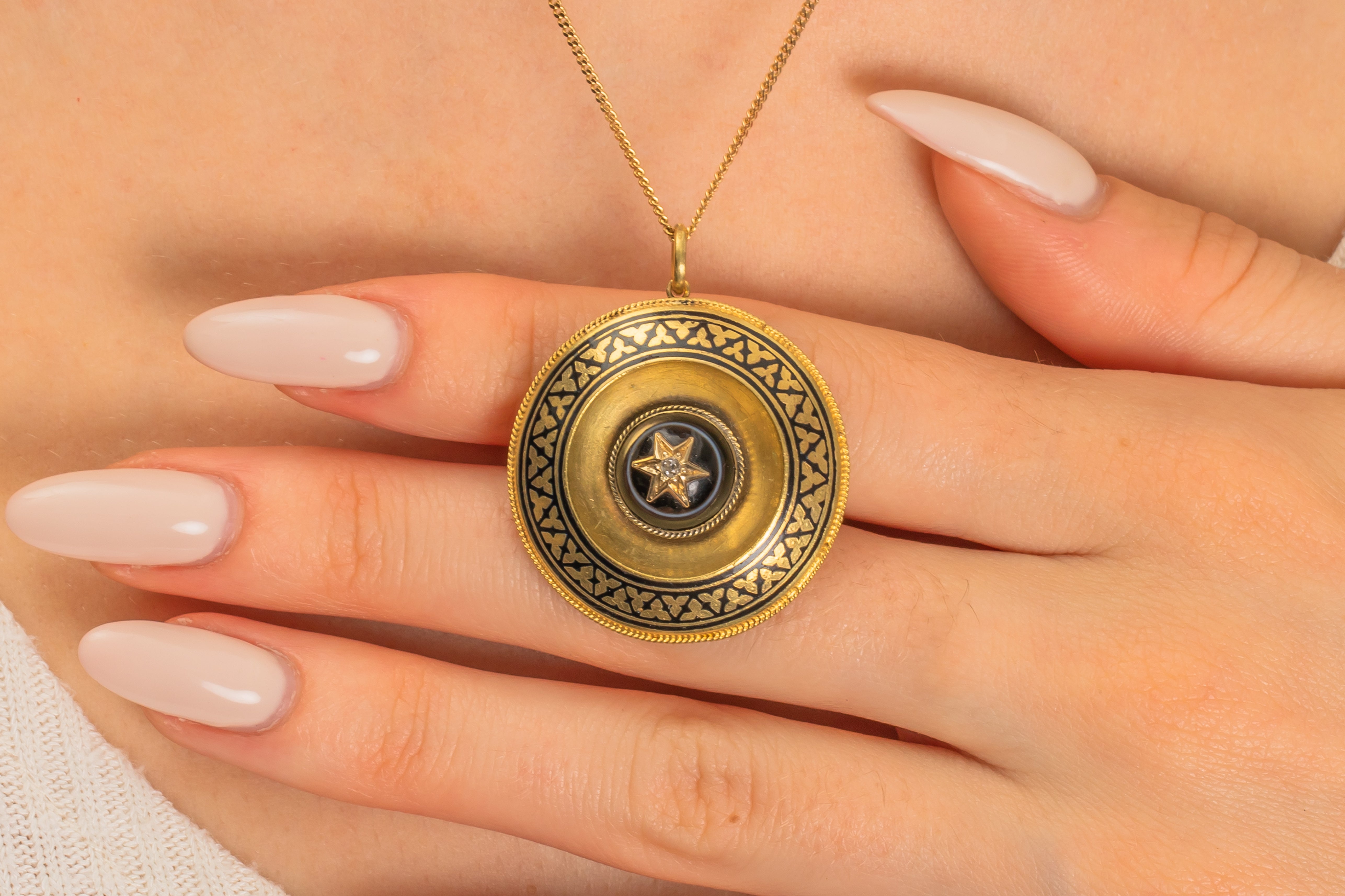 This Victorian 18ct Gold Banded Agate Enamel Diamond pendant is a striking jewel! Inlaid with a domed Banded Agate and an old-cut antique Diamond star accent, this incredible Etruscan revival pendant will transform you into a warrior queen.