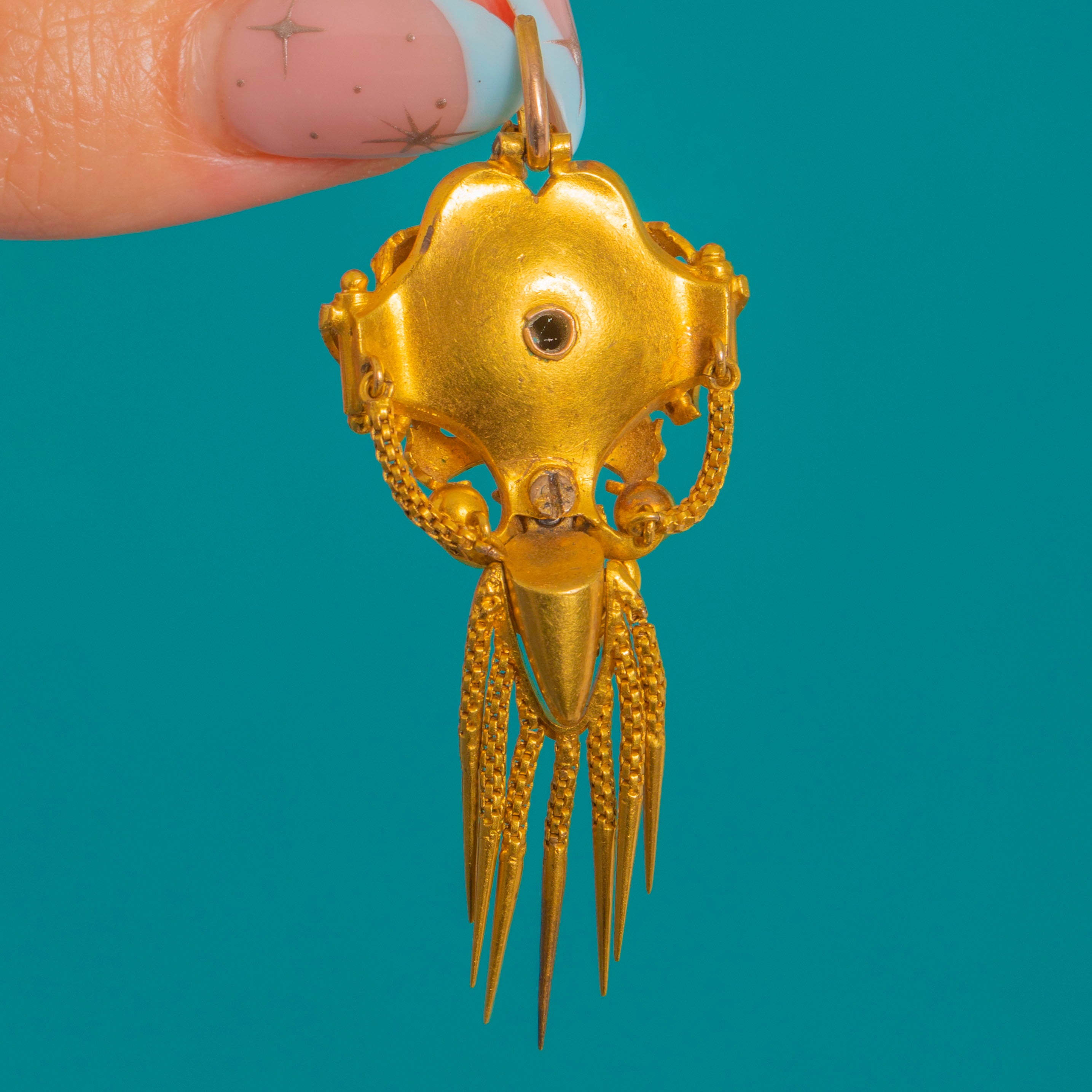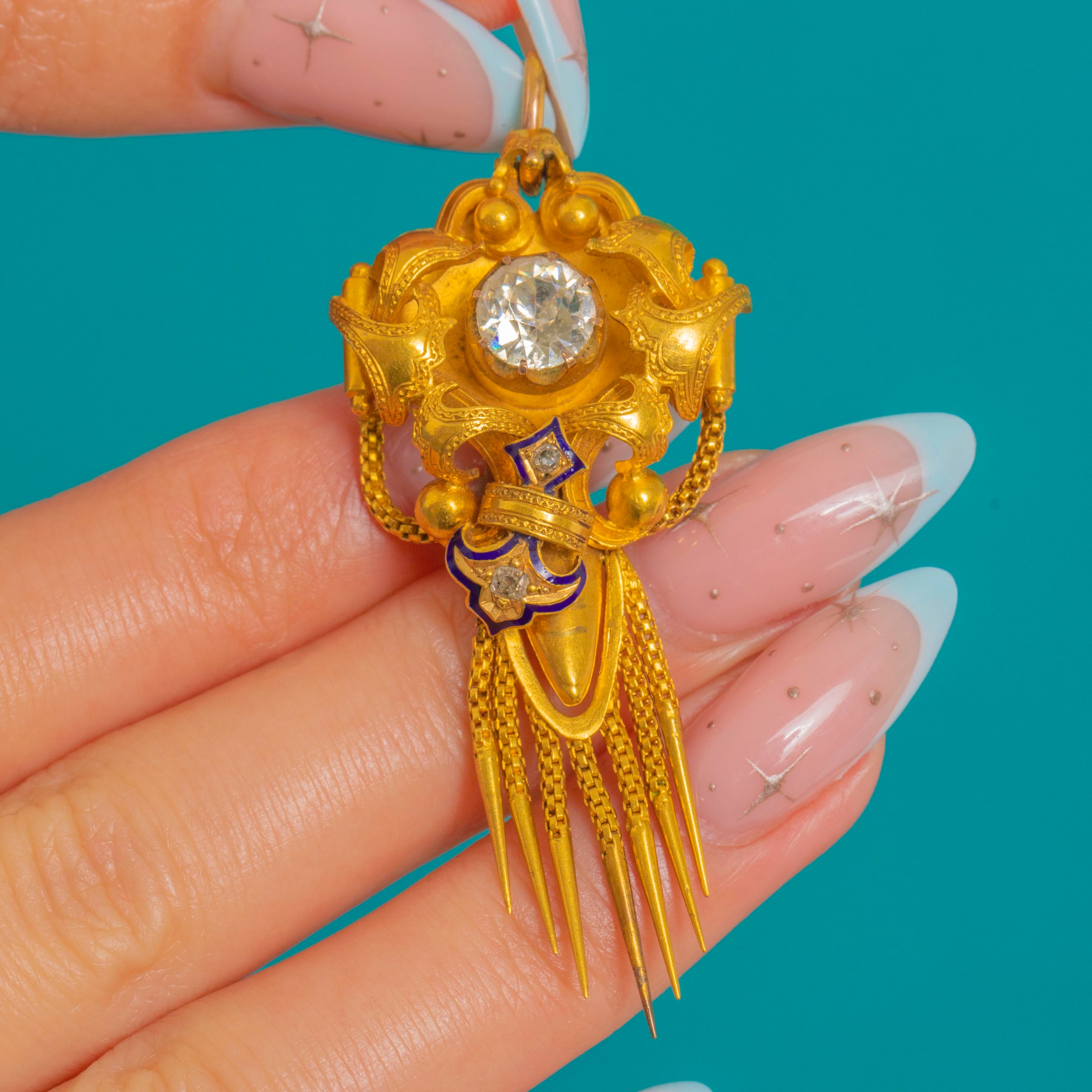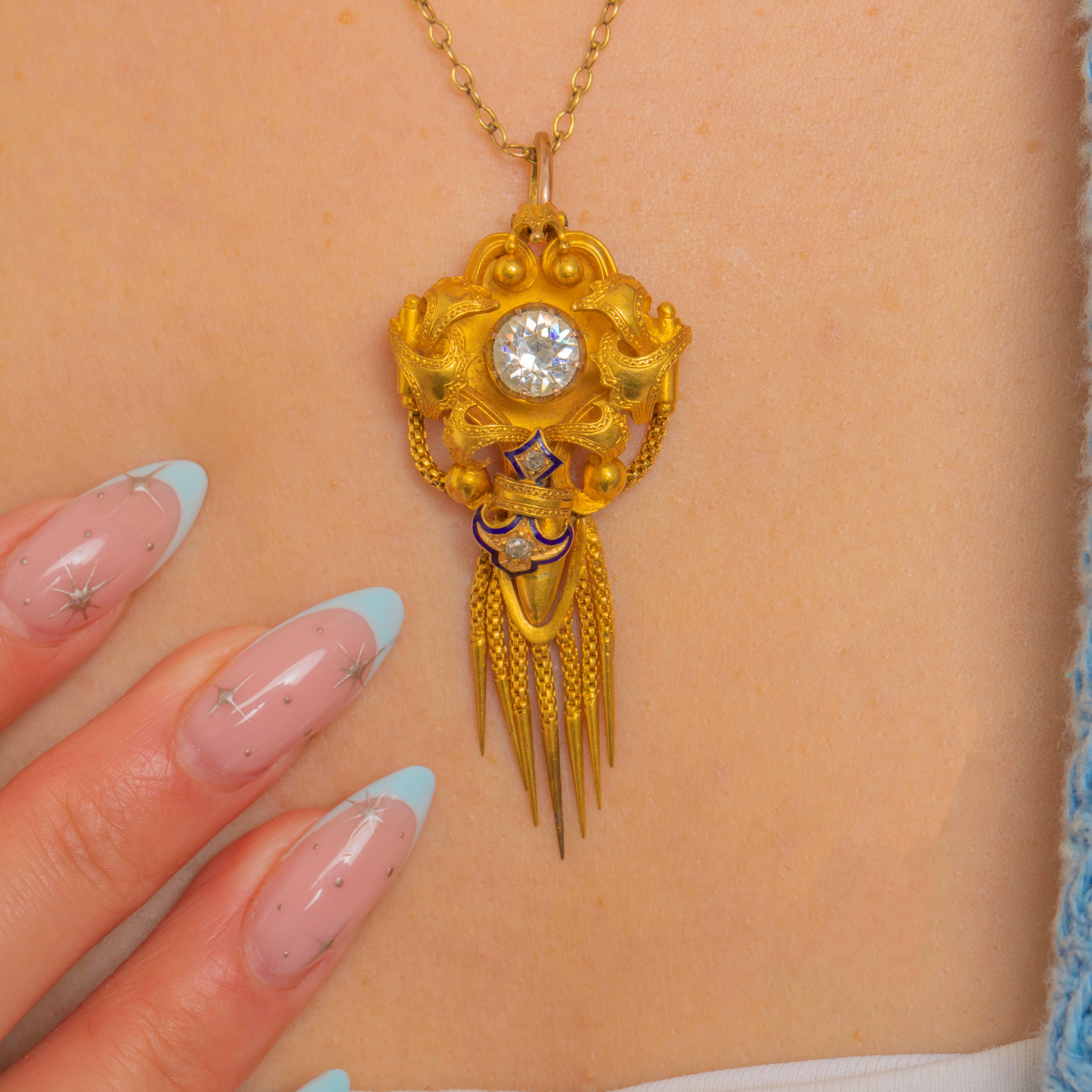 Sumptuous Victorian design meets Archaeological Revival allure in this exquisite antique pendant, crafted in richly hued 18ct Gold and accented with deep cobalt-blue Enamel. The sculptural, multi-part silhouette is centred by a raised round Rock Crystal in a high collet, framed by applied bead “granulation” and elegant scrolls. A lively articulated fringe of fine fox chain tassels with conical drops lends movement and drama, while a petite chain swag and star detail add a charming, classical touch.