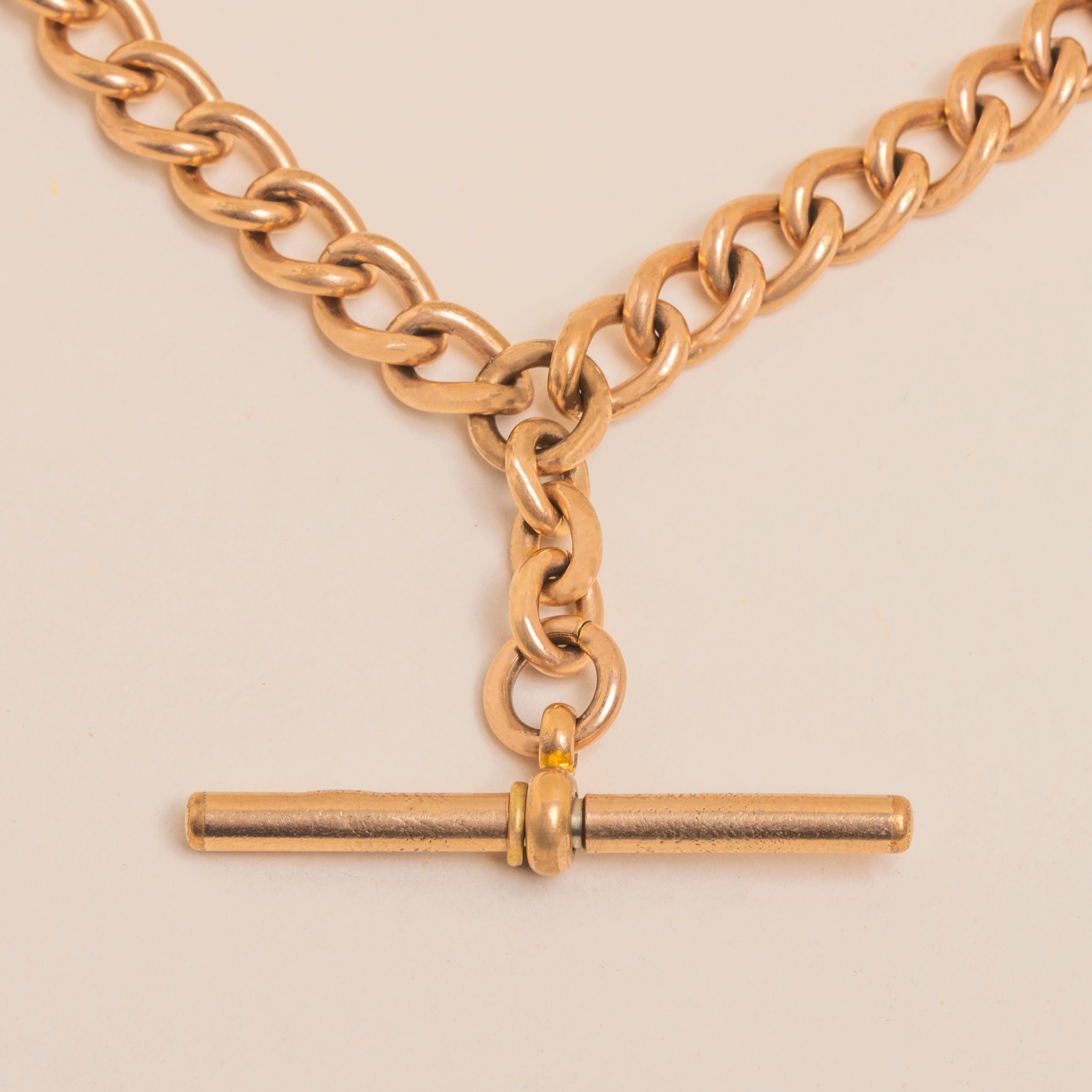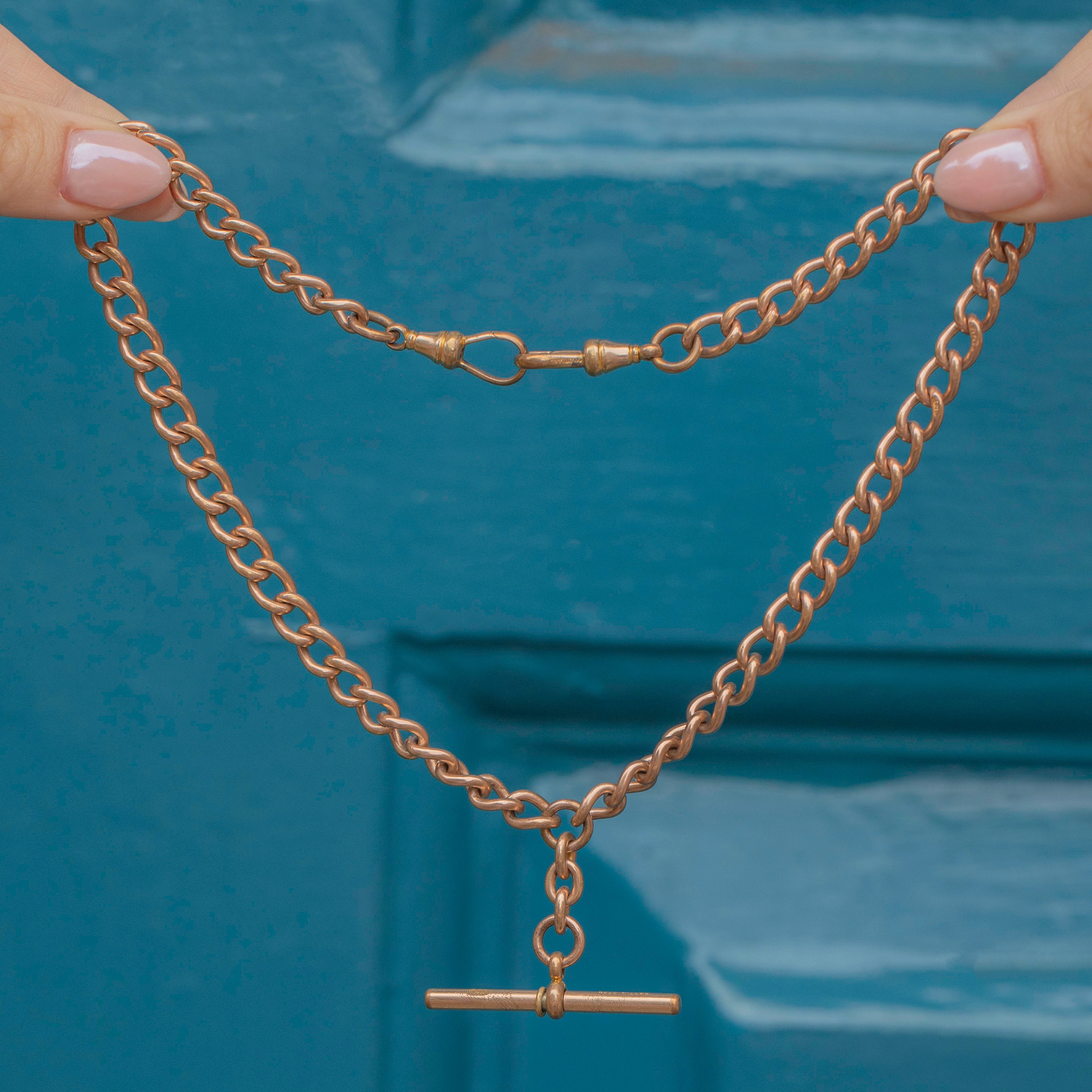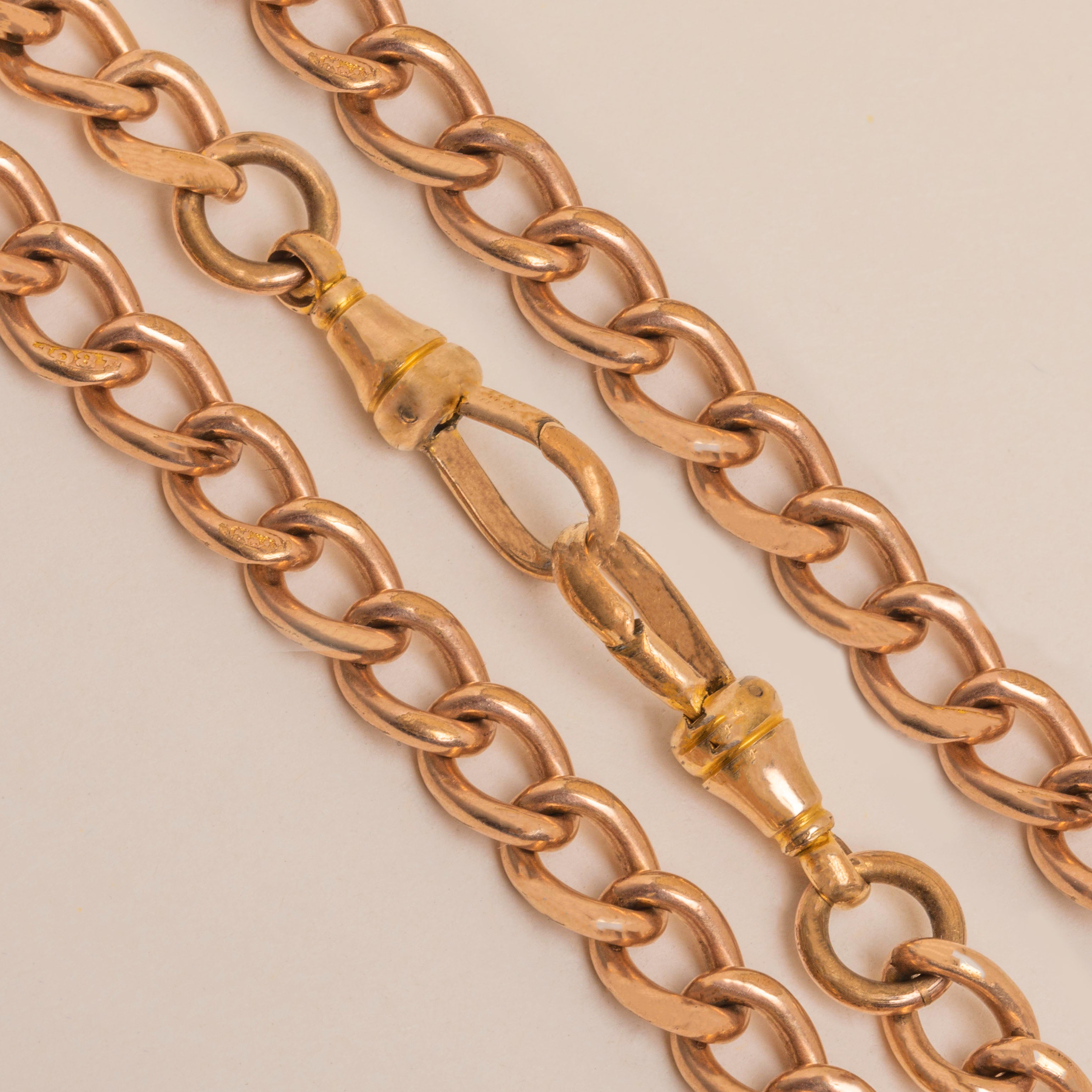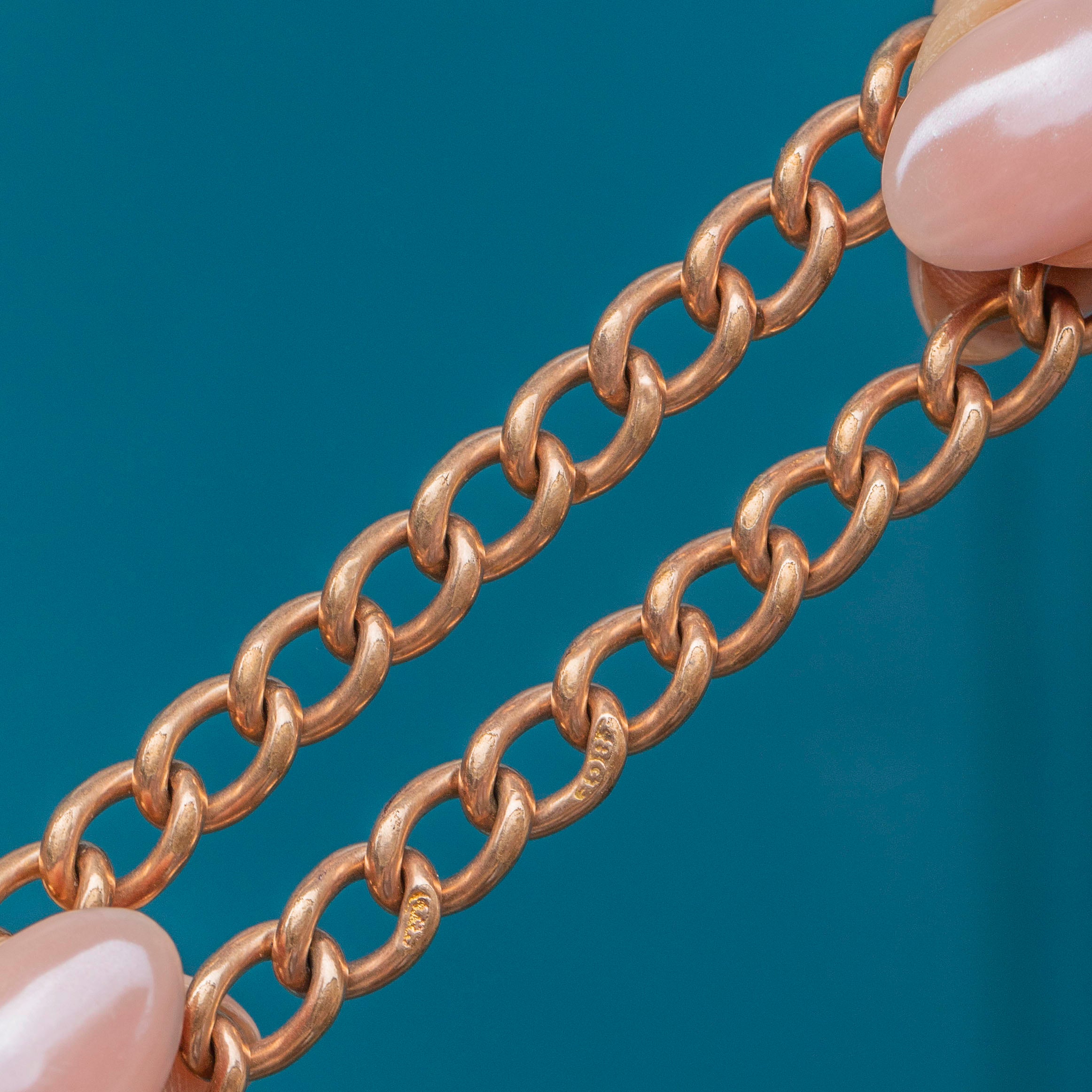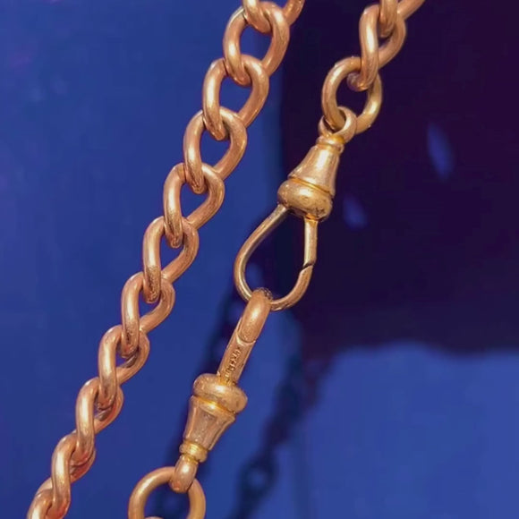 This hefty Victorian 18ct Gold Cased Fancy Albert Chain is a must-have for anyone looking for a reliable antique chunky chain for their collection. A gorgeous hue, this blushed 18ct Gold cased chain boasts rare matching dog-clips, we think this antique Gold chain is an absolute steal for her price!