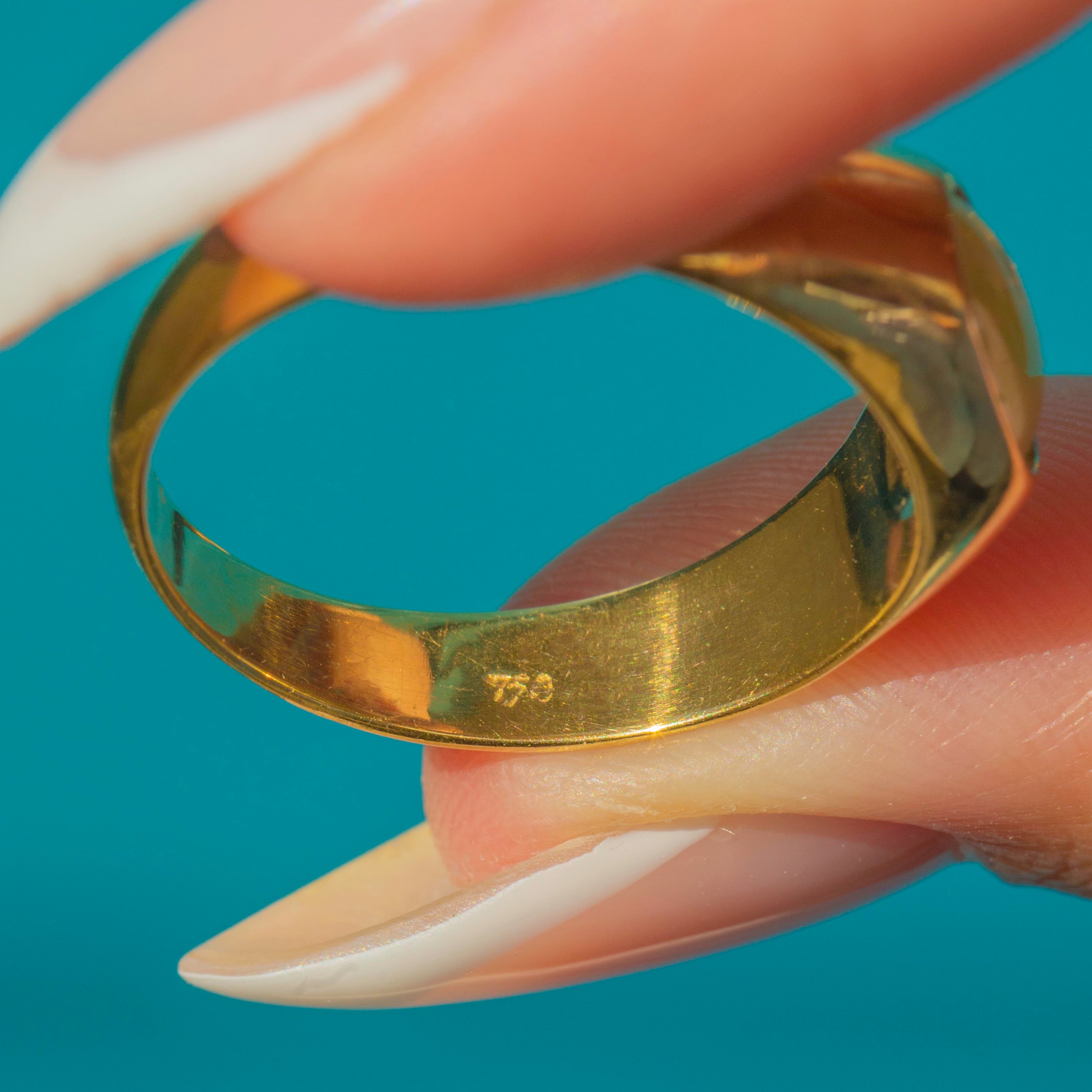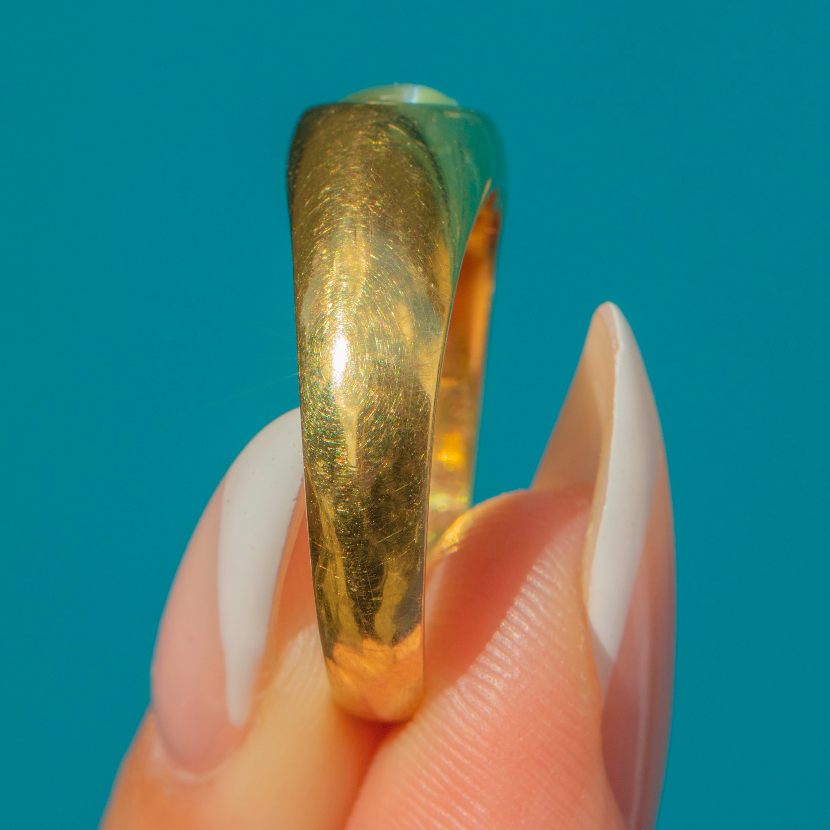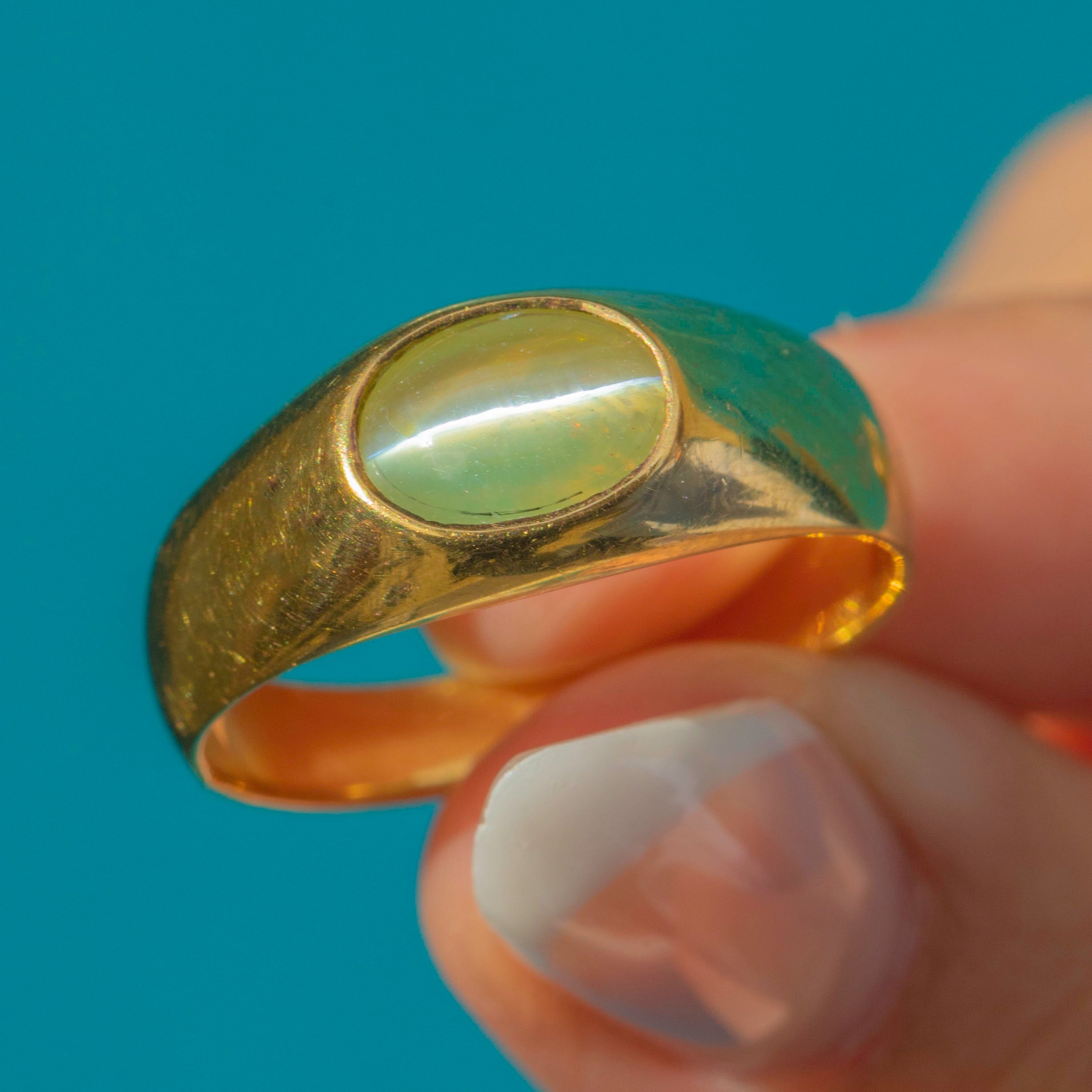 The broad, highly polished Gold band provides a strong and elegant frame for the gemstone, emphasising the sleek cabochon cut. A refined jewel from the 19th century with both presence and rarity.