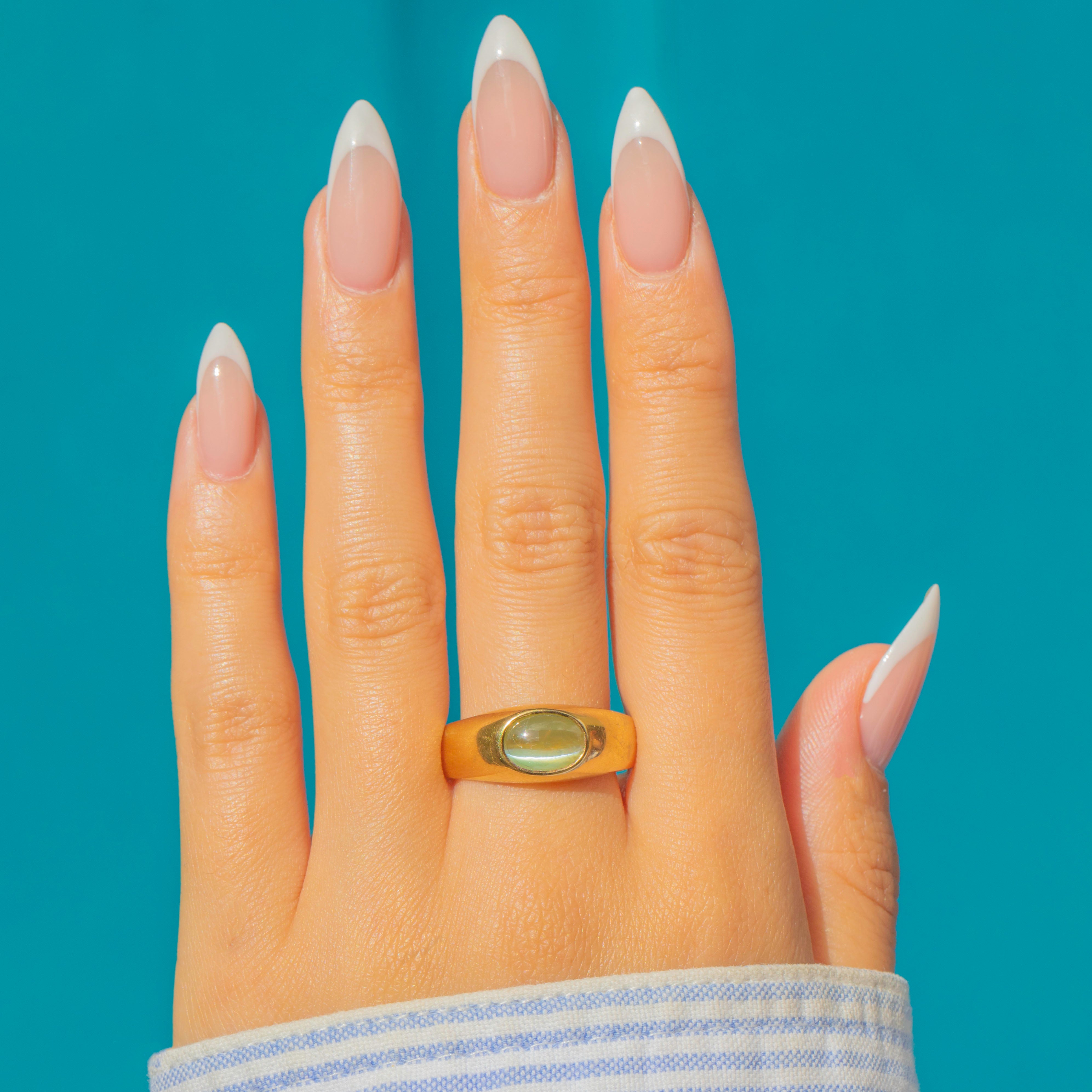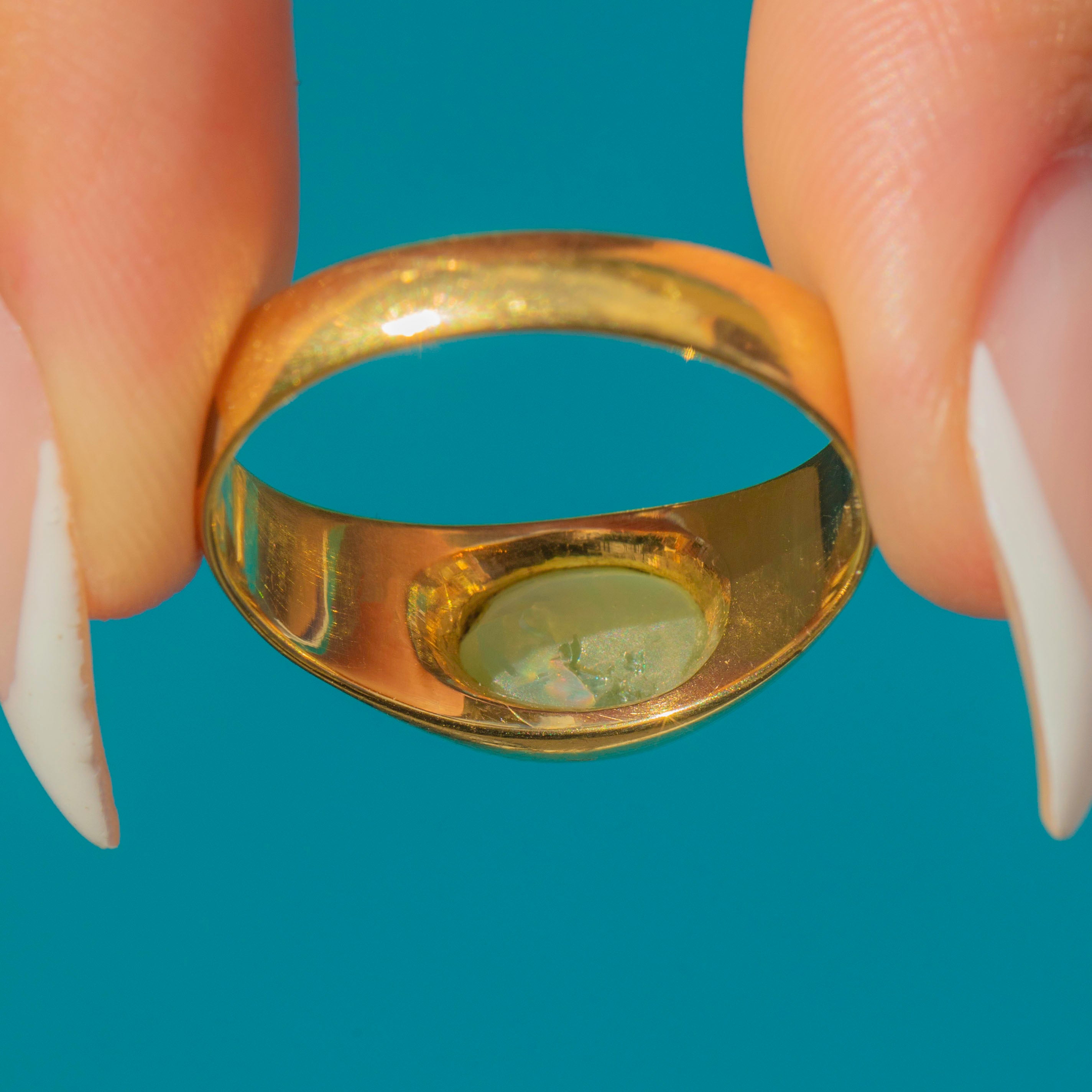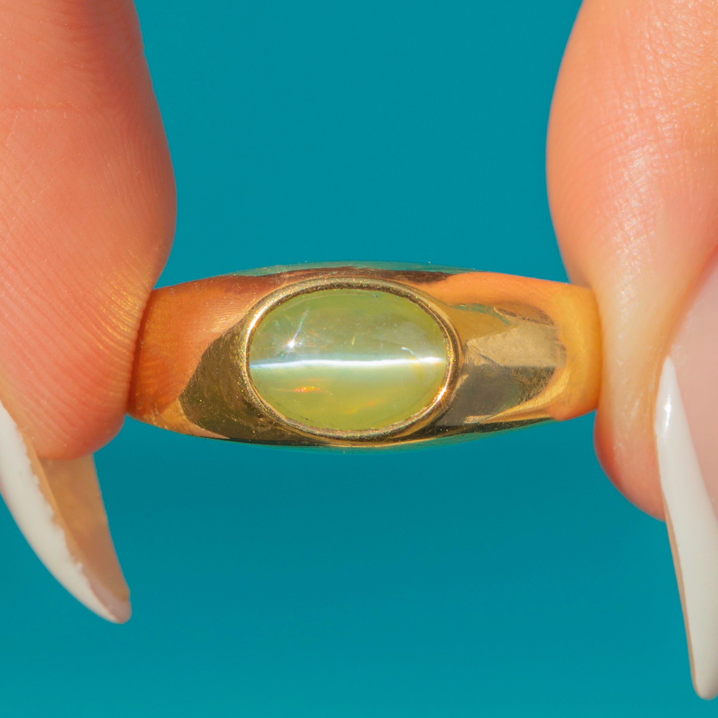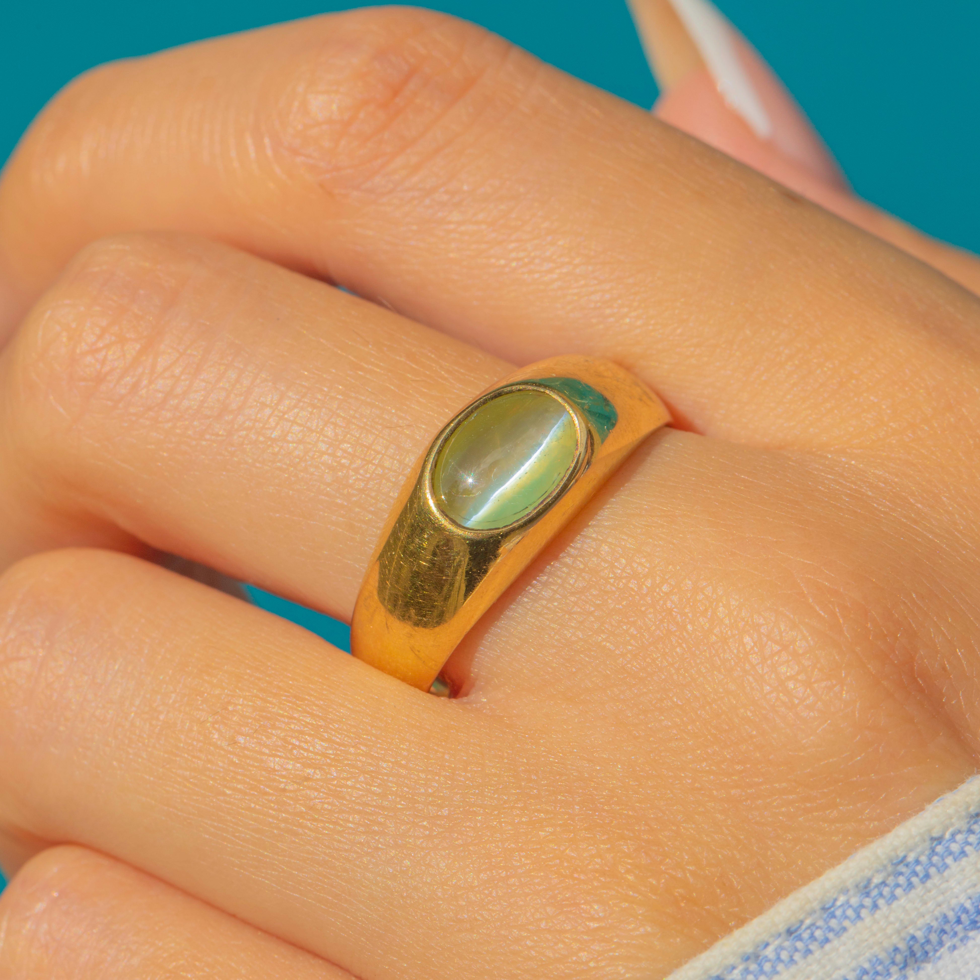 The broad, highly polished Gold band provides a strong and elegant frame for the gemstone, emphasising the sleek cabochon cut. A refined jewel from the 19th century with both presence and rarity.