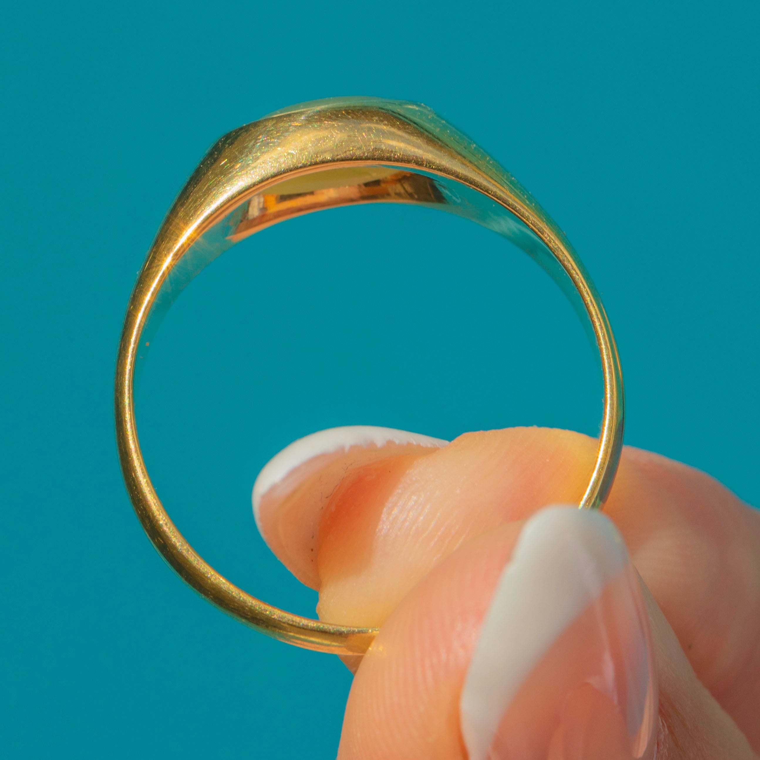 A rare Victorian cat’s eye Chrysoberyl ring, crafted in rich 18ct Gold and set with a striking 9 x 7mm cabochon. The gem shows the prized chatoyancy—a fine silvery line of light that moves across the stone as it catches the light—giving it an almost mystical glow.