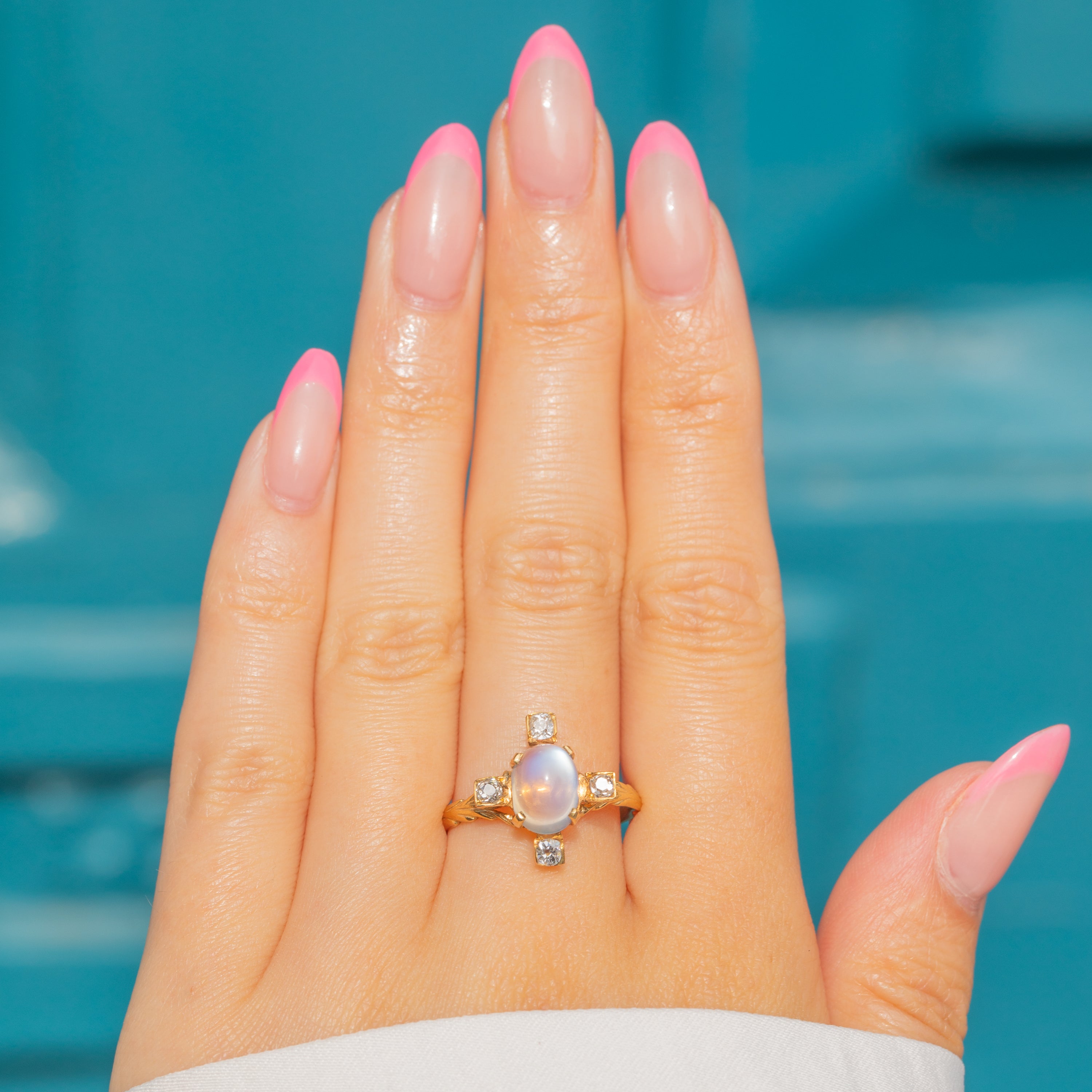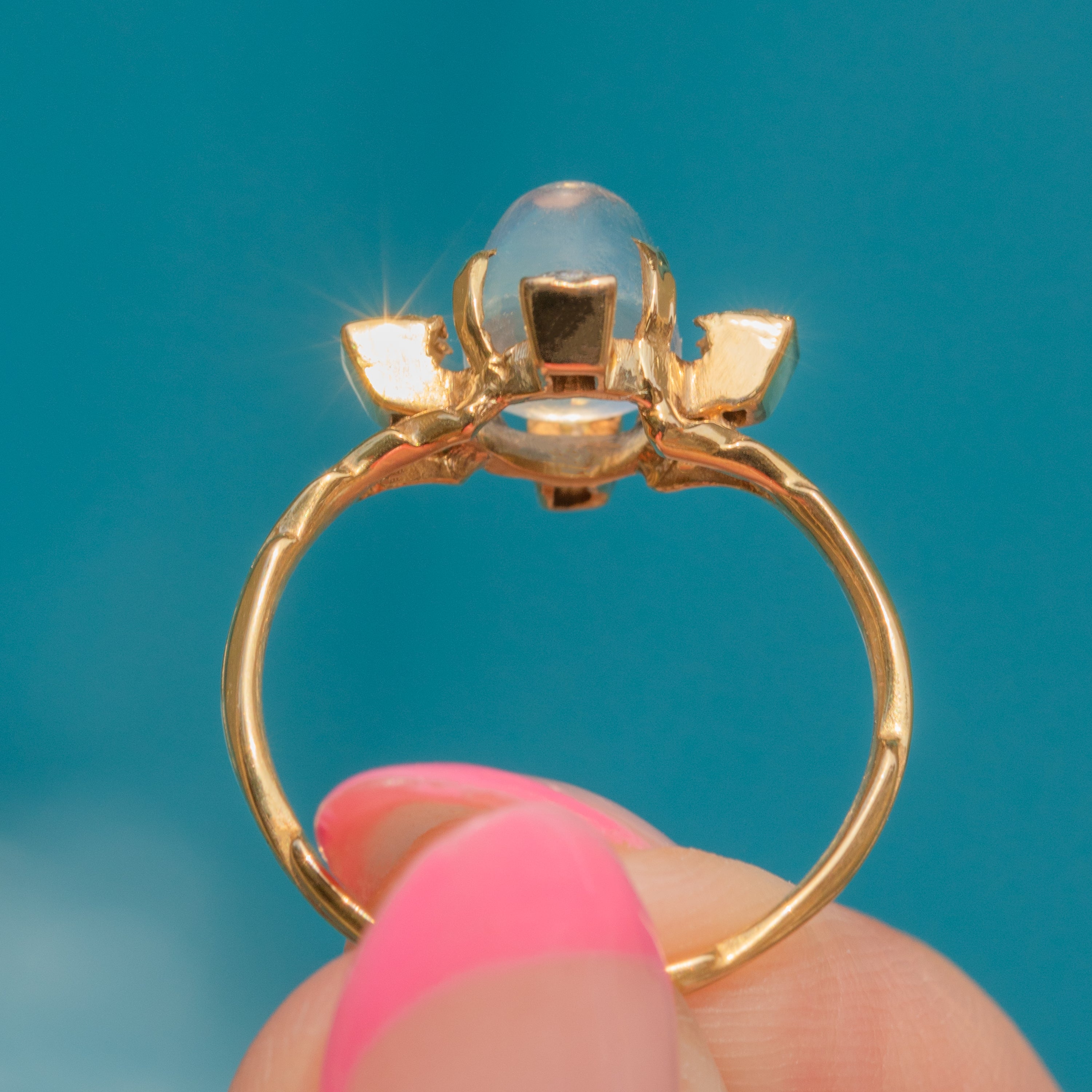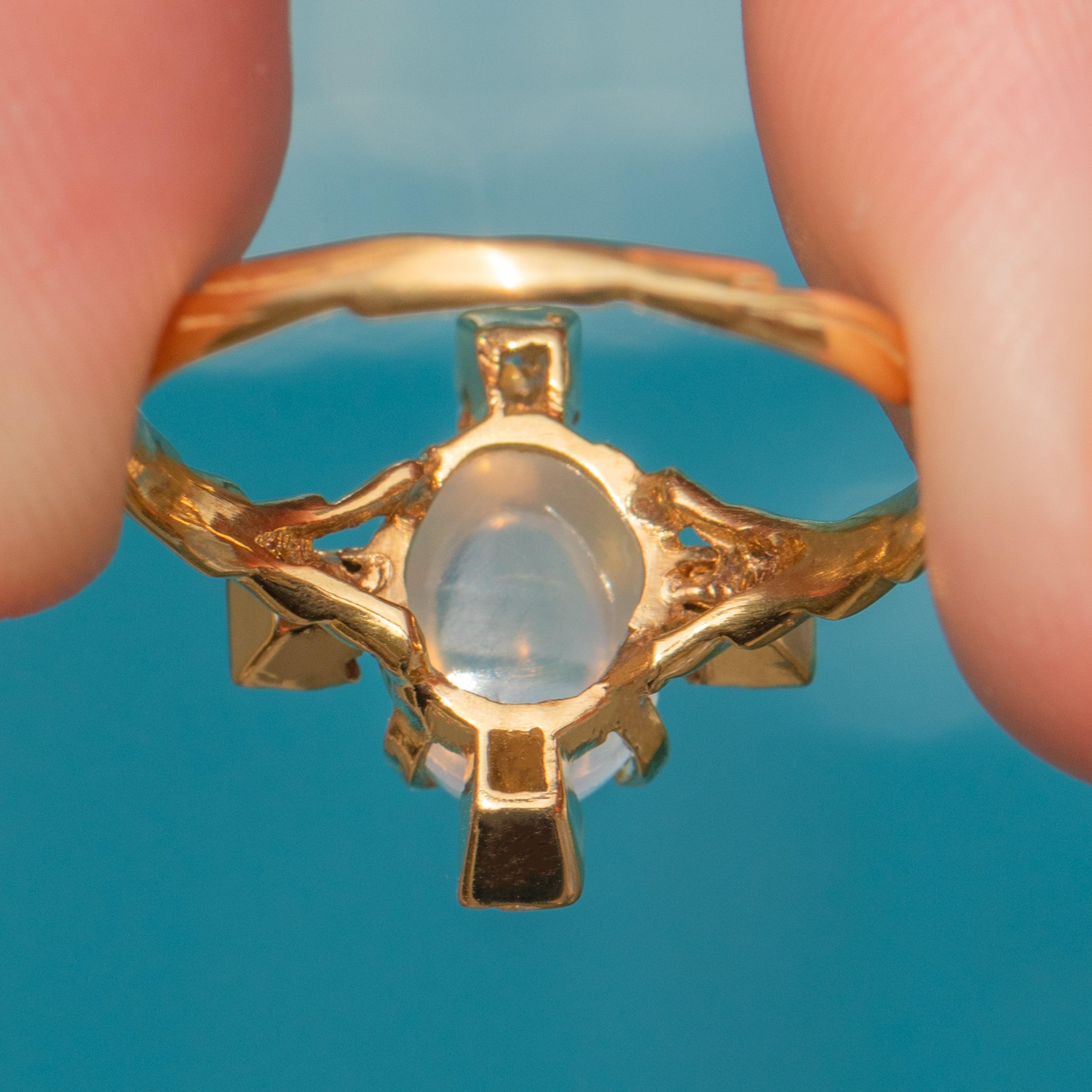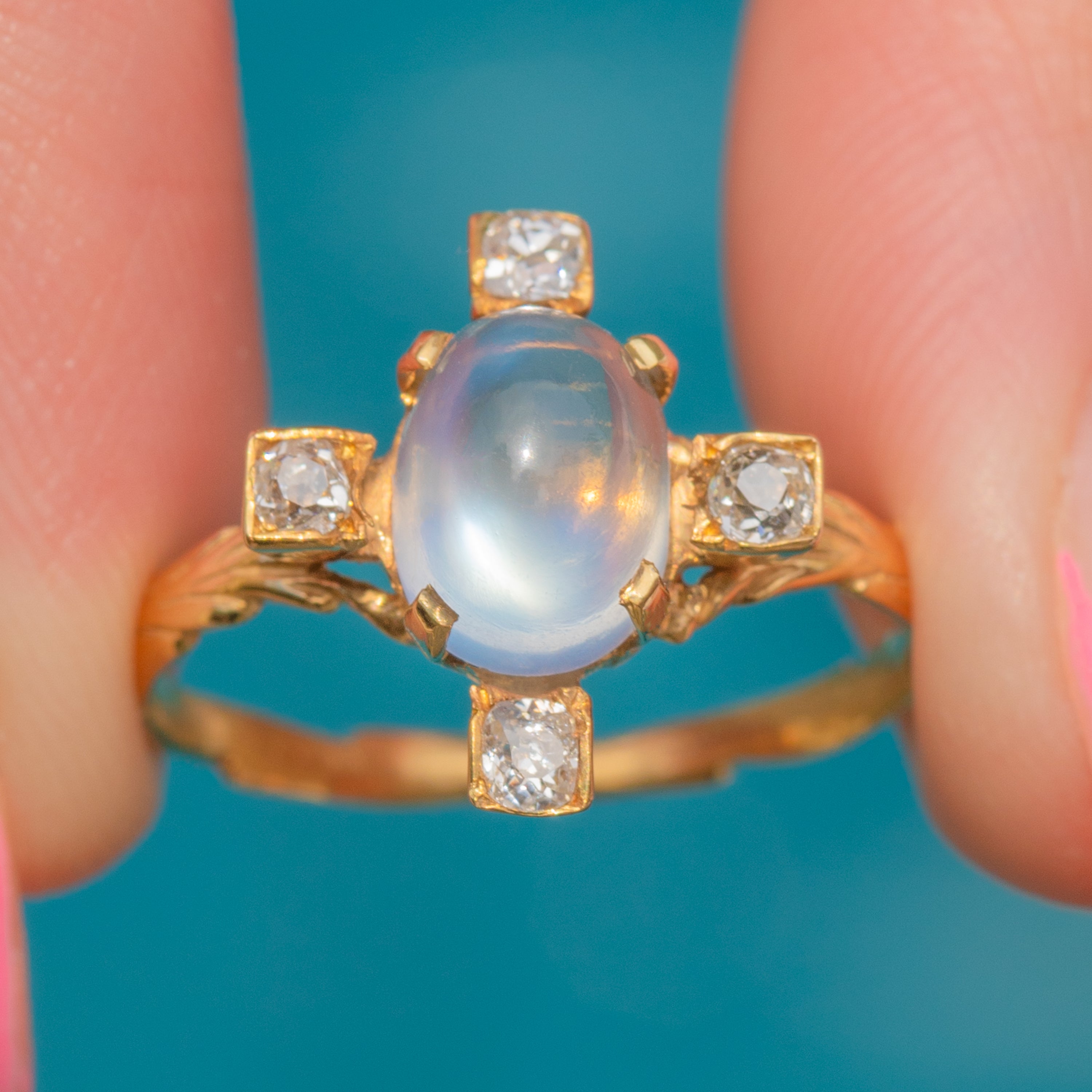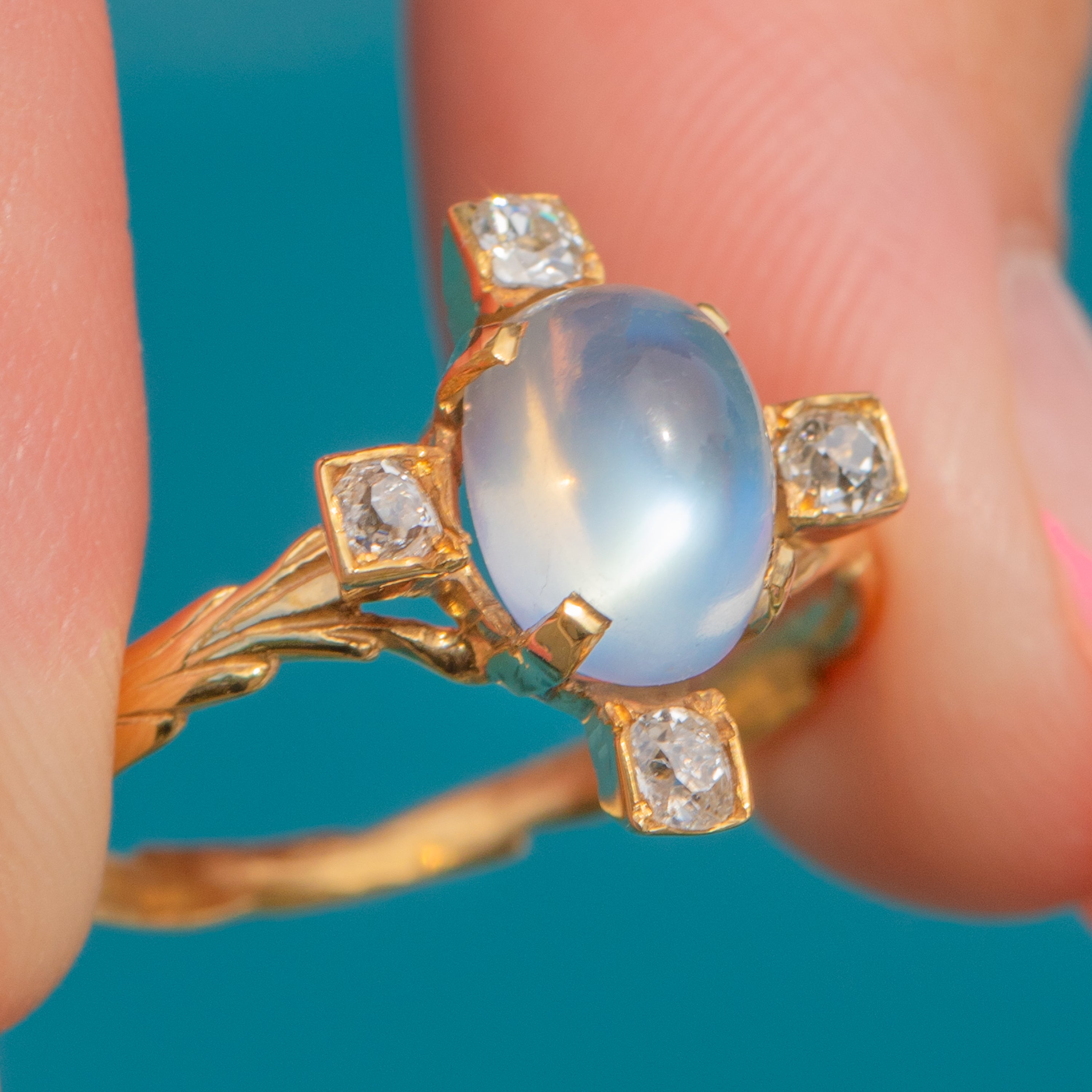 MATERIALS: Tests as 18ct Gold, Caylon Moonstone (1.92ct), Old-Mine-Cut Diamonds (0.28ct).