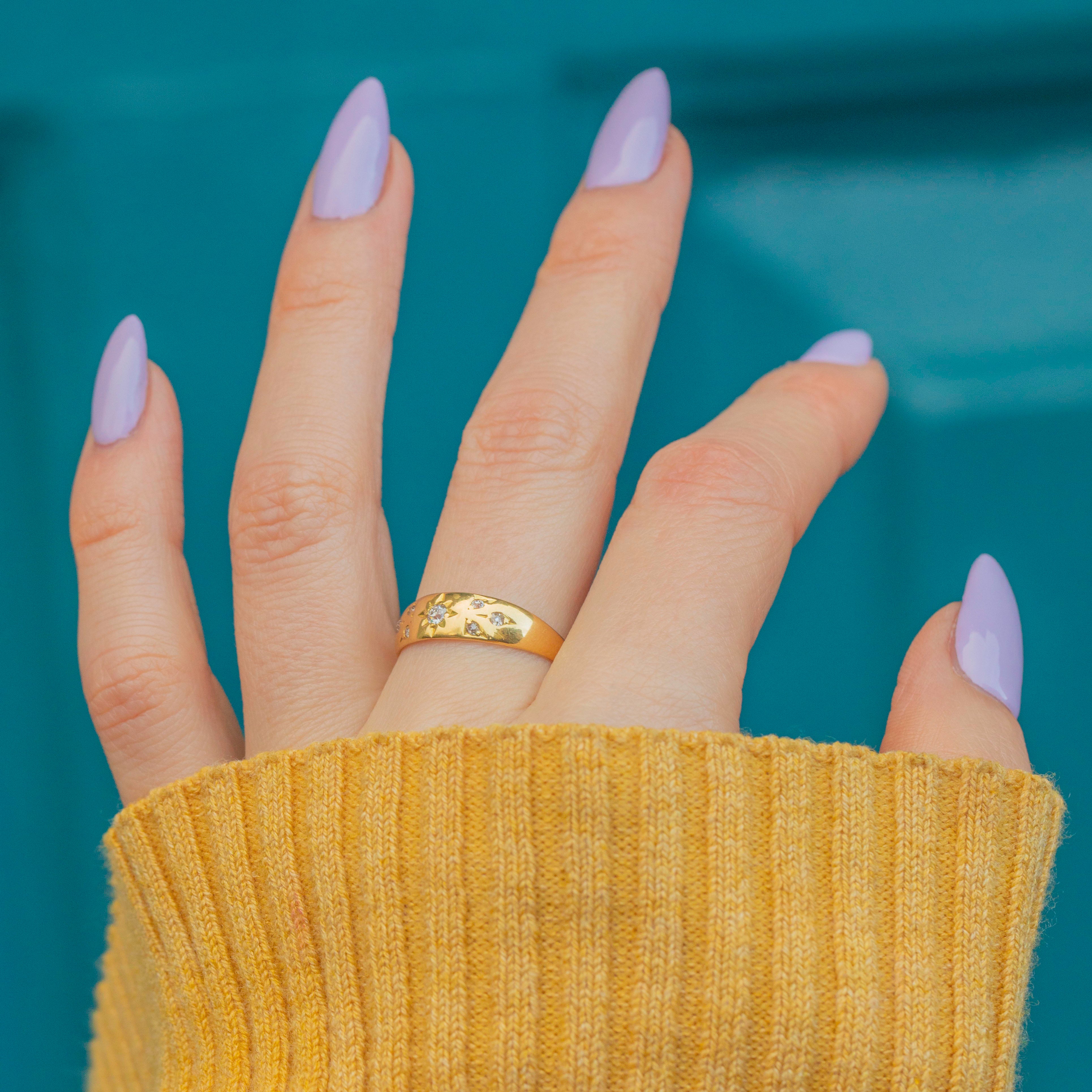 Embellished with scintillating Diamonds, she is not only easy on the eye but durable too, making her perfect for everyday wear. The star settings provide a lovely celestial finishing touch; she is bound to enchant you with her elegance for years to come!