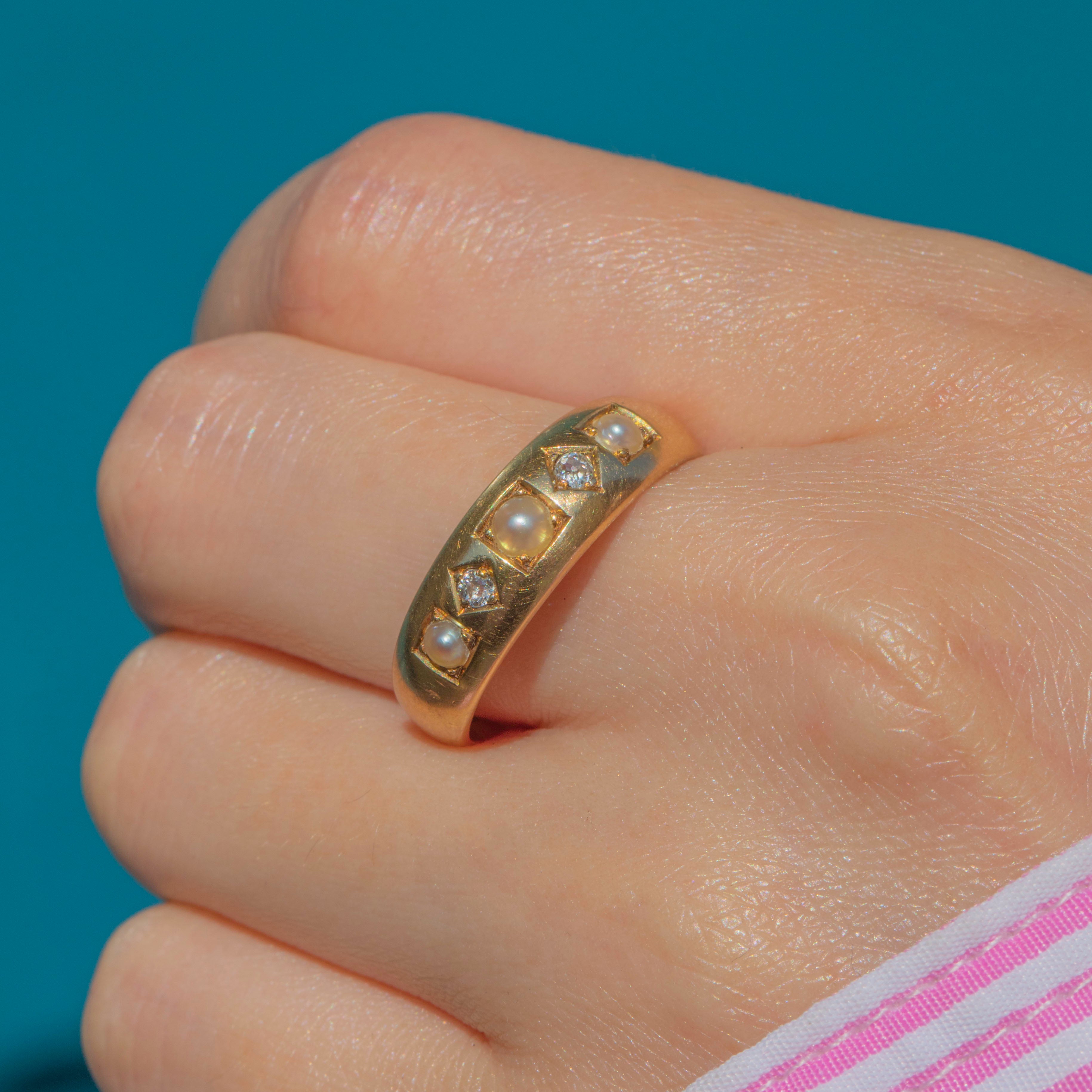 EXCELLENT: This Victorian 18ct Gold Diamond Pearl five stone gypsy ring is in excellent condition. The Gold is bright and buttery, and each of her gemstones are securely set. With little else to note, she is in brilliant condition.